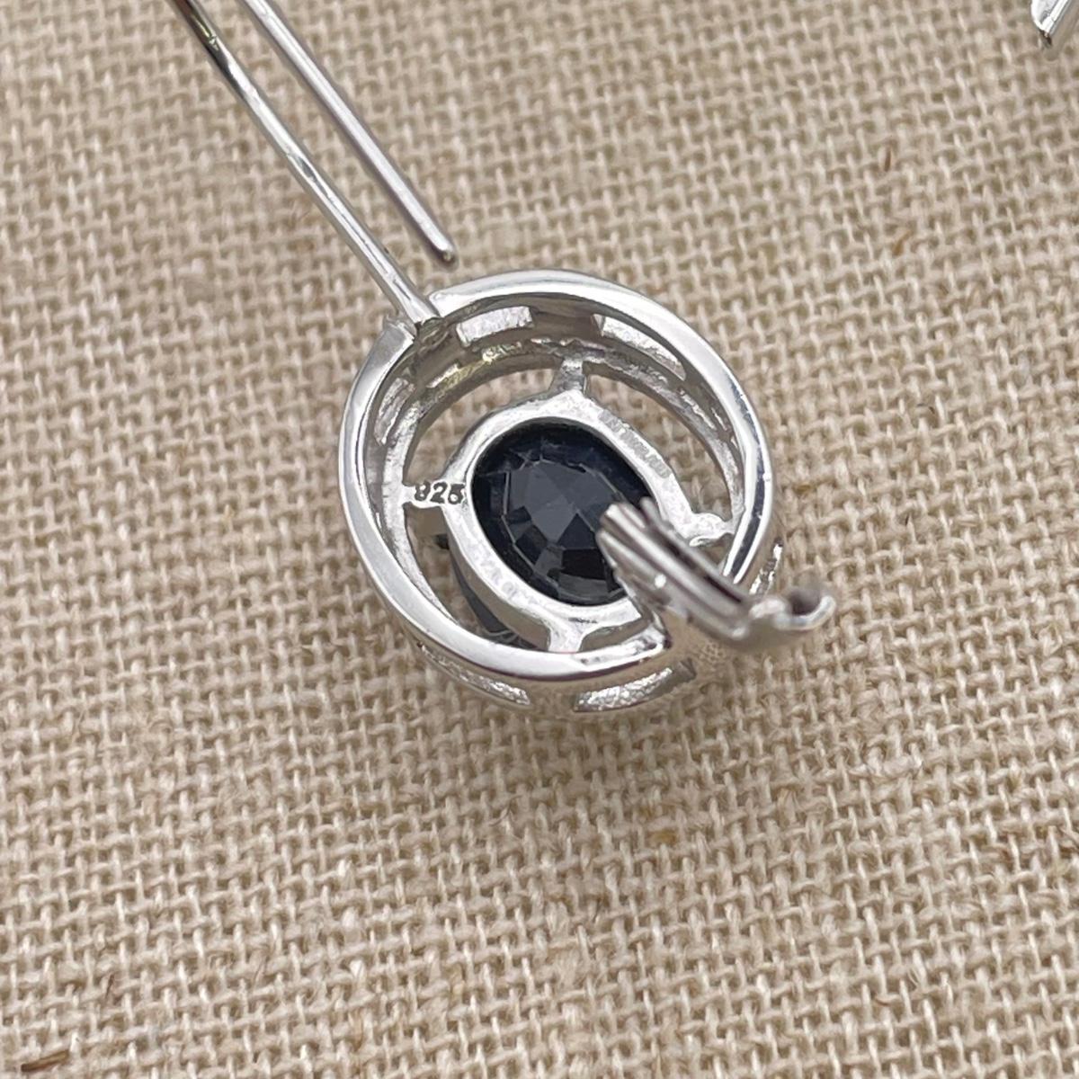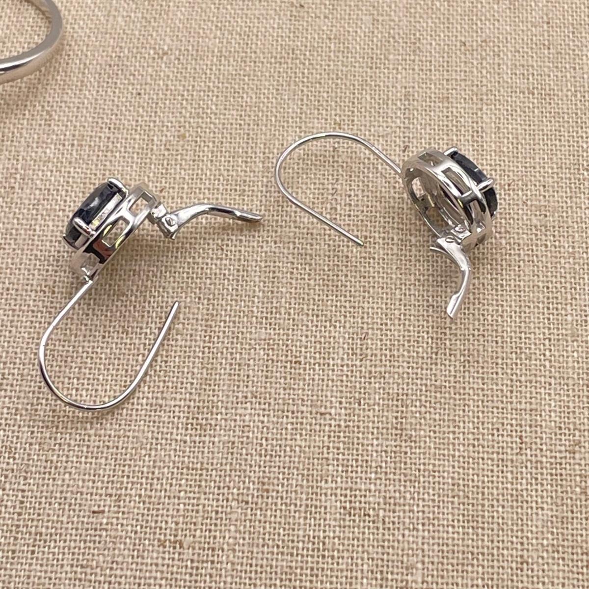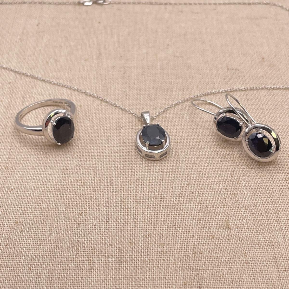 Stunning set of 925 marked earrings, ring and necklace appears to be black sapphire. Earrings dangle from pierced ears and clasp hooks. Chain also marked 925 measures 18”. See images for all markings found. We cannot guarantee the authenticity of any gemstone. All sales are final. No returns or refunds. Please bid accordingly.