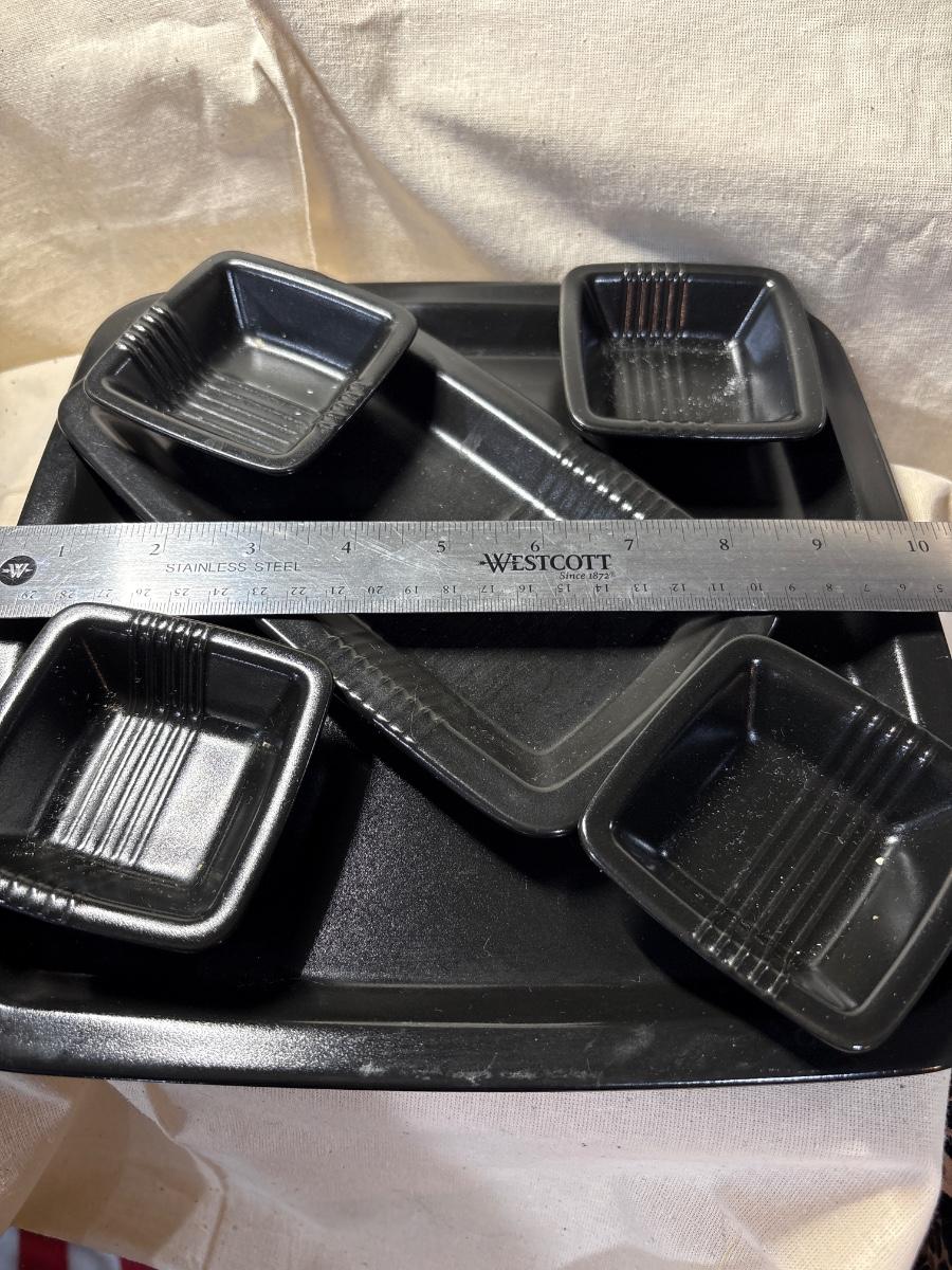 Great pieces for entertaining/enjoying. Four small nut, dip serving pieces, two trays, four napkin rings, 6 cloth napkins.