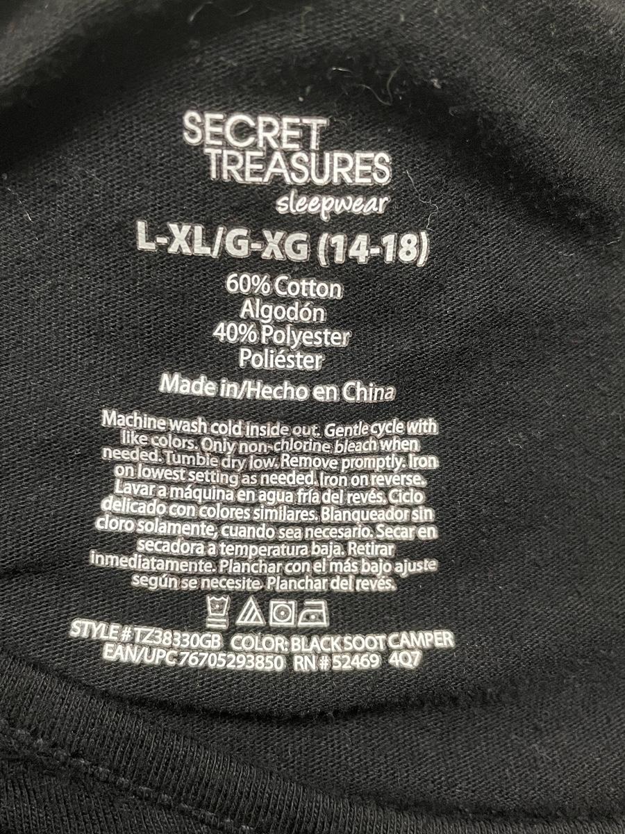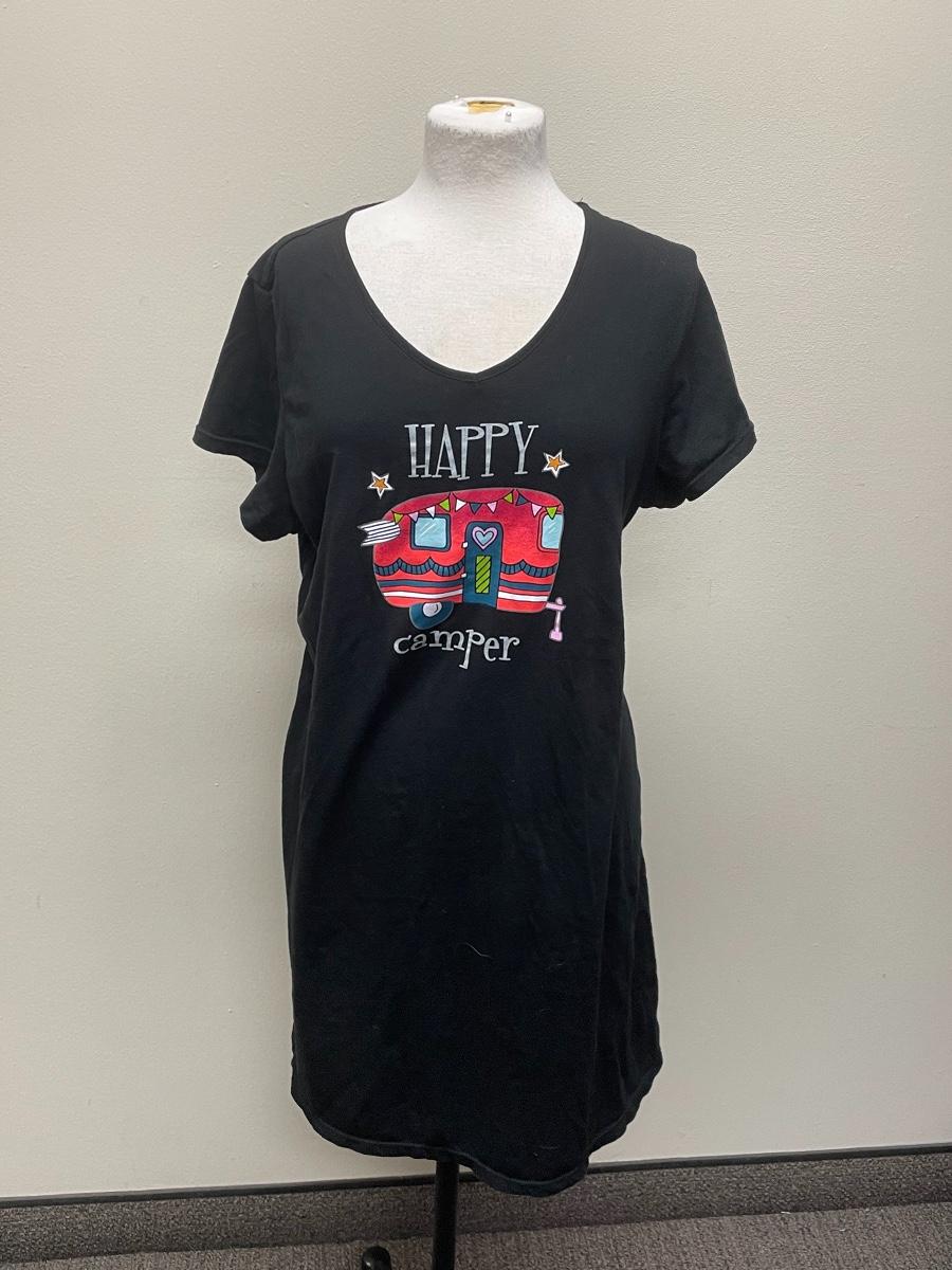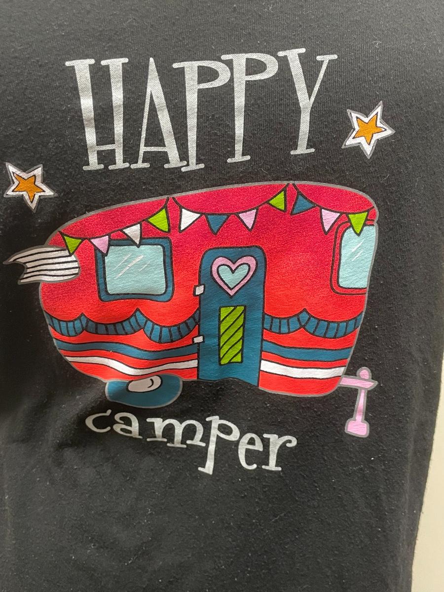 Dress in in great condition. On the front it reads: “ Happy Camper.” It comes in a size L-XL/G-XG (14-18). Shirt is made up of 60% cotton and 40% polyester.