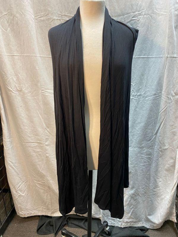 Poliana Plus black sleeveless duster vest. Probably close to knee length. Size XL. Good condition.