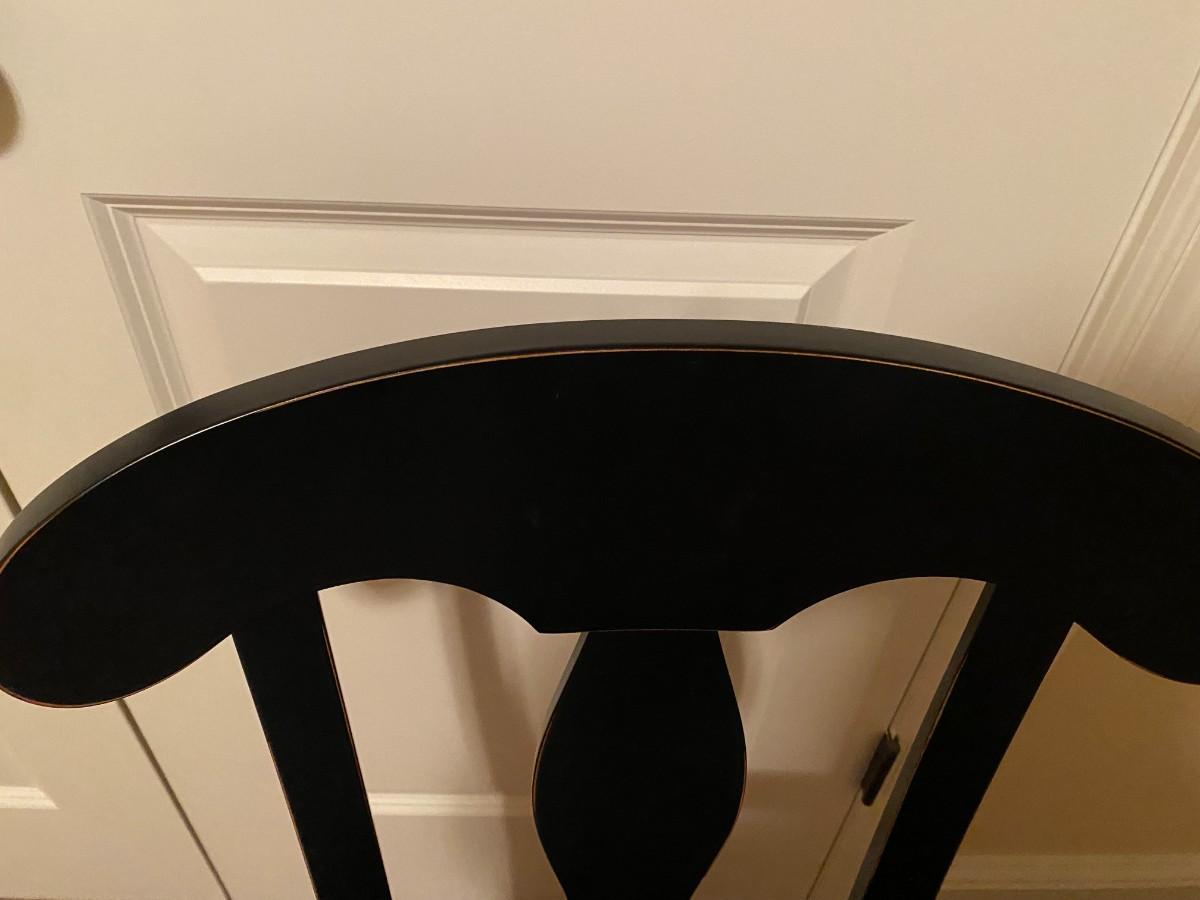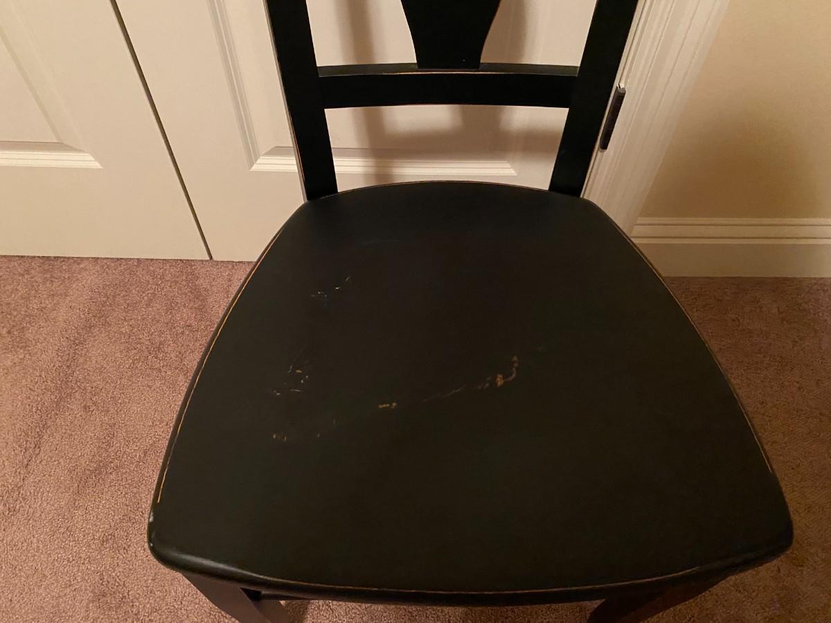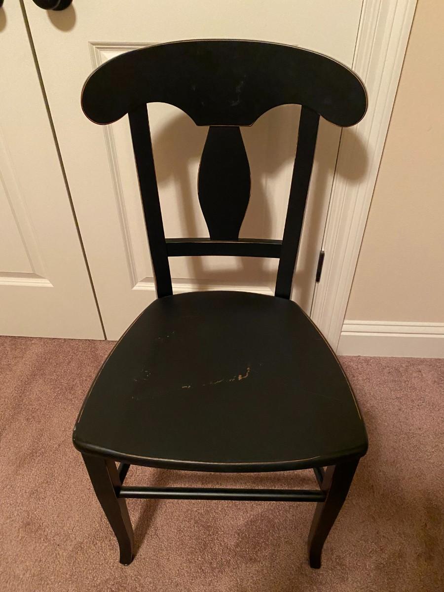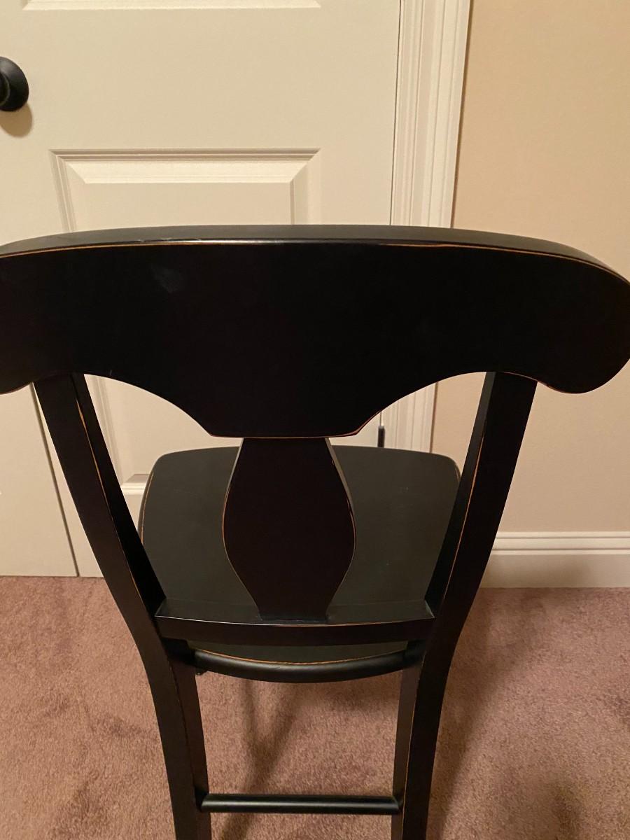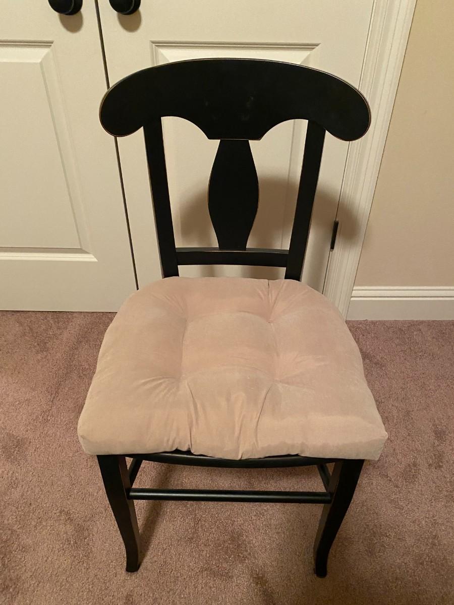 Black, slightly distressed wooden desk chair, pillow included. Very good condition with a few scratches. Chair seat is approximately 17" W x 18" H x 15" D. Chair rear side is 34-1/2" H.