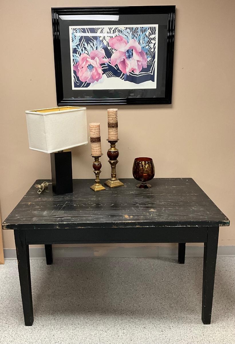 Black table (50’ x 32’), floral picture, black lamp, 2 candle stands with candles, and red and gold vase