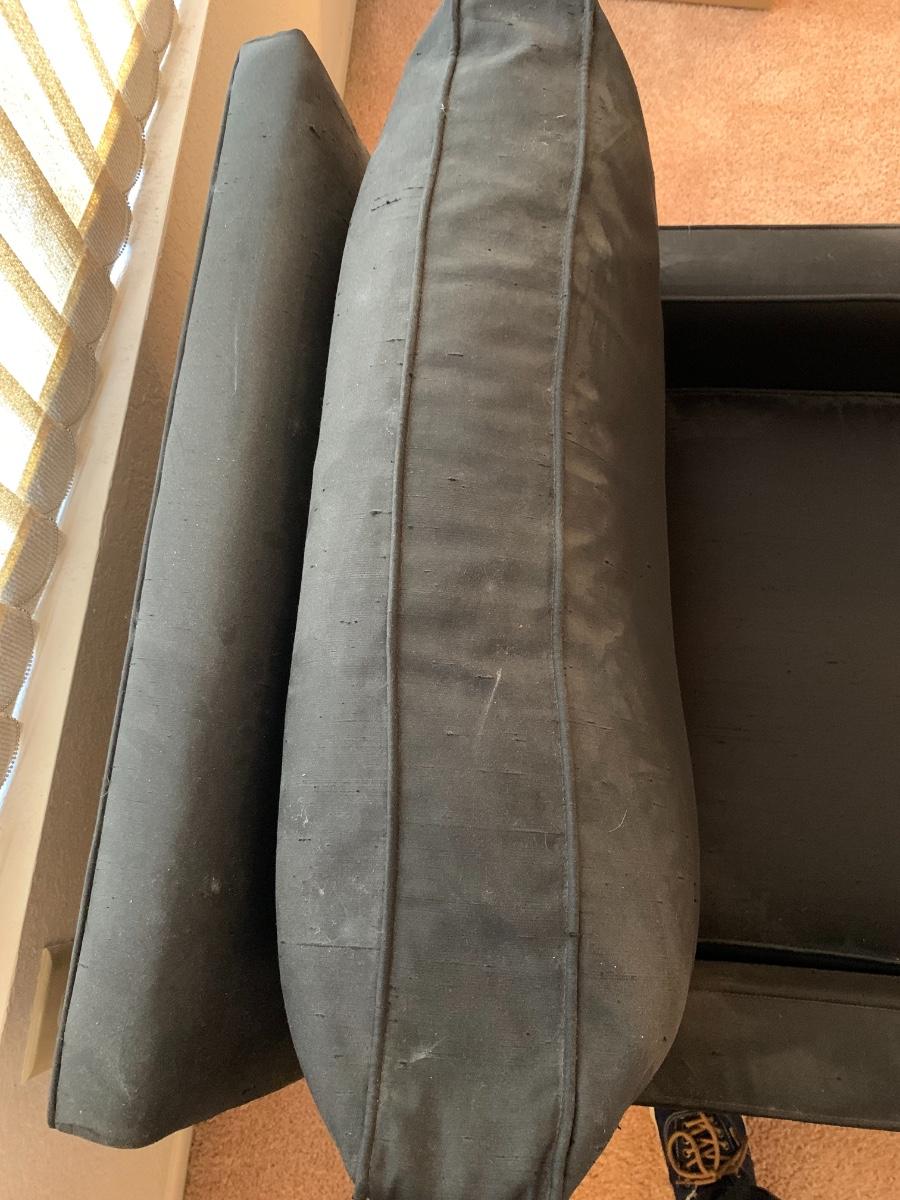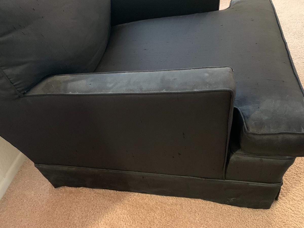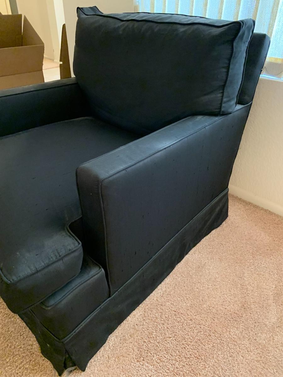 Chair is a black taffeta fabric, wide and deep comfy armchair. The chair is dusty, could use a cleaning. Back height 28” x 16” seat height x 29” wide x 24” seat depth.