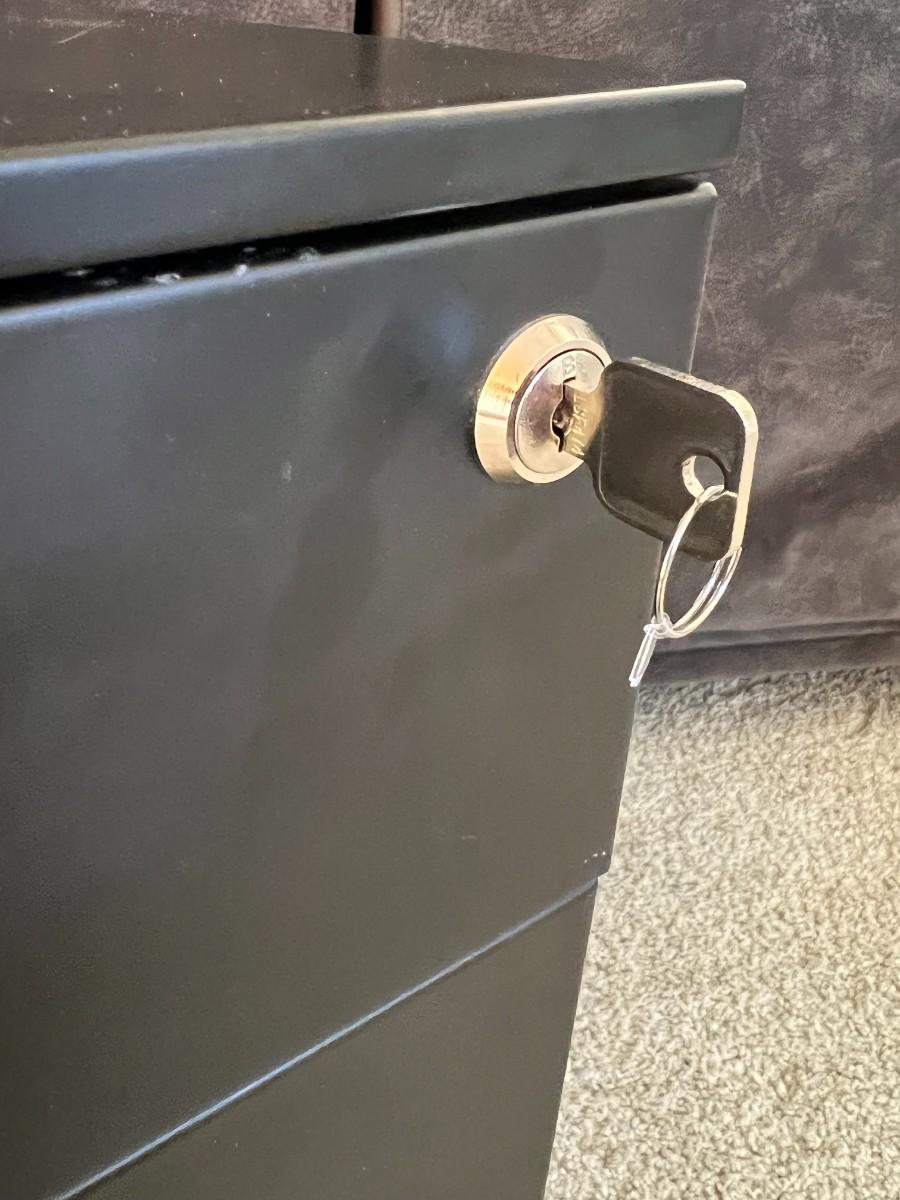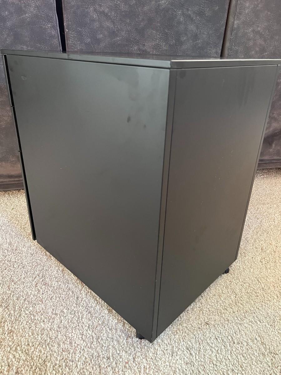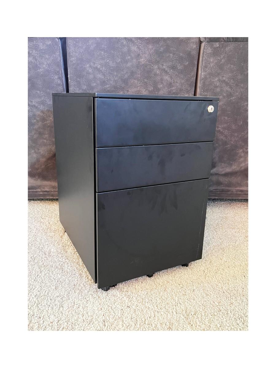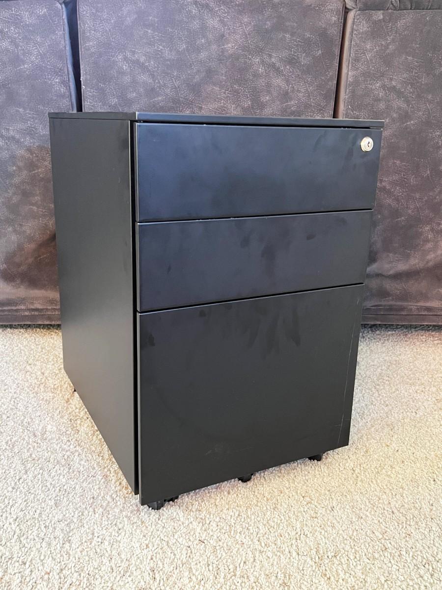 Black Three Drawer Filing Cabinet with Key. Good used condition.