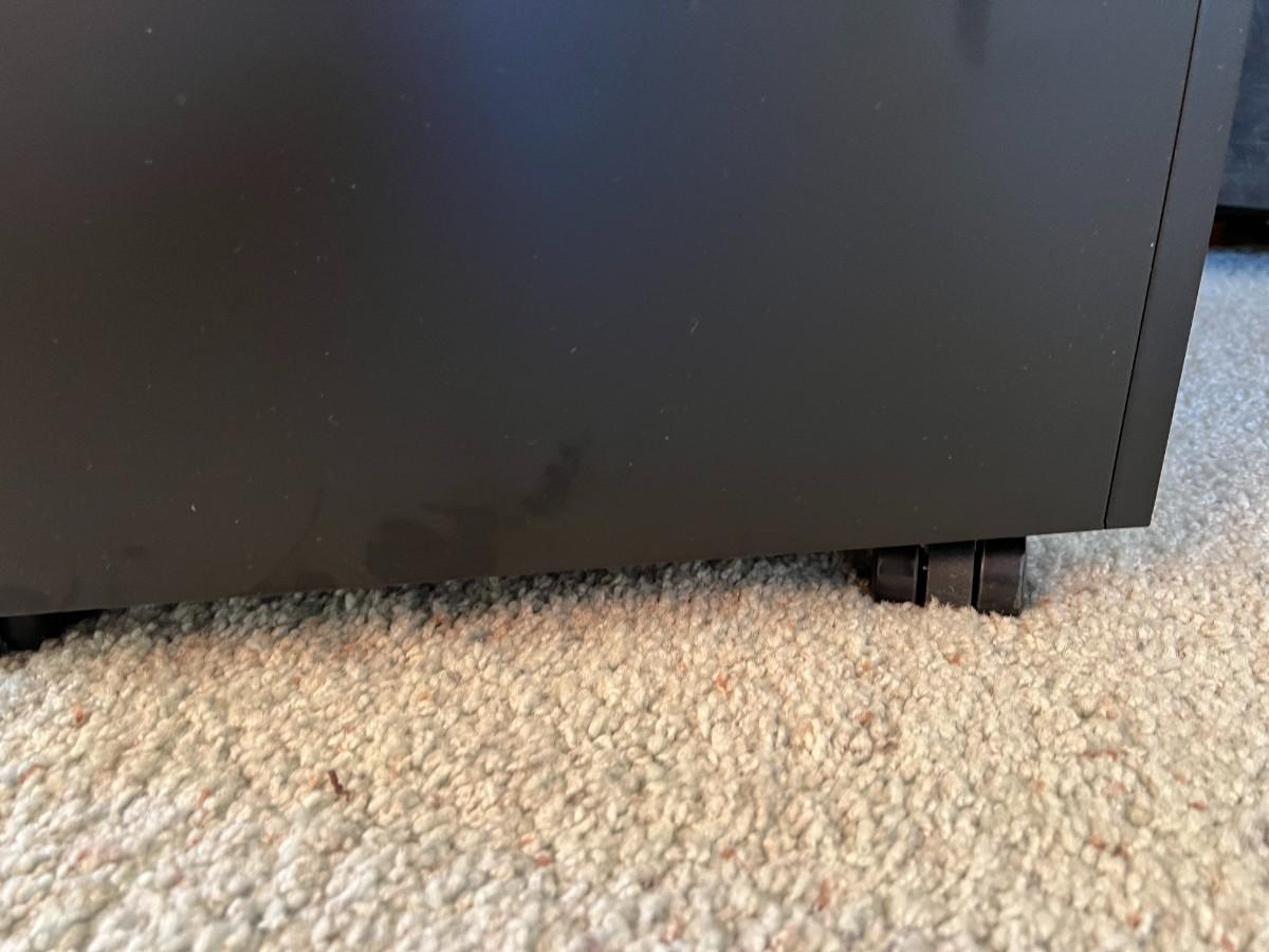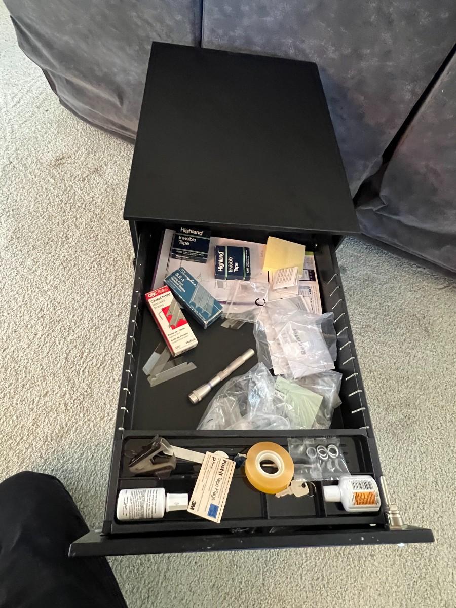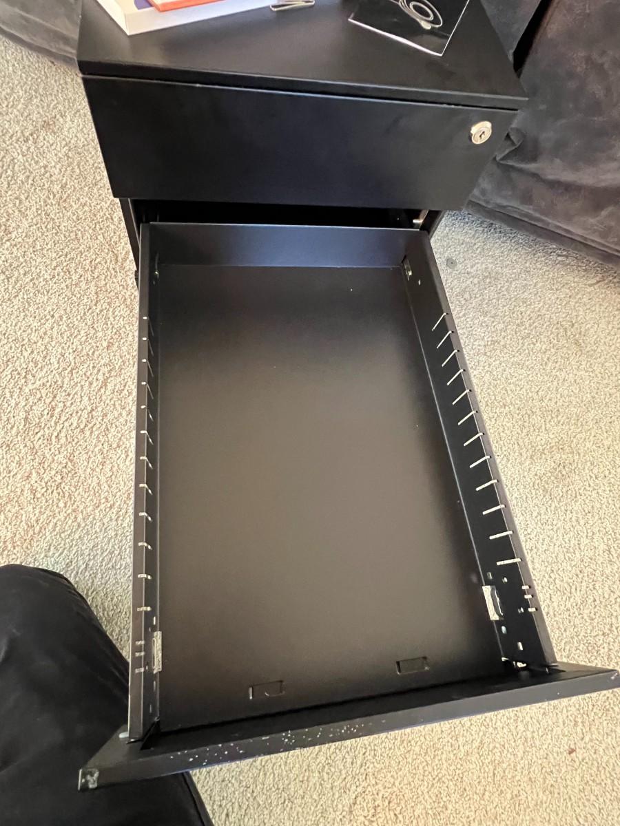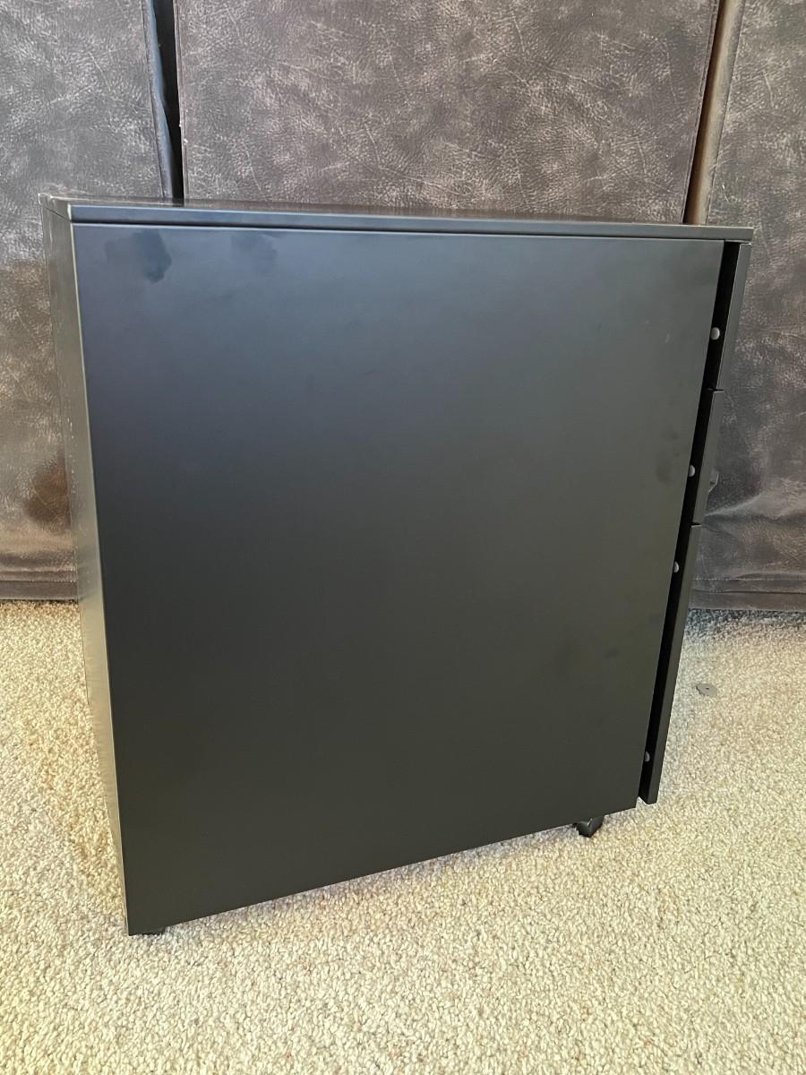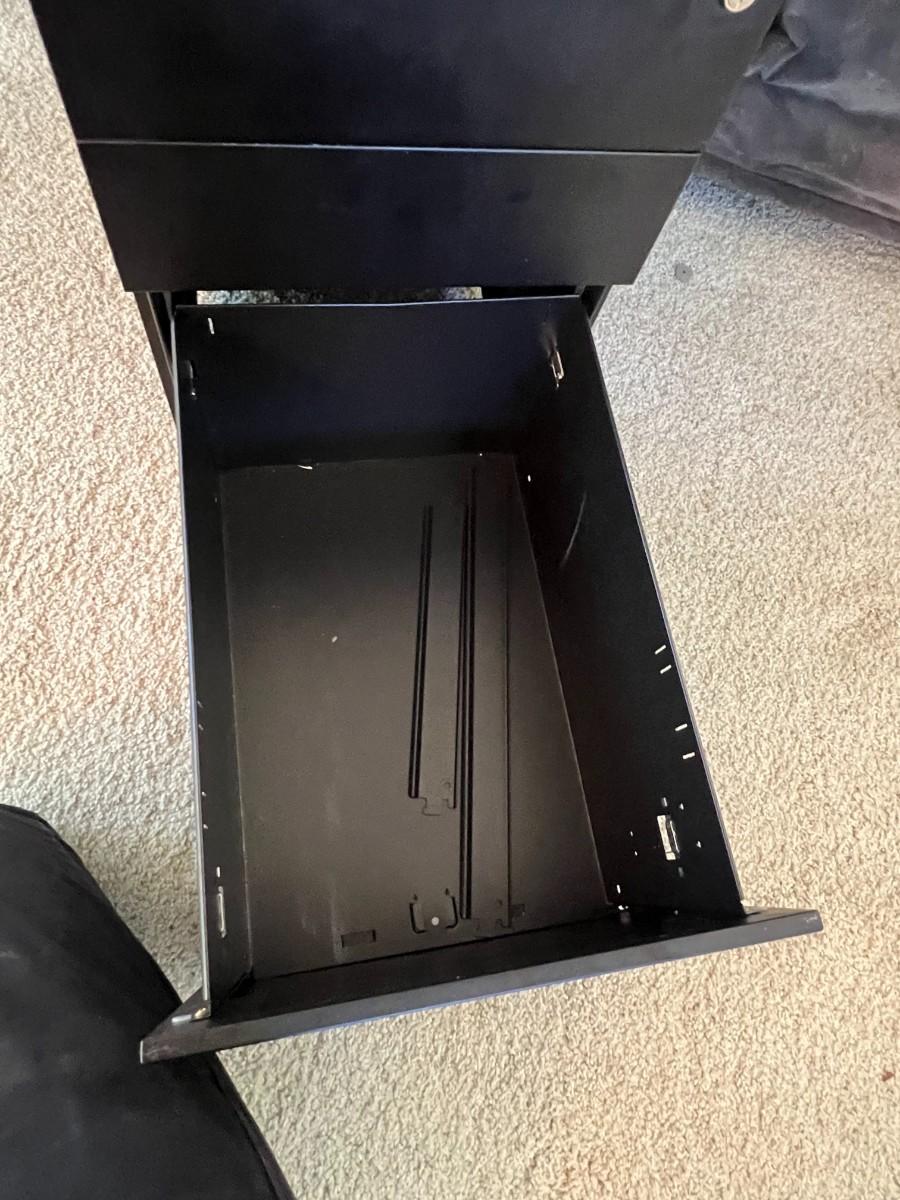 Black Three Drawer Filing Cabinet with Key. Good used condition.