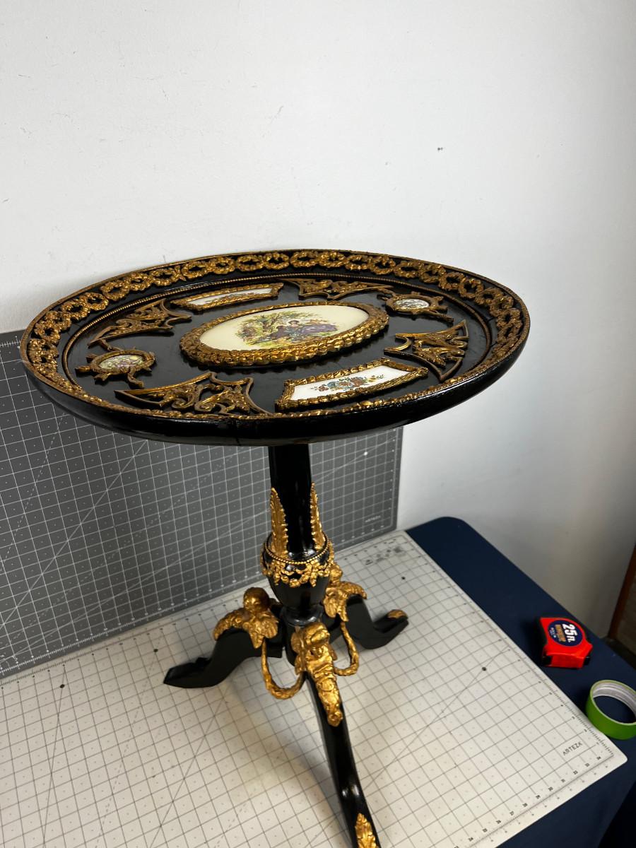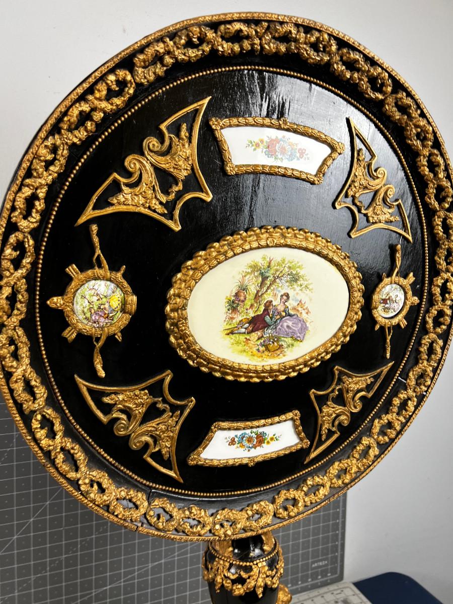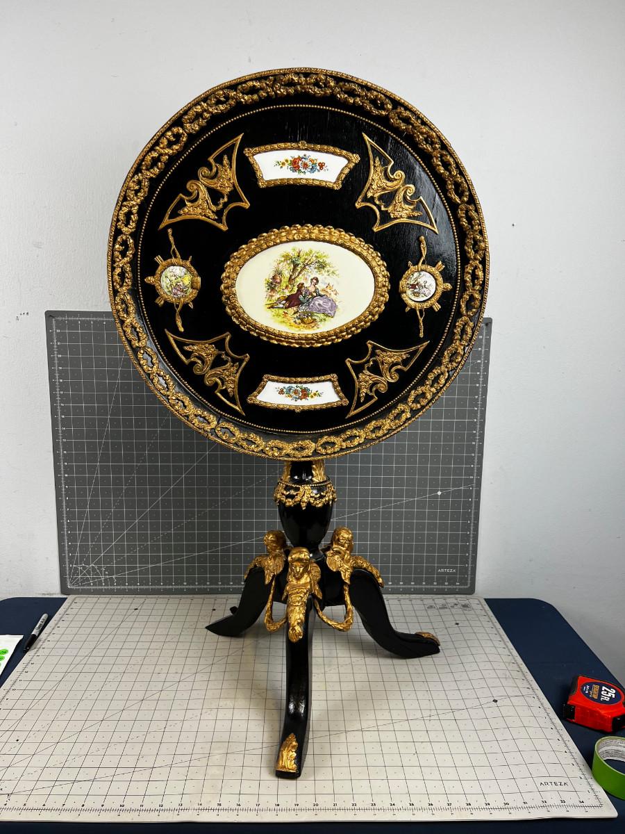 Black Top Occasional Table with  Gold Trimmed Round Top  Folding Table Dresden Hand Painted Tiles, UNIQUE!