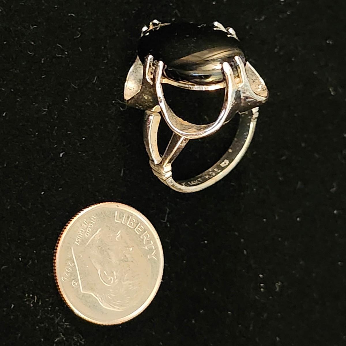 White gold, fancy setting, signed. Size is 3 3/4 to 4, can be resized.