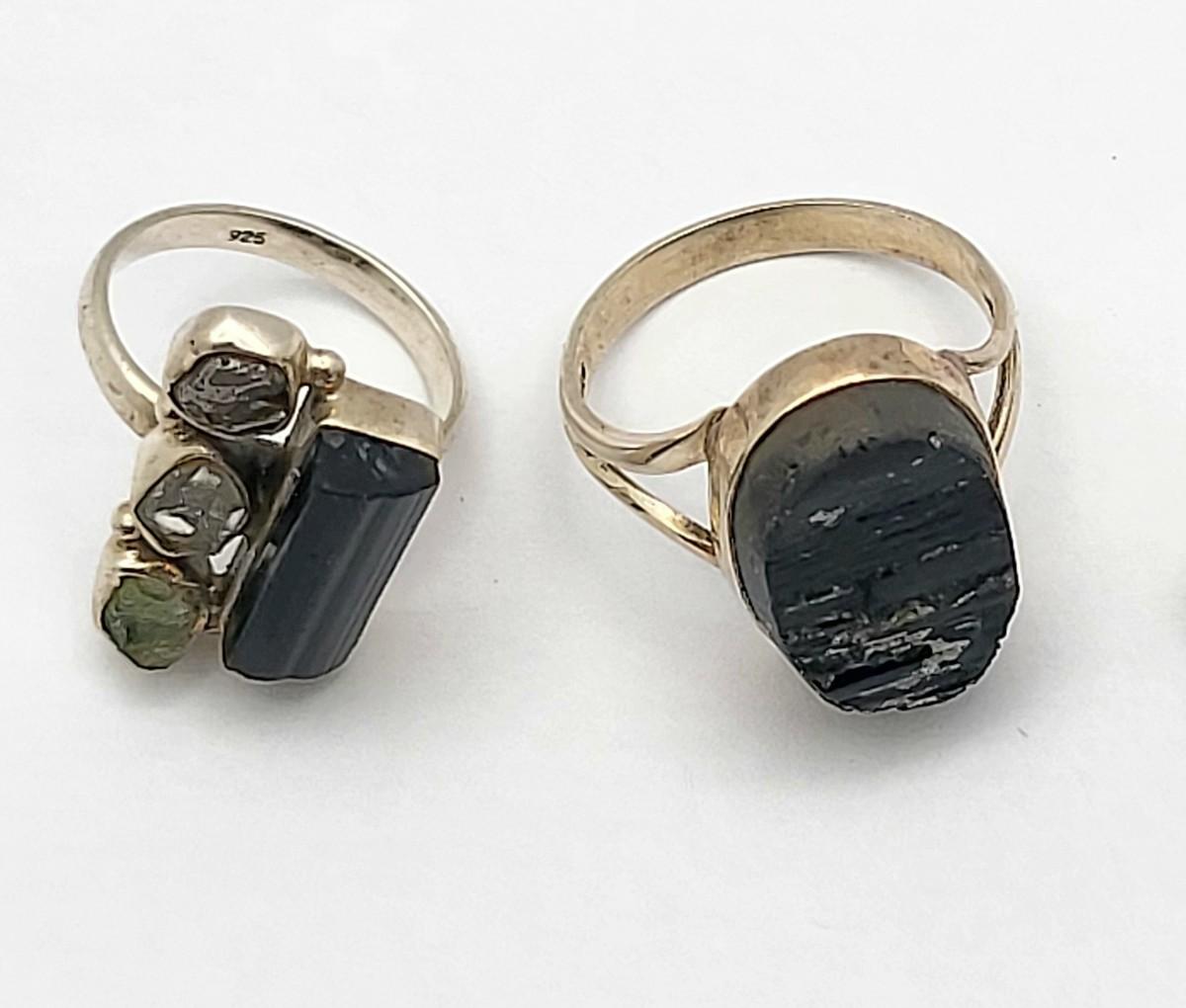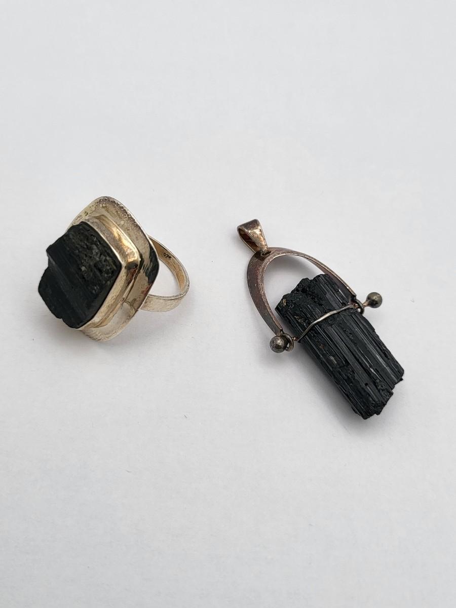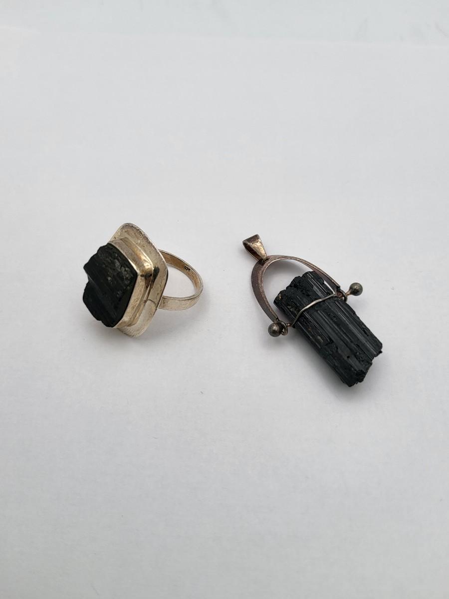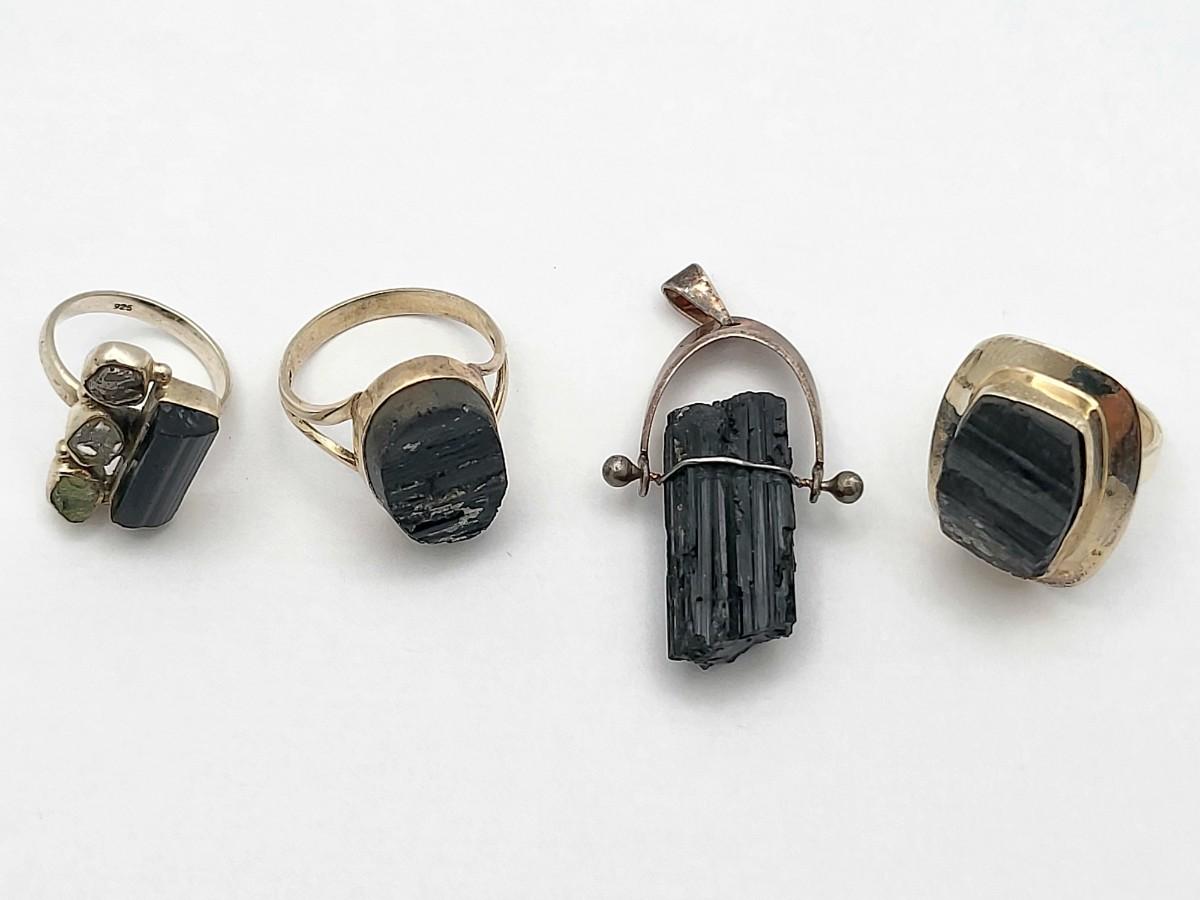 Four pieces vintage, rough black tourmaline jewelry 925 sterling silver: Rectangle ring size 9. Specimen set in a unique artisan swing pendant, appears to be silver plated. Rectangle Tourmaline with 3 transparent Tourmalines in hand made setting size 6. Oval Tourmaline ring size 11.