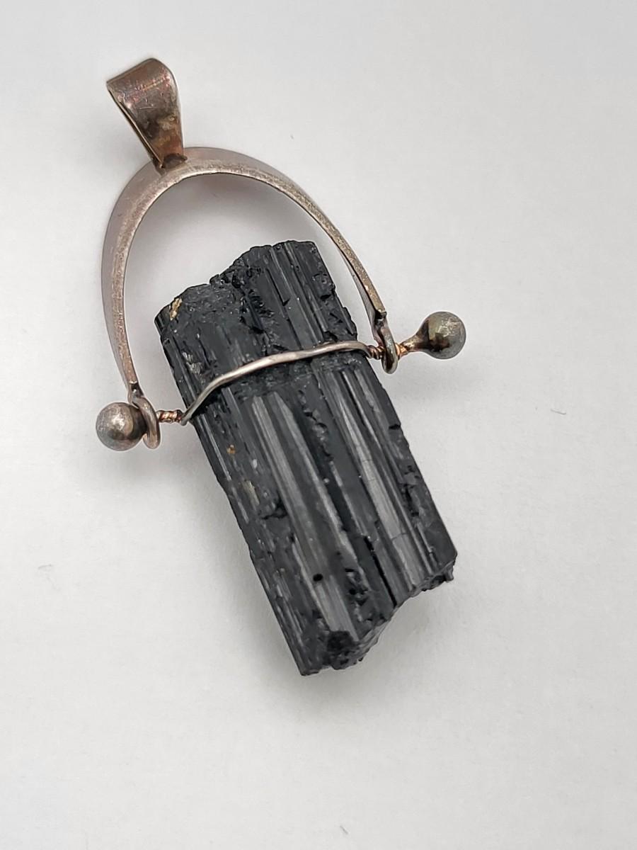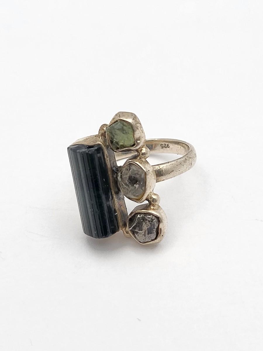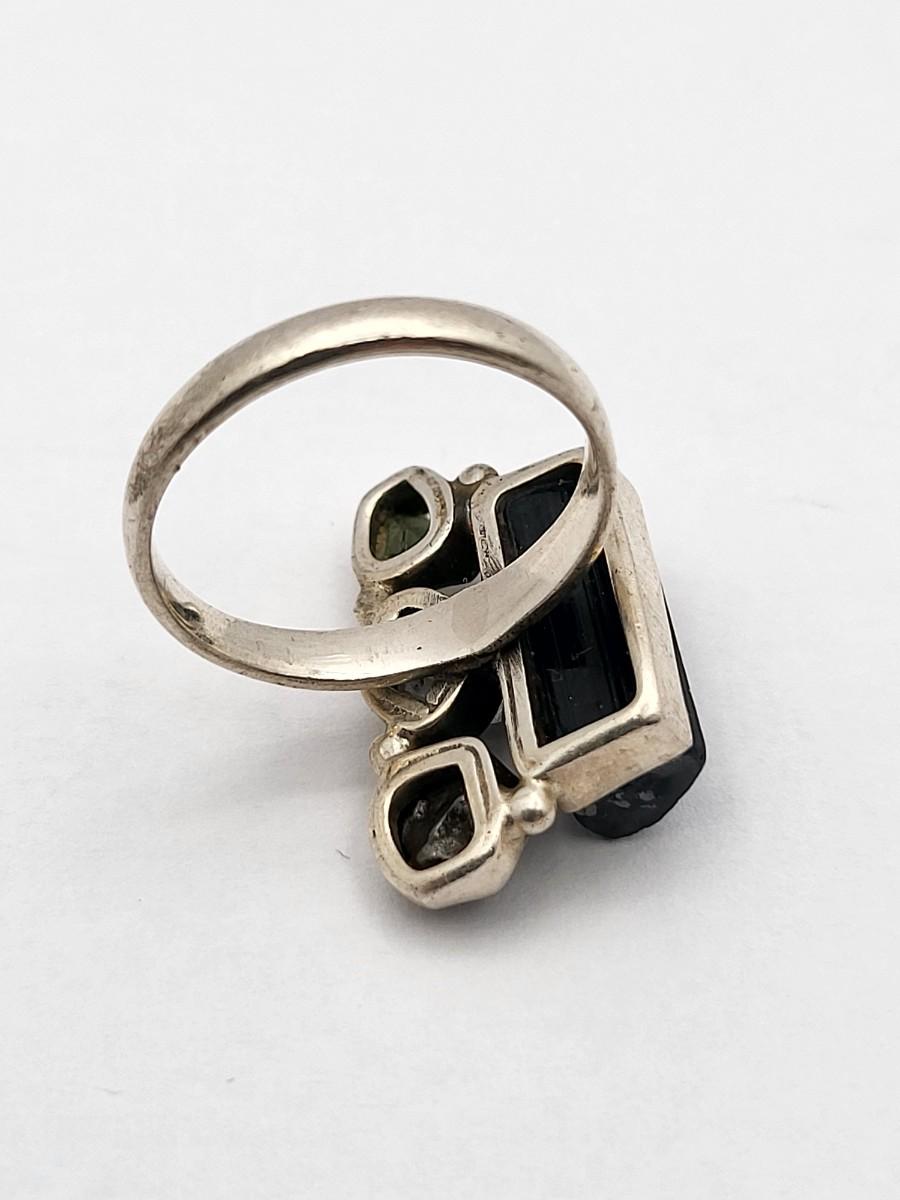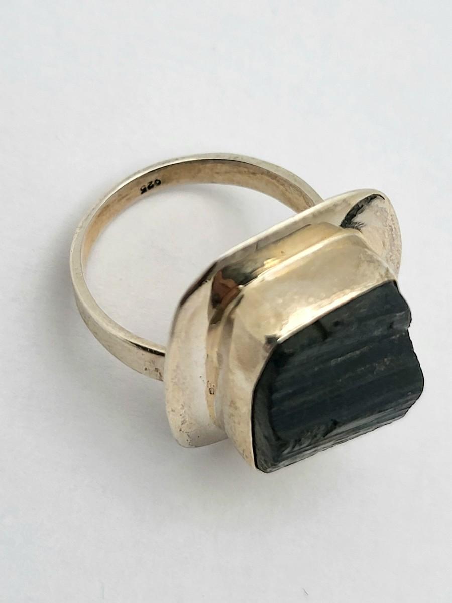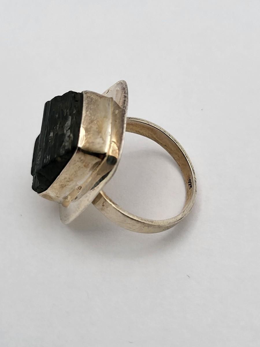 Four pieces vintage, rough black tourmaline jewelry 925 sterling silver: Rectangle ring size 9. Specimen set in a unique artisan swing pendant, appears to be silver plated. Rectangle Tourmaline with 3 transparent Tourmalines in hand made setting size 6. Oval Tourmaline ring size 11.