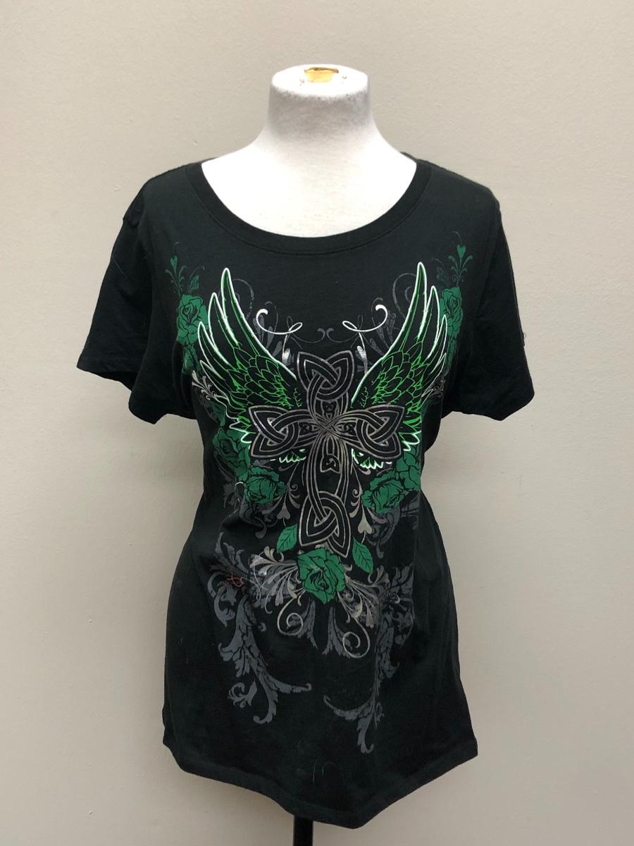 Black T-Shirt with Cross and Angel Wings Design