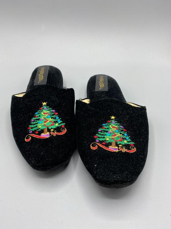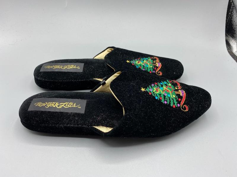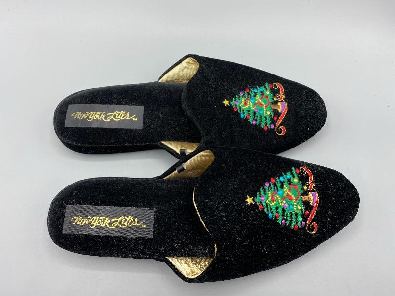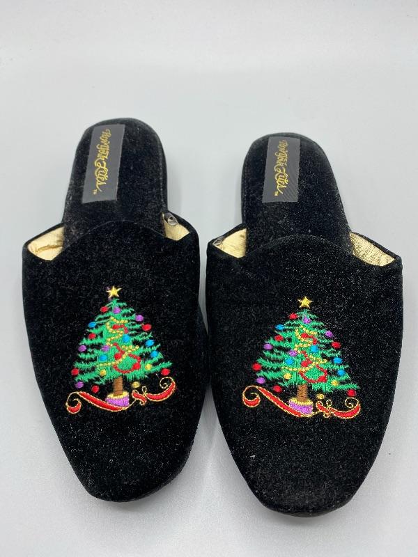 Black velvet slip on style slippers. Colorful Christmas tree embroidered on the top. Size medium (7), they look like they might run small. Previously worn but in good condition. Made by New York Lites.