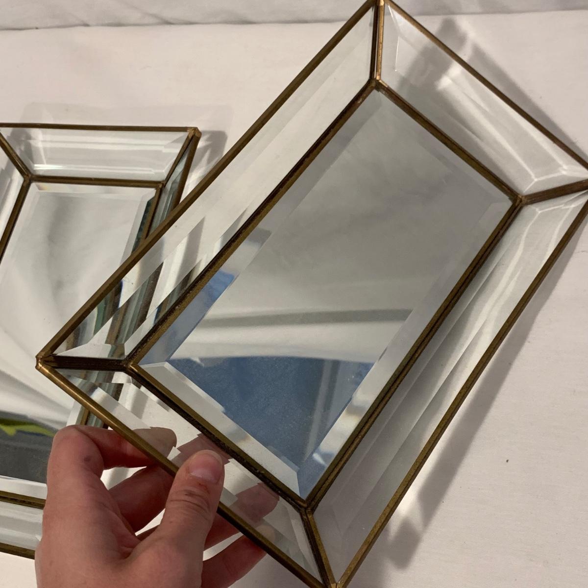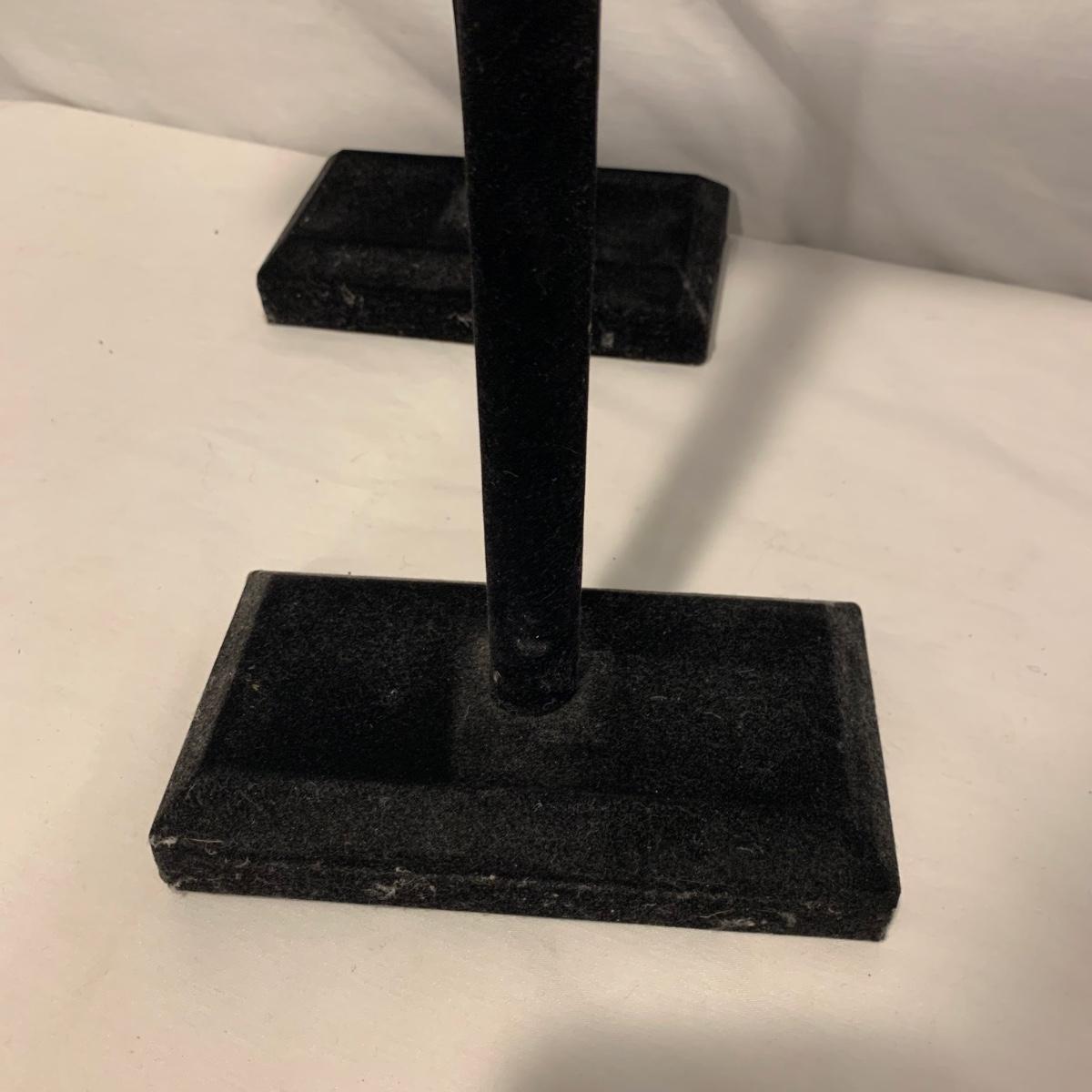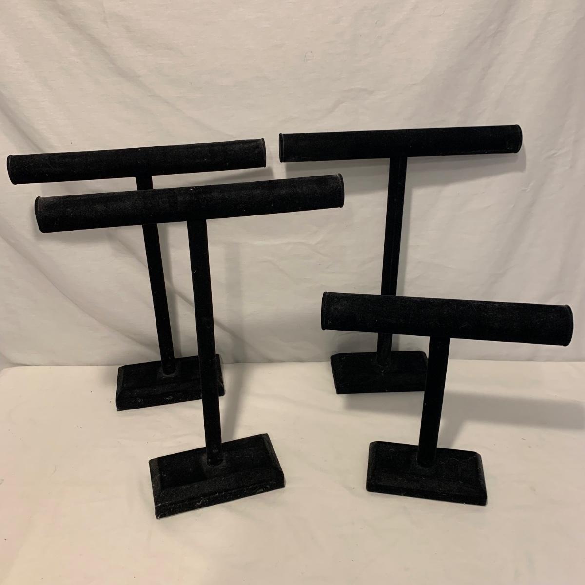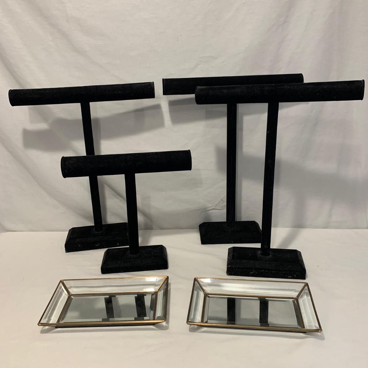 Four black velvet T-bar jewelry display racks. Three are approximately 14” x 18”H and the other one is 12.25” x 12”H. They have some fuzz and dust on them and need to be cleaned; a lint roller should do the trick. Also included are two glass trays with golden metal rims and mirror bottoms. They are 10” x 6”.