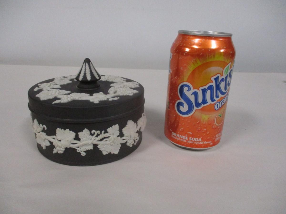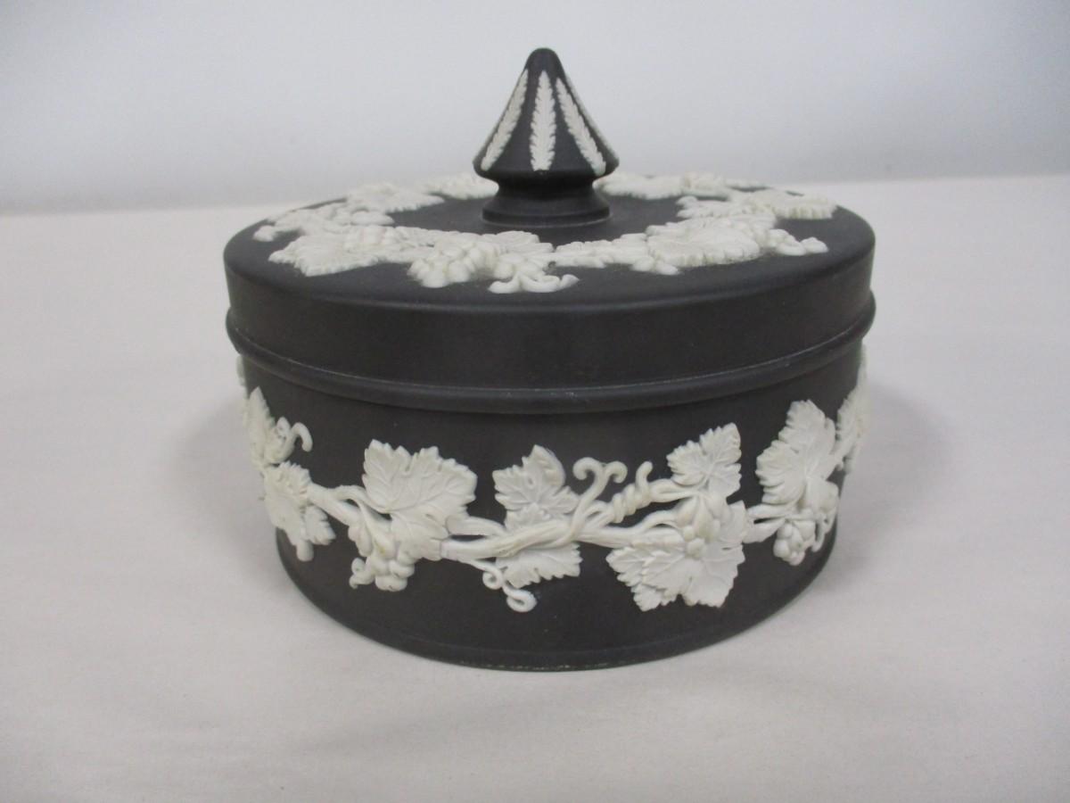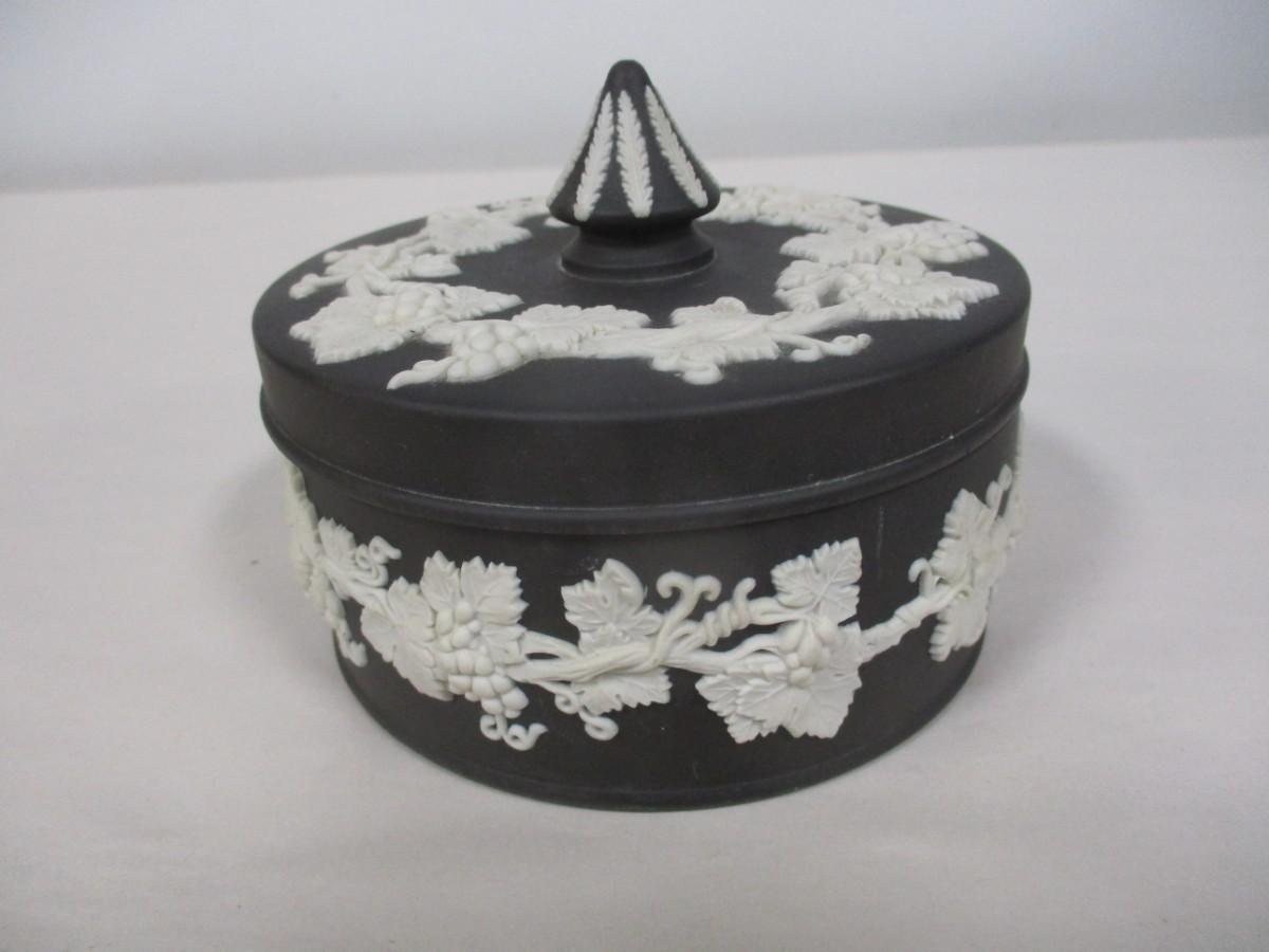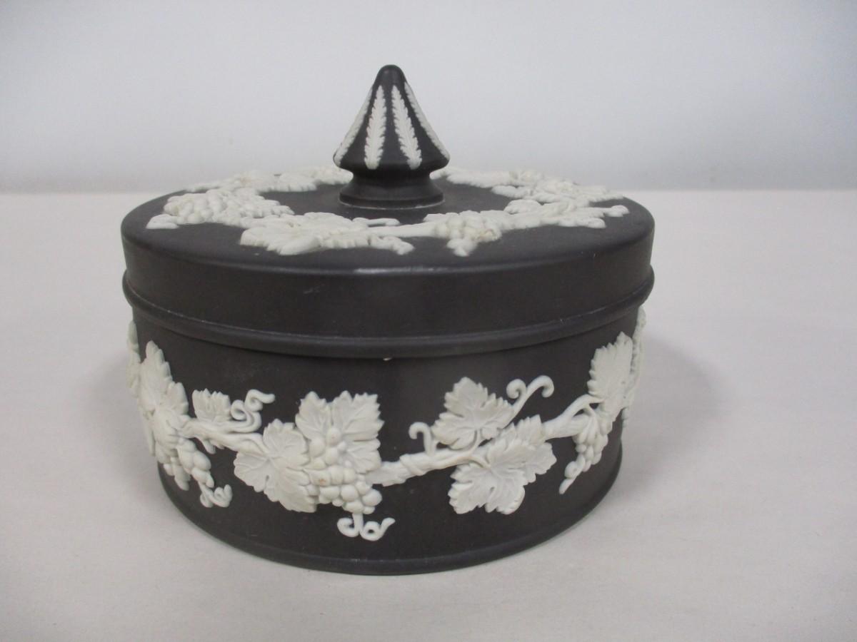 Black Wedgewood Jasperware Covered Candy Dish With White Grapevine Trim