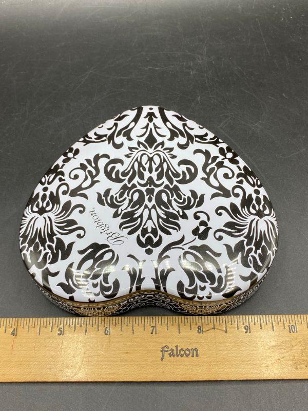 Black & white Brighton jewelry tin. Heart shape, about 6" size.