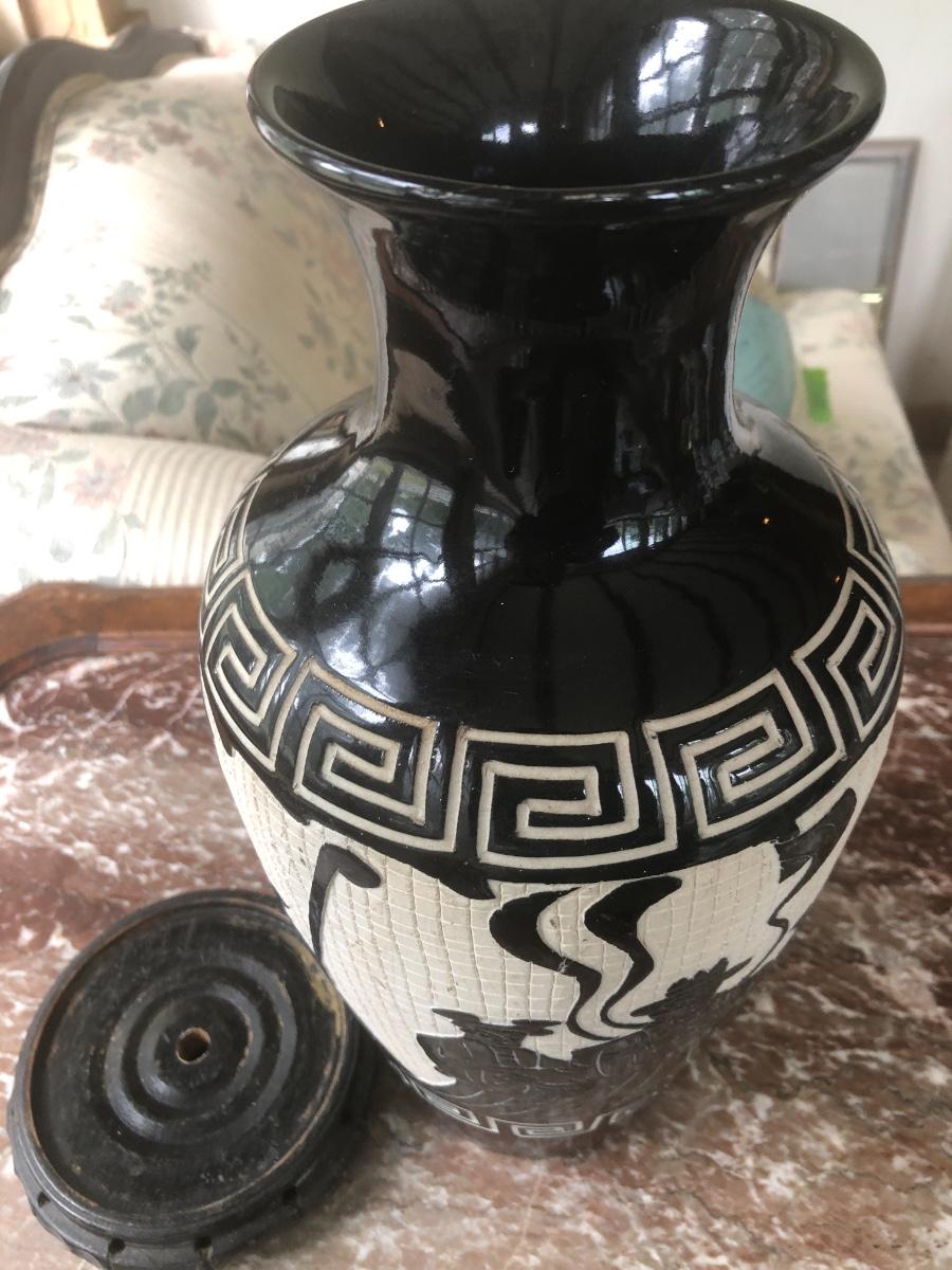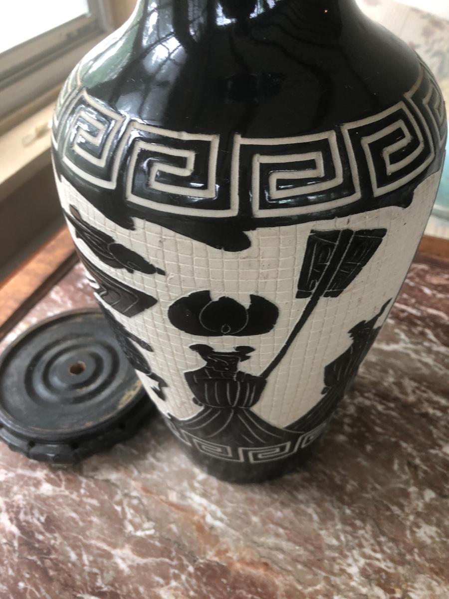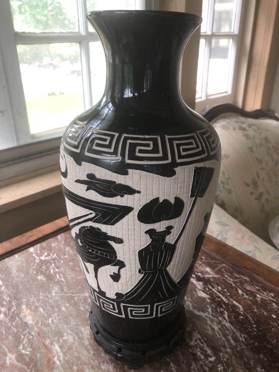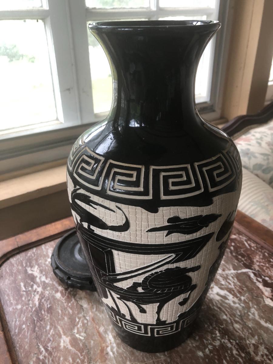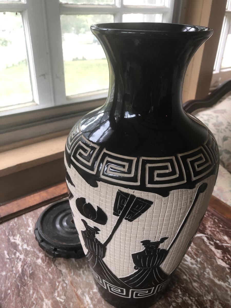 Black & White Greek Key Accented Vase w/ Vintage Wooden Stand -Lot 212