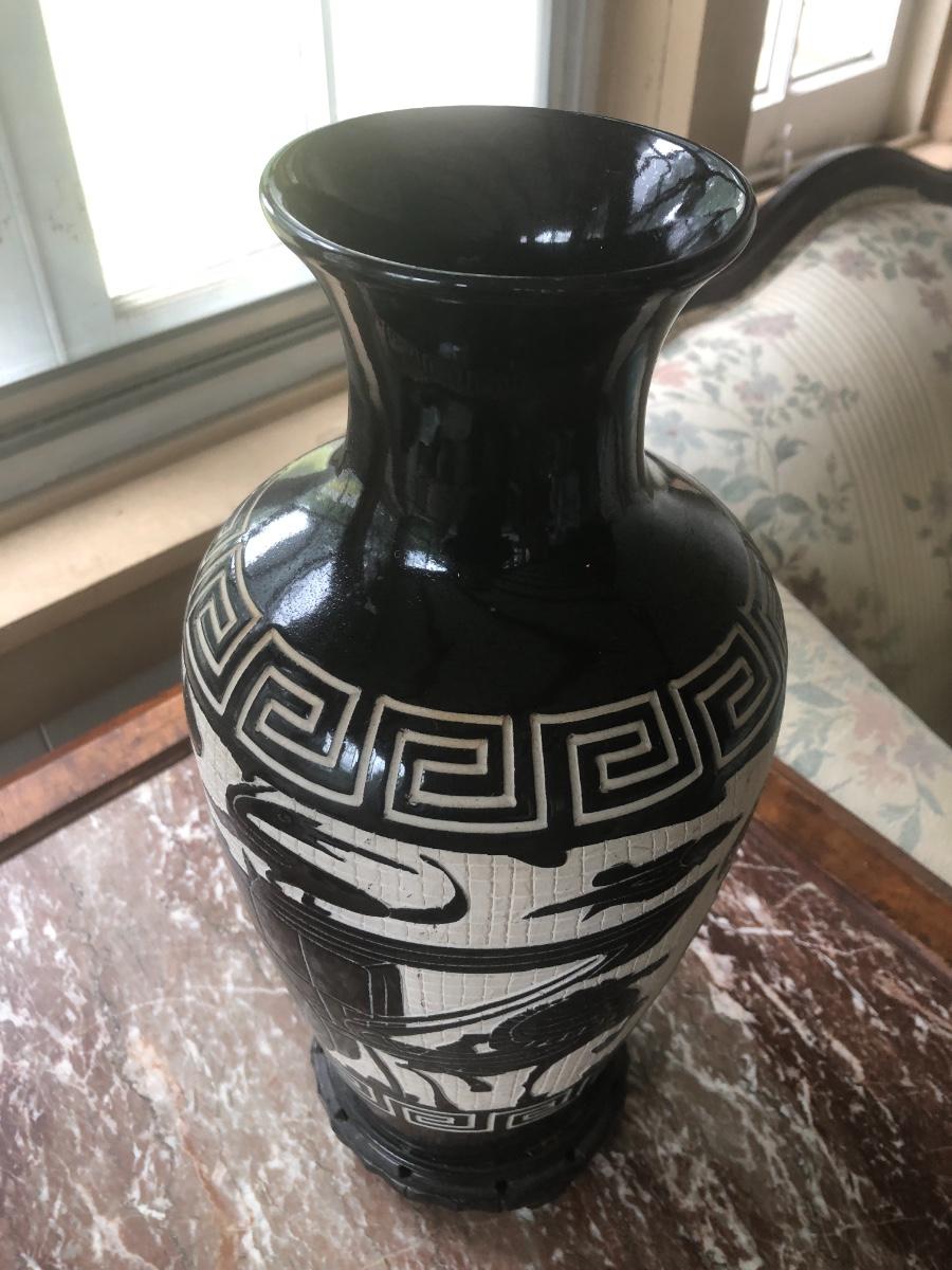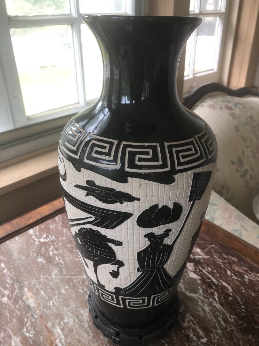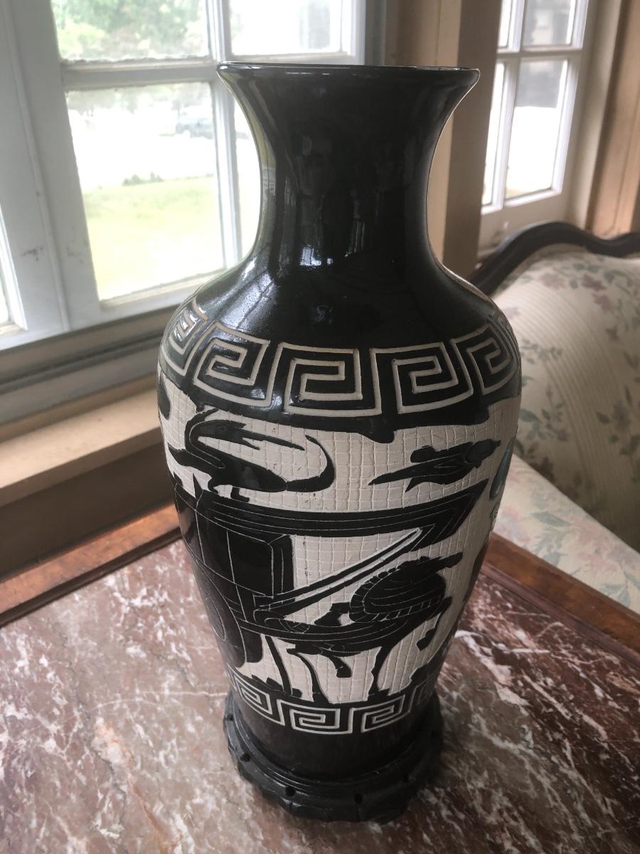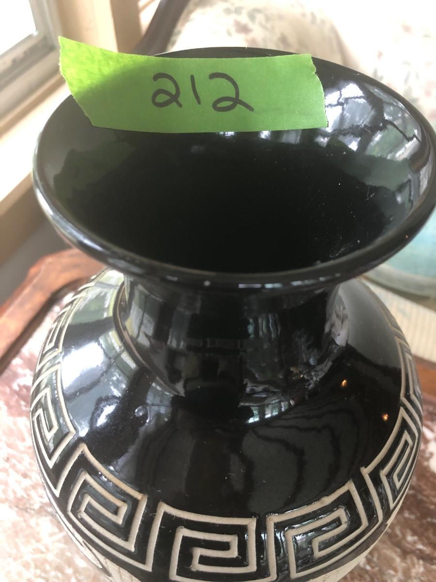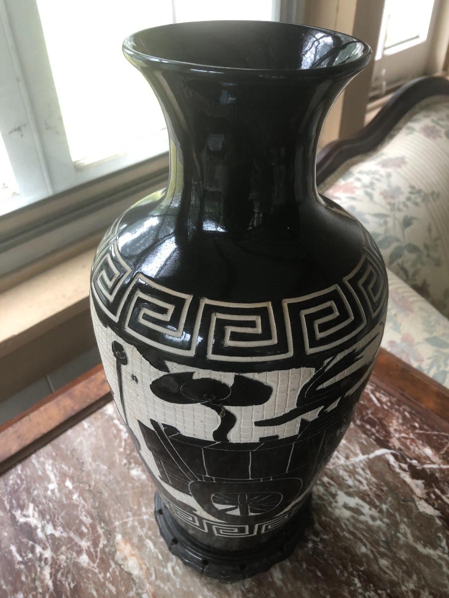 Black & White Greek Key Accented Vase w/ Vintage Wooden Stand -Lot 212