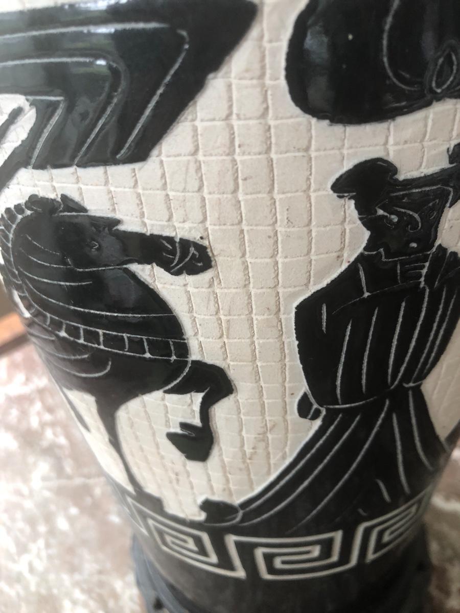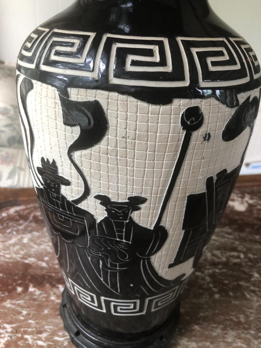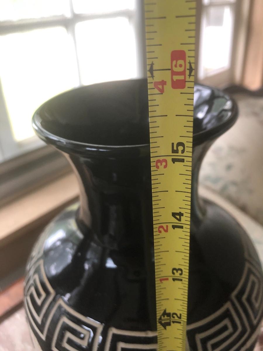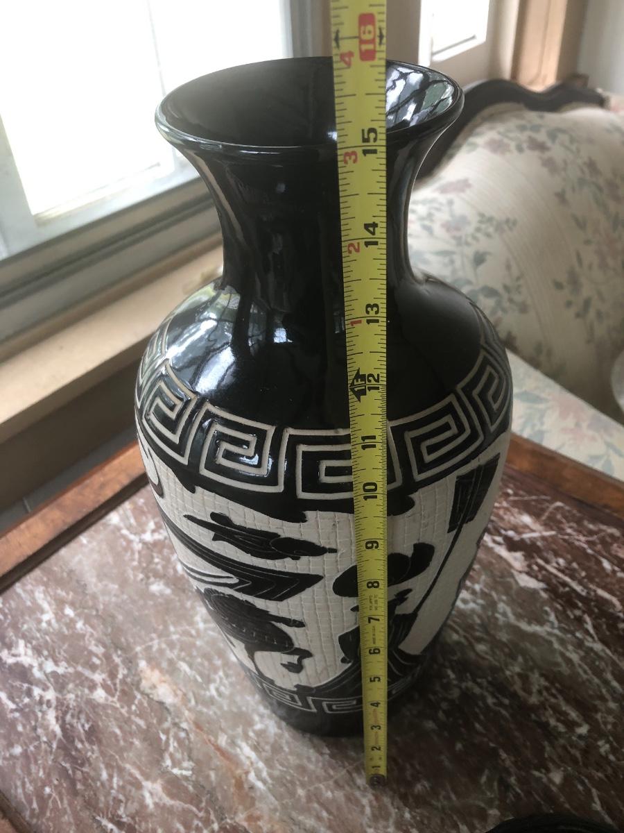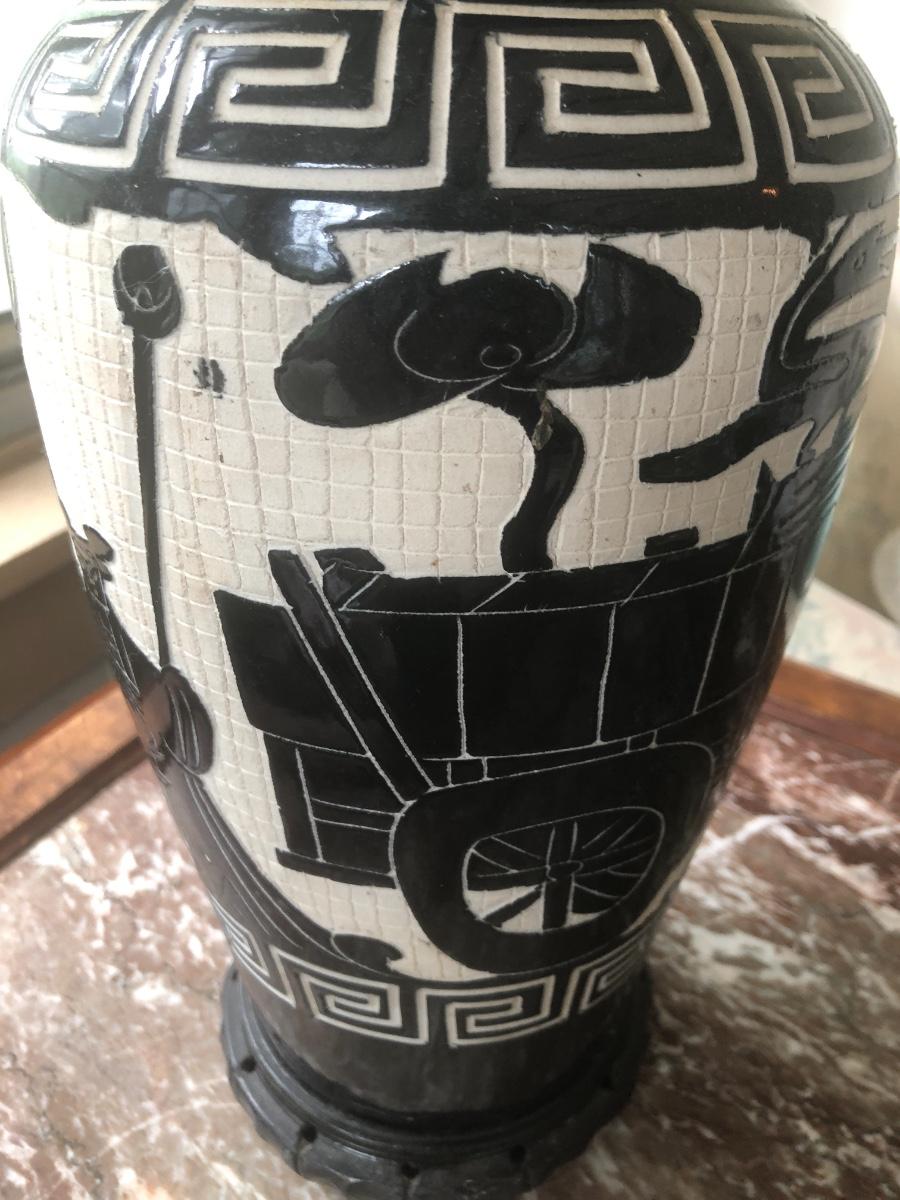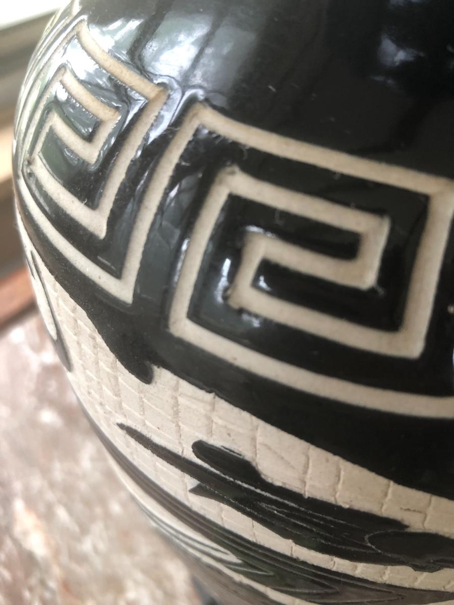 Black & White Greek Key Accented Vase w/ Vintage Wooden Stand -Lot 212