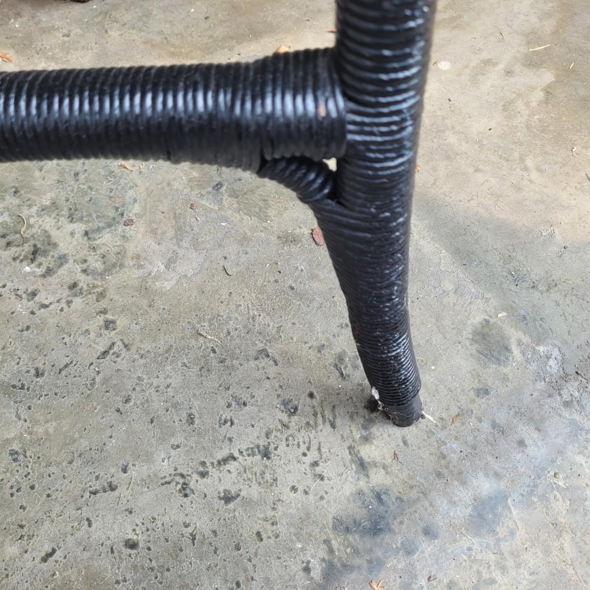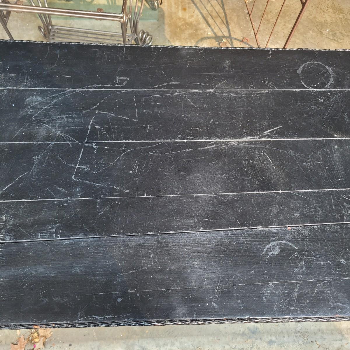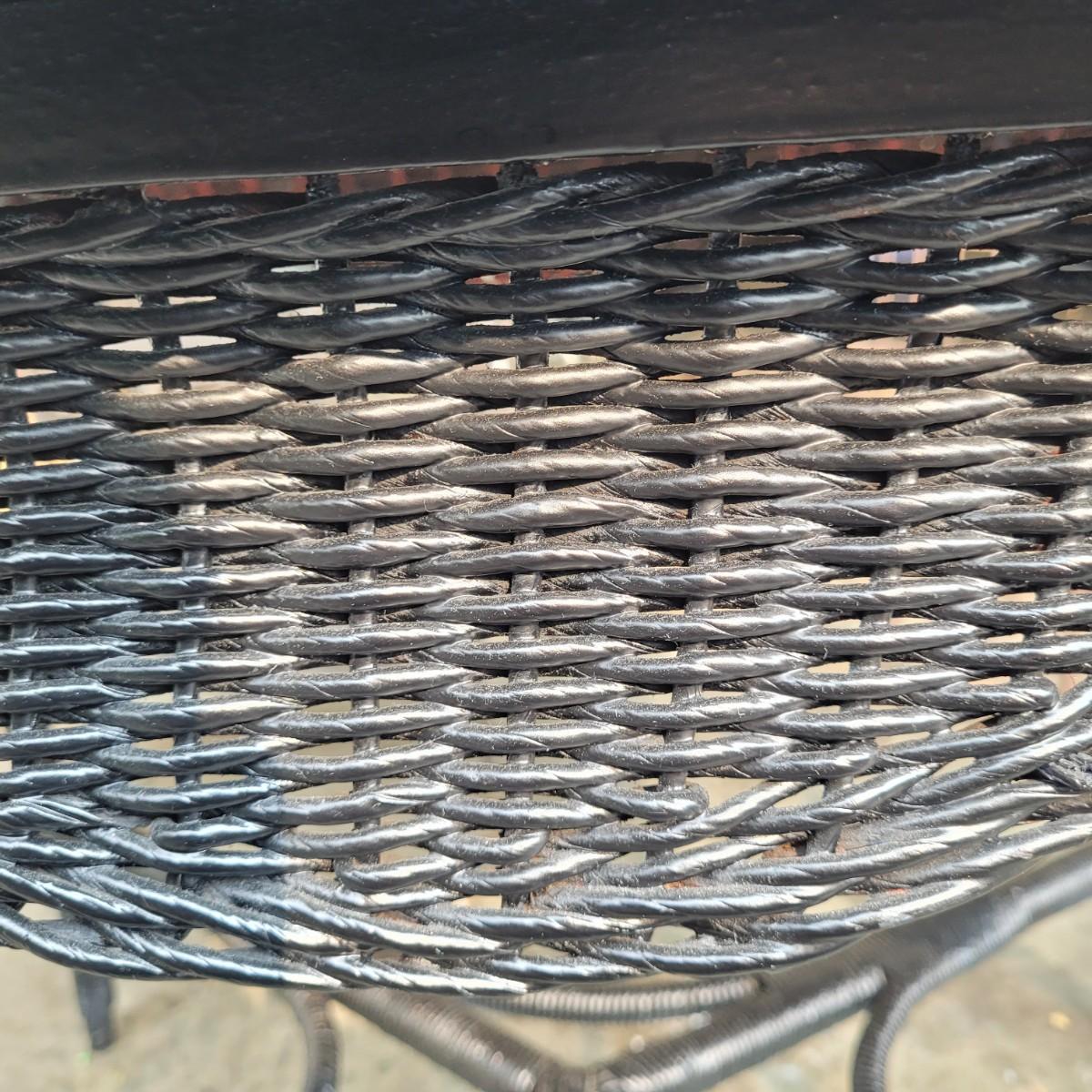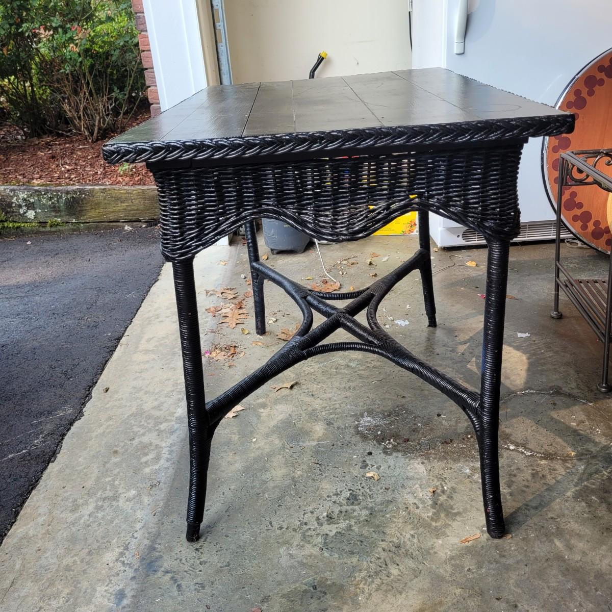 This lot includes a wood and wicker table. It appears to have been painted black. It features a paneled wood top and wicker accents. The legs are wrapped and woven with a similar material. The table has some signs of age including some small chips and scratches. The table measures 37" x 25" x 30"H.