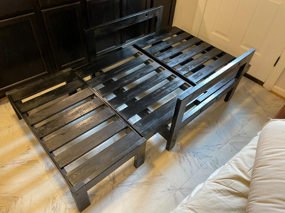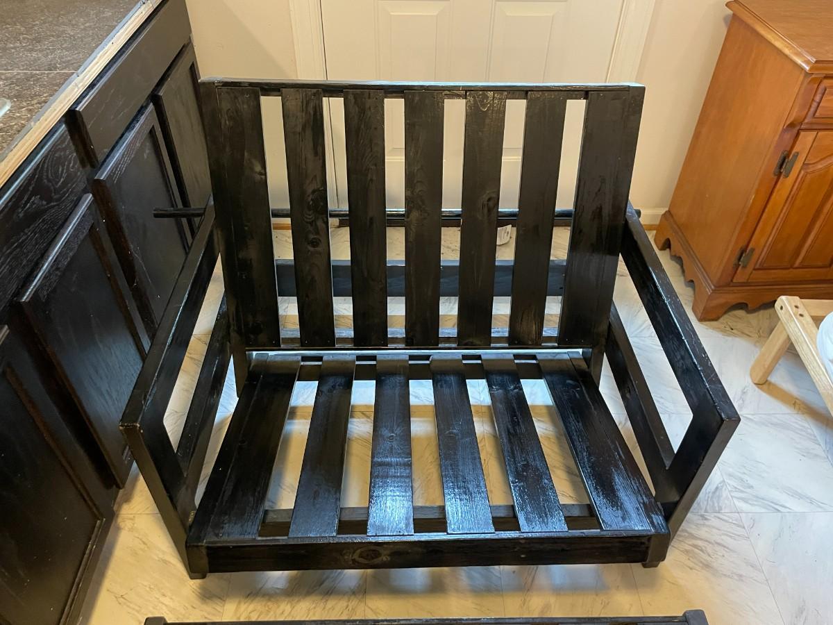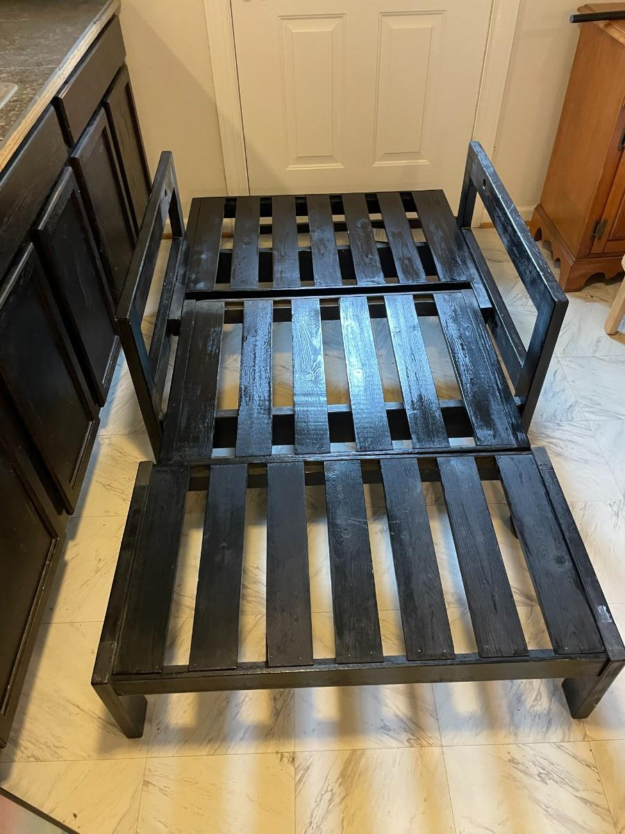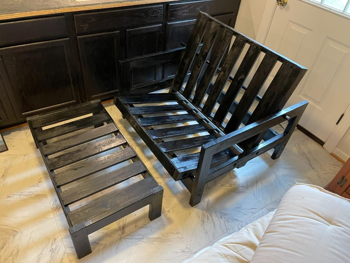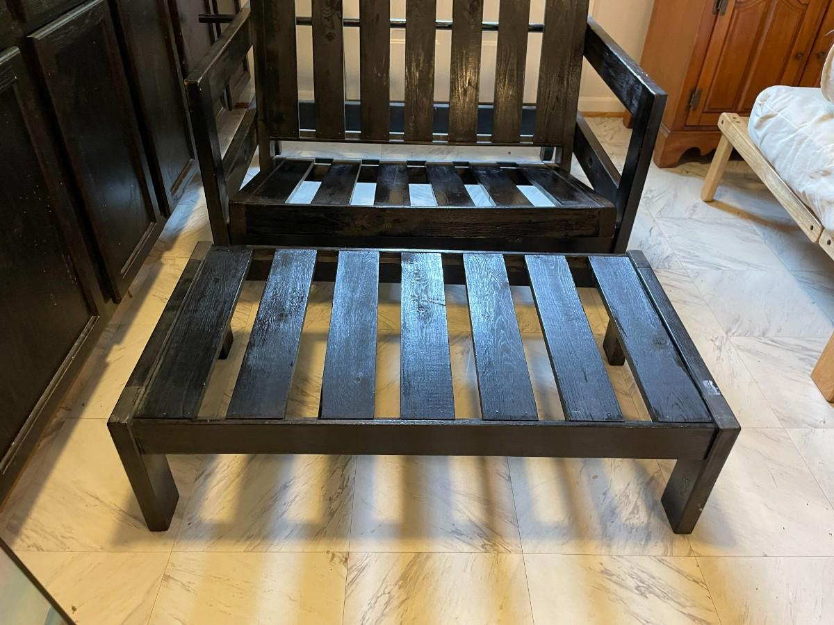Convertible chair and ottoman set crafted from painted black wood with a slatted design. The chair folds out to double as a lounge or sleeping platform. Includes matching ottoman for additional comfort and functionality. Cushions are provided as part of the set. Condition appears to display careful craftsmanship for multipurpose use.