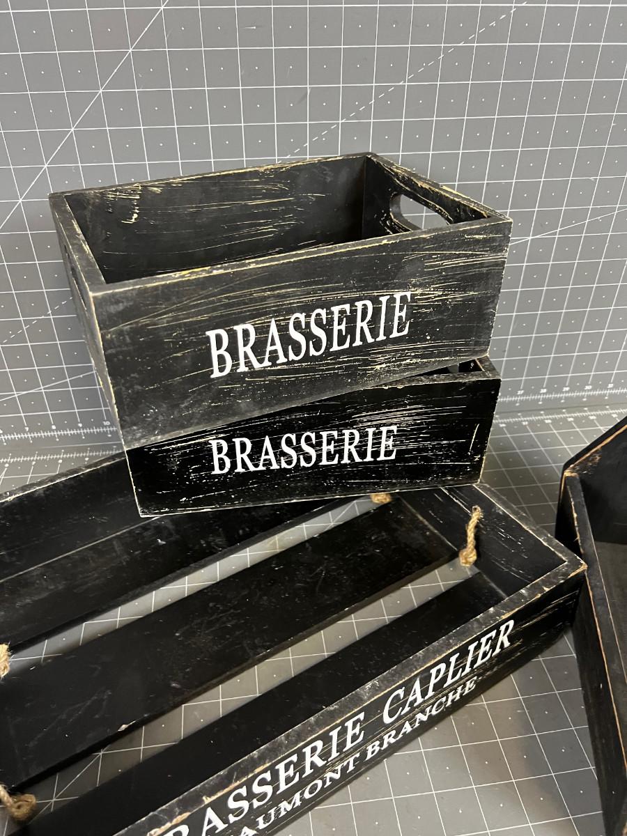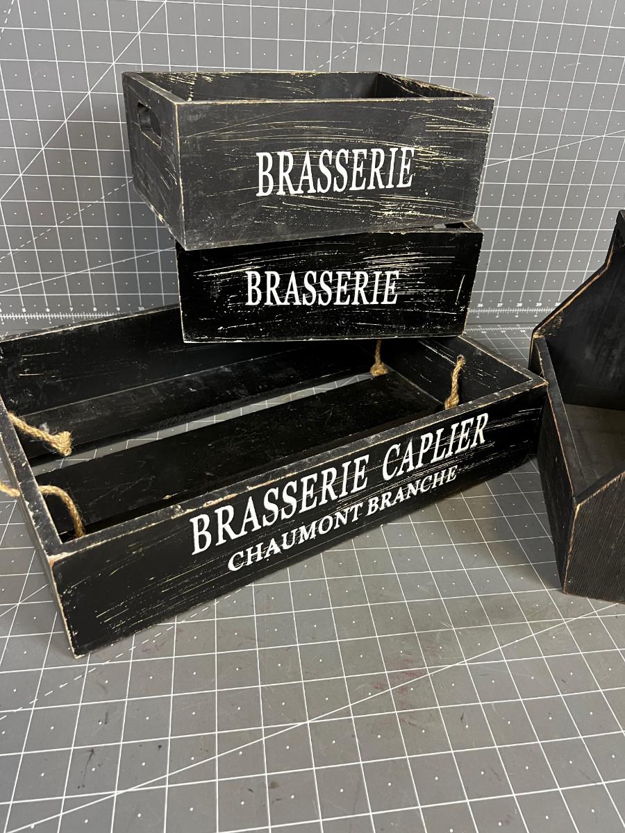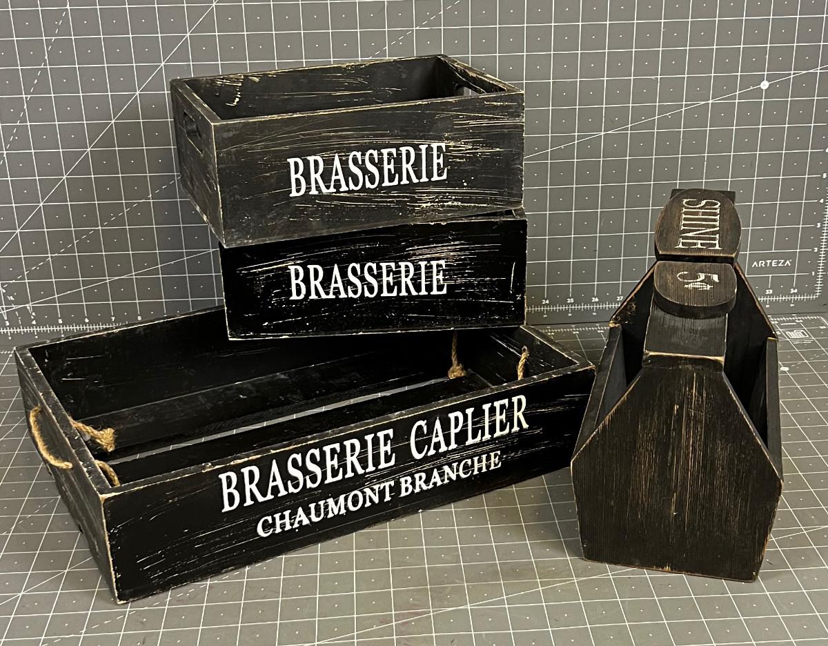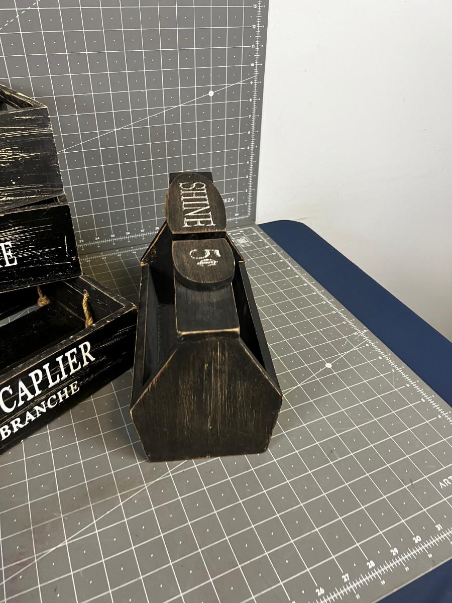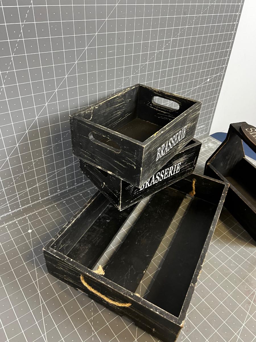 Black Wood Crates; Shoe Shine etc. New made to look old.