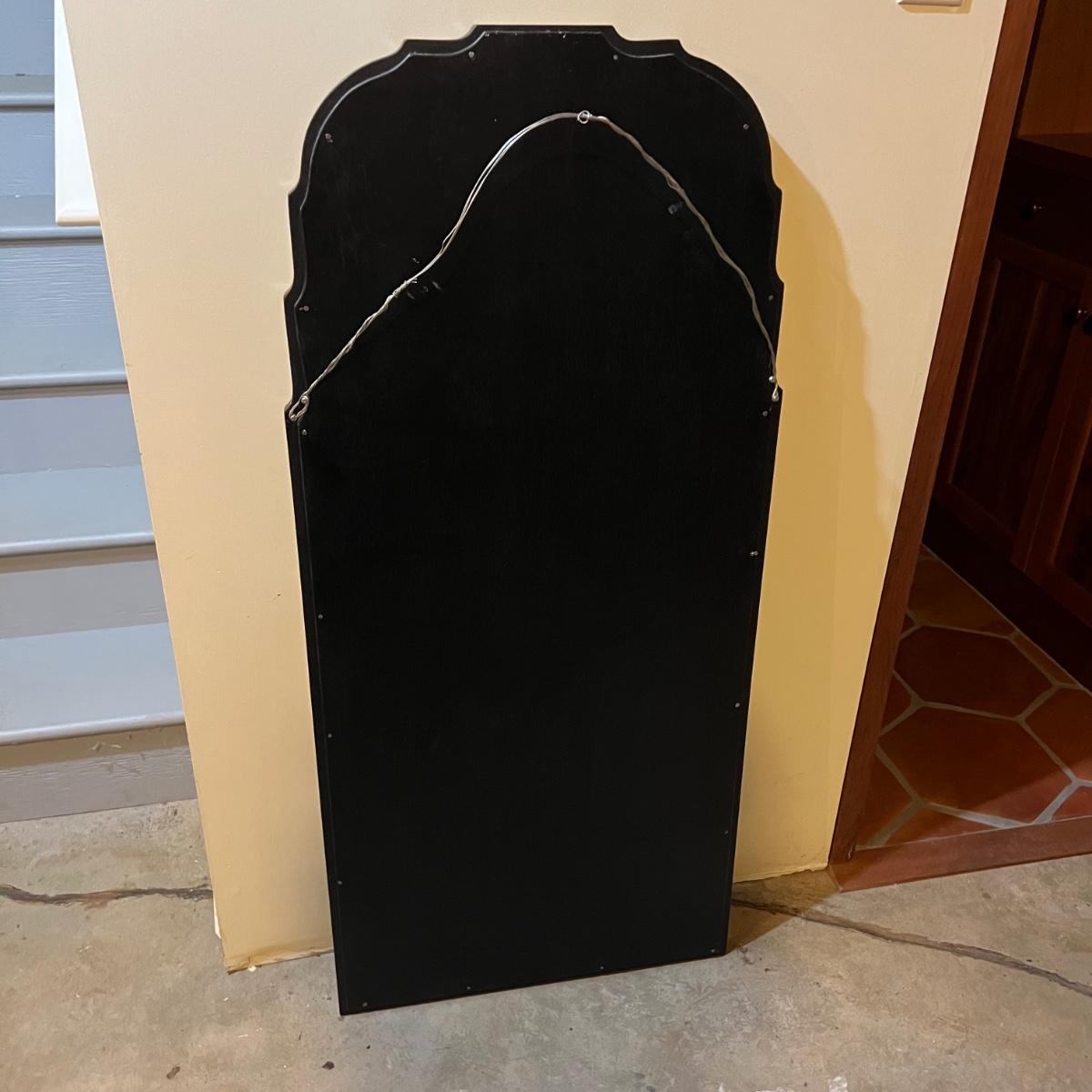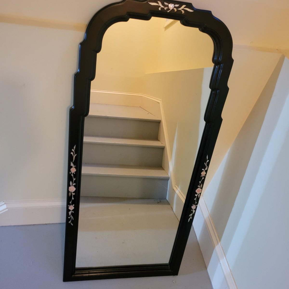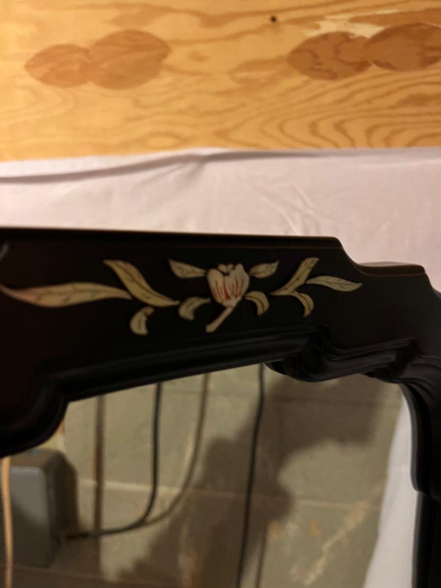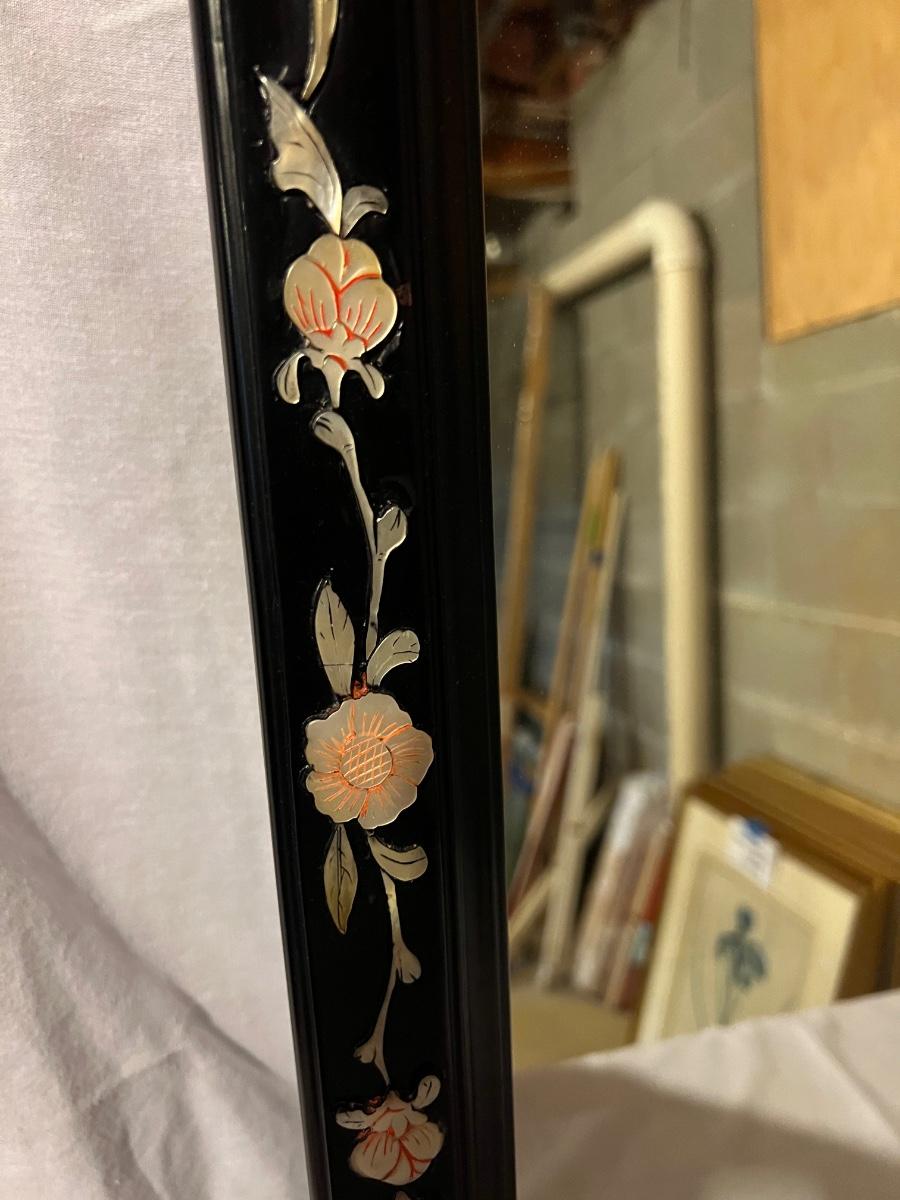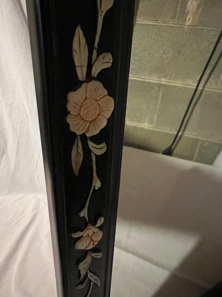 Rectangular shaped mirror surrounded by a black wood frame with Pirl. What appears to be mother of pearl/sea shell material floral design around the edges. The top is a scallop to oval. The mirror measures 21.25” x 1” x 47.75”H.