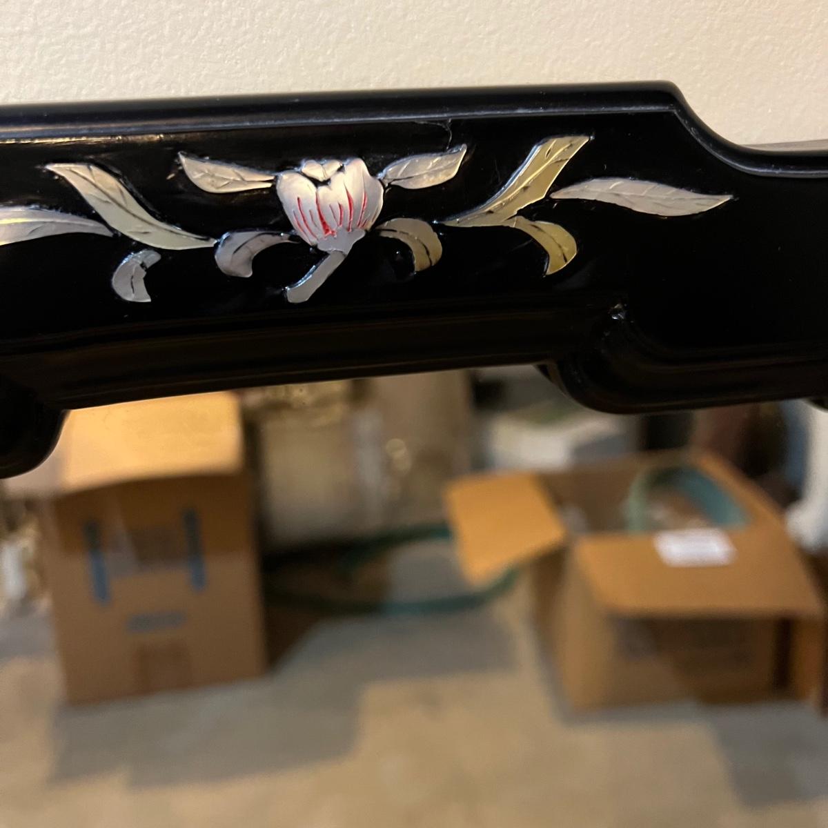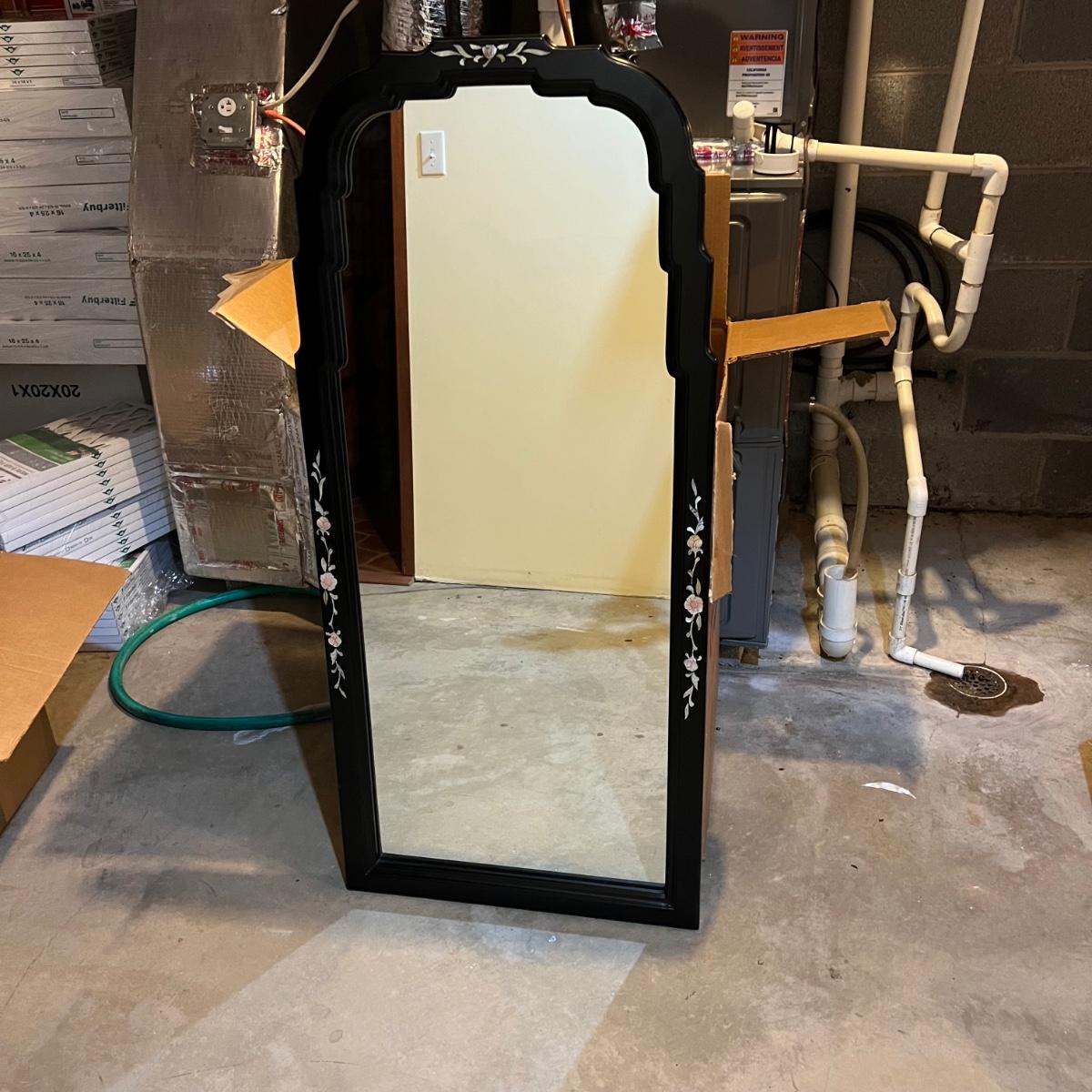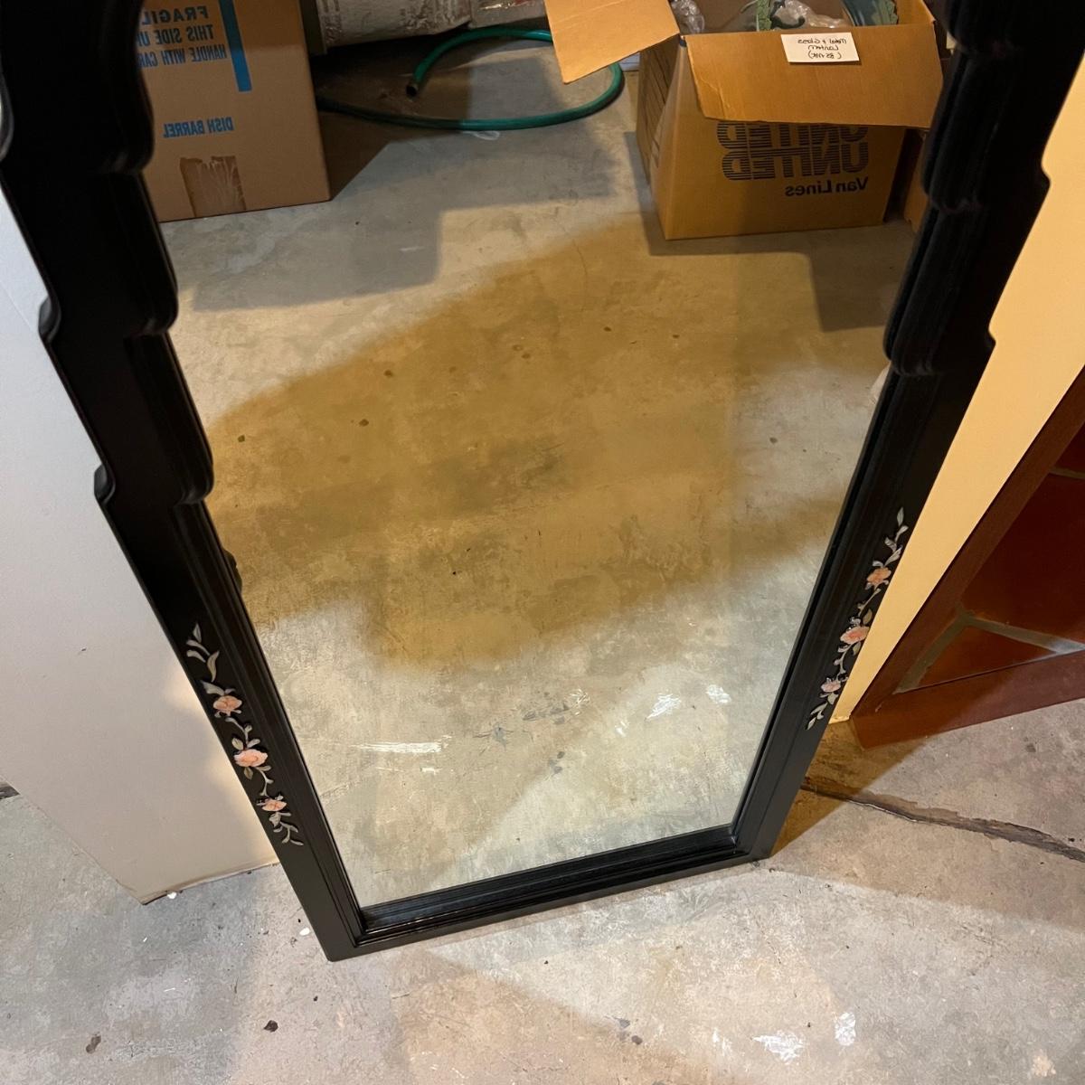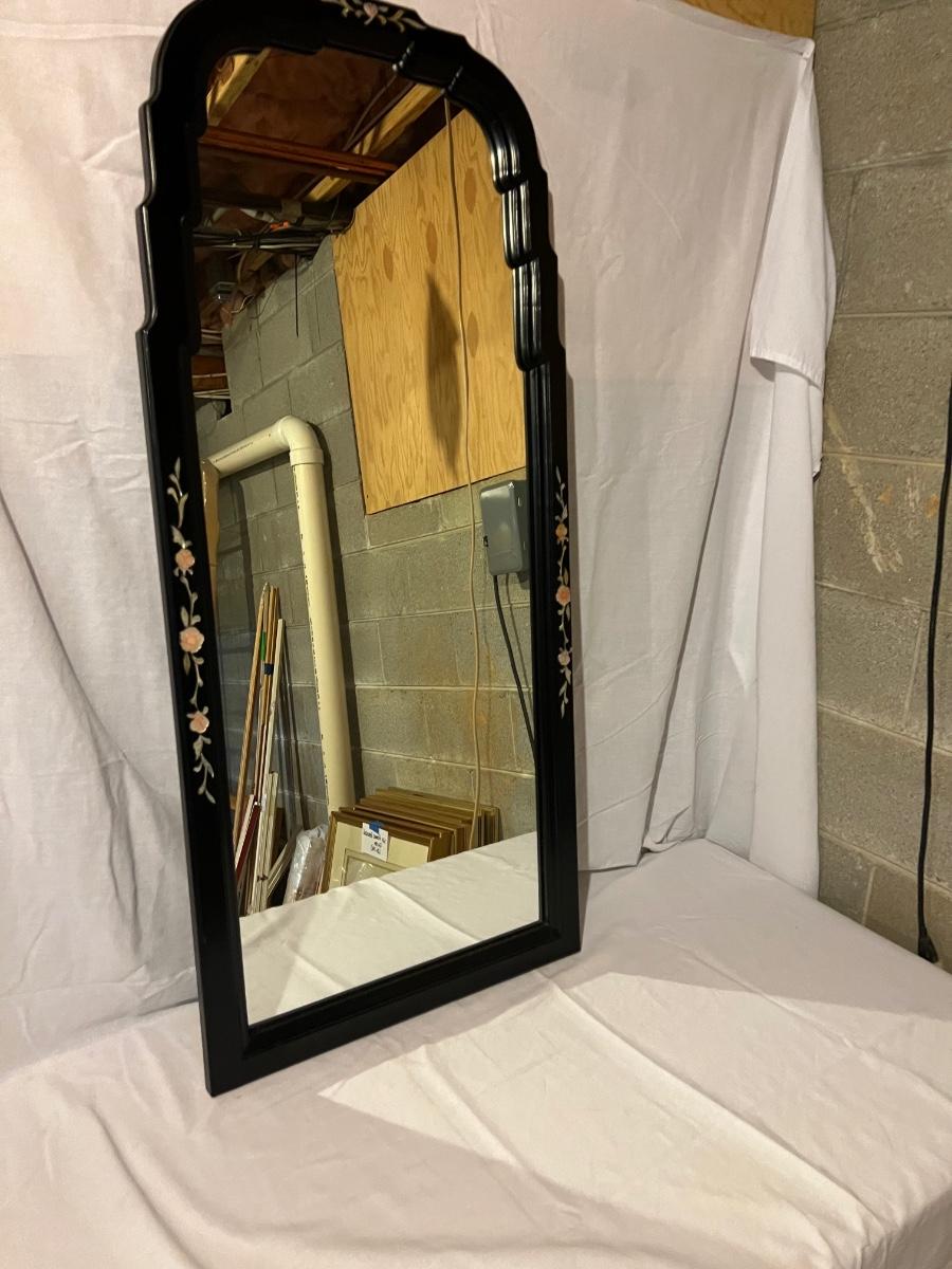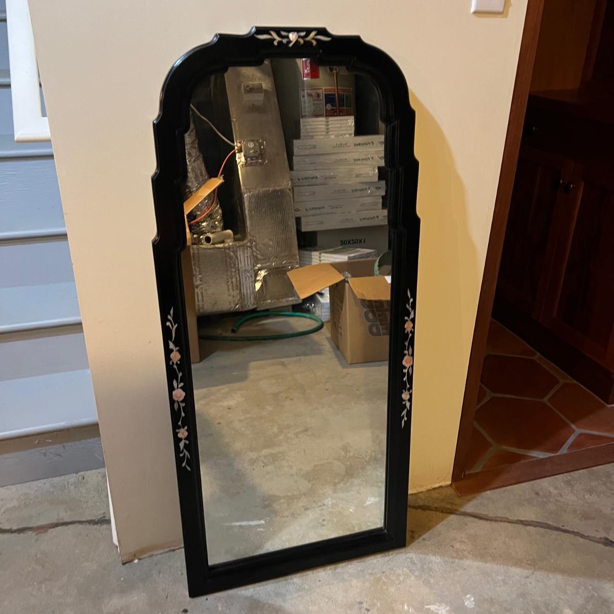 Rectangular shaped mirror surrounded by a black wood frame with Pirl. What appears to be mother of pearl/sea shell material floral design around the edges. The top is a scallop to oval. The mirror measures 21.25” x 1” x 47.75”H.