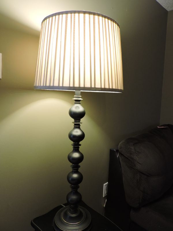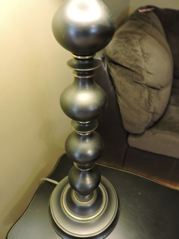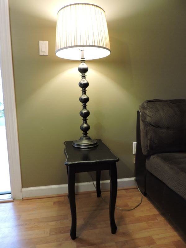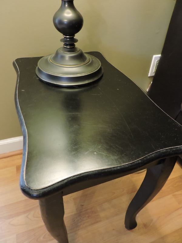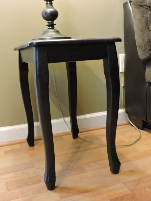 Black painted wood side table with black metal lamp. Table is 13”x21” and lamp is 39” high.