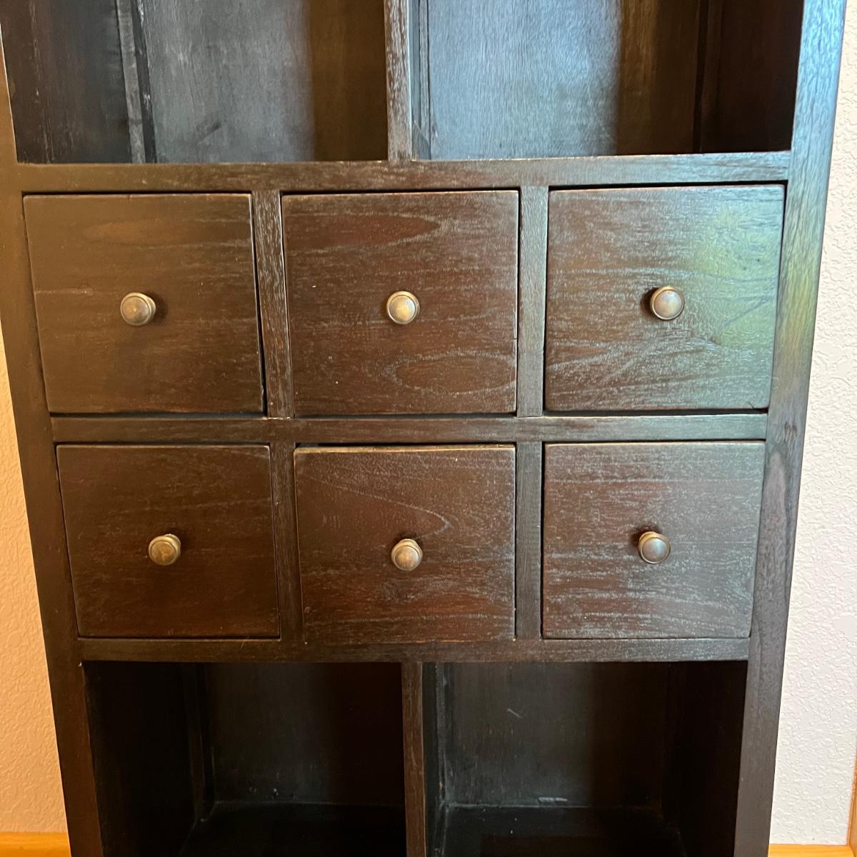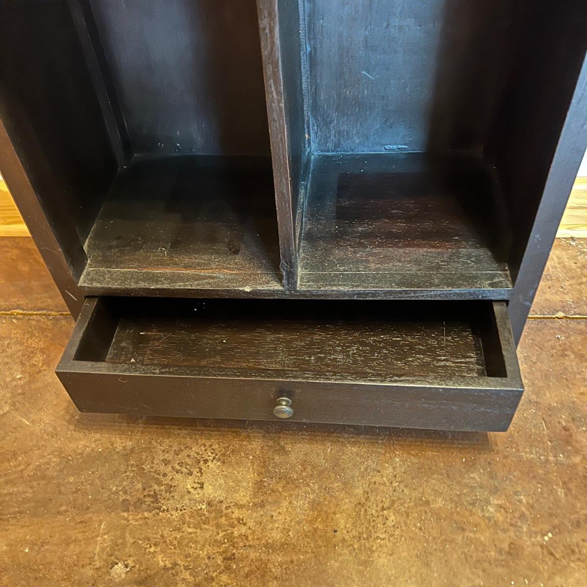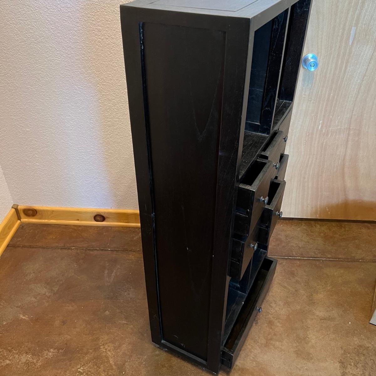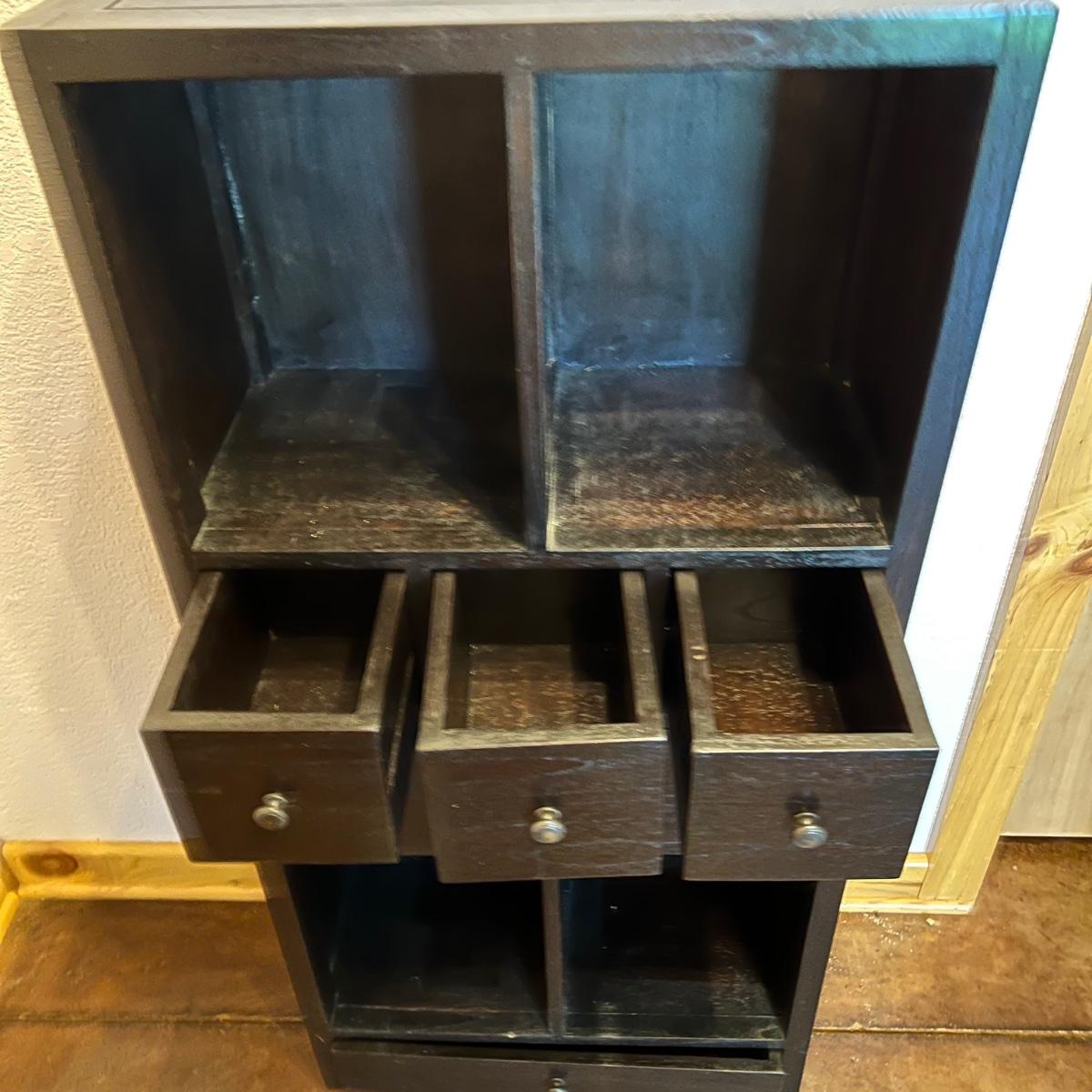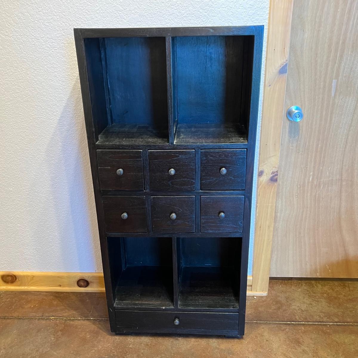 Black stained wooden cabinet measures 23.5” x12” x 51”H. The bookcase has 6 smaller drawers in the center and one larger drawer at the bottom. Drawer joints are not dovetailed.
