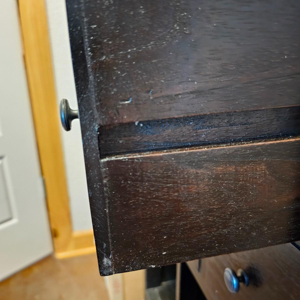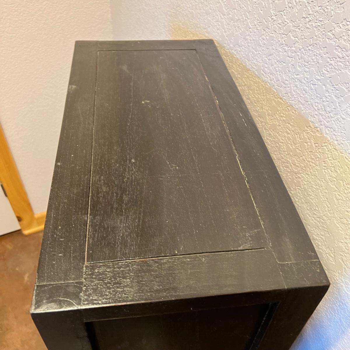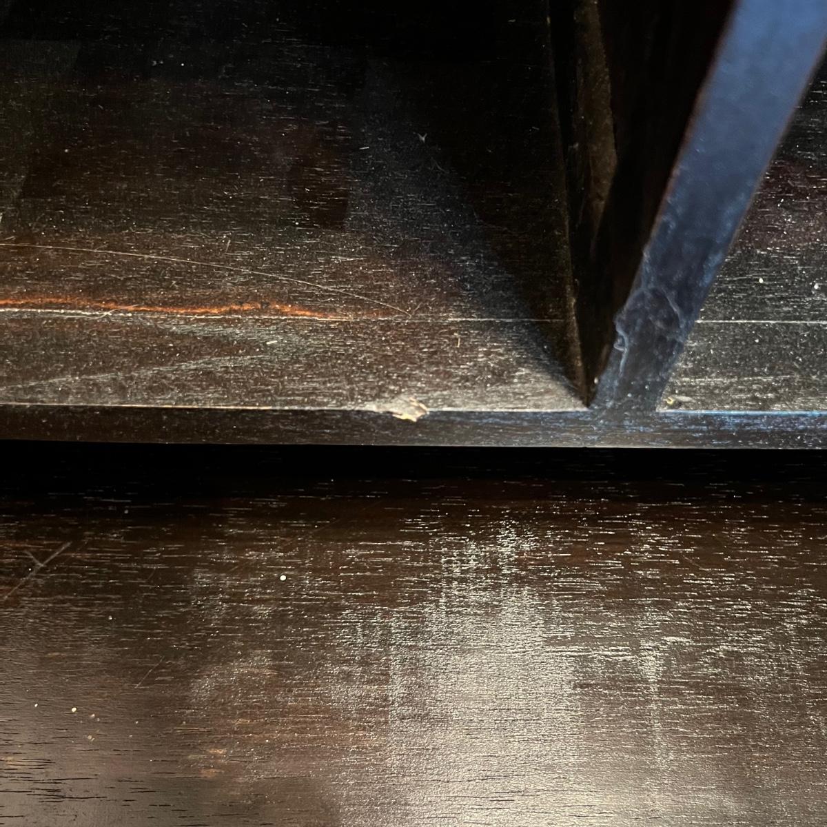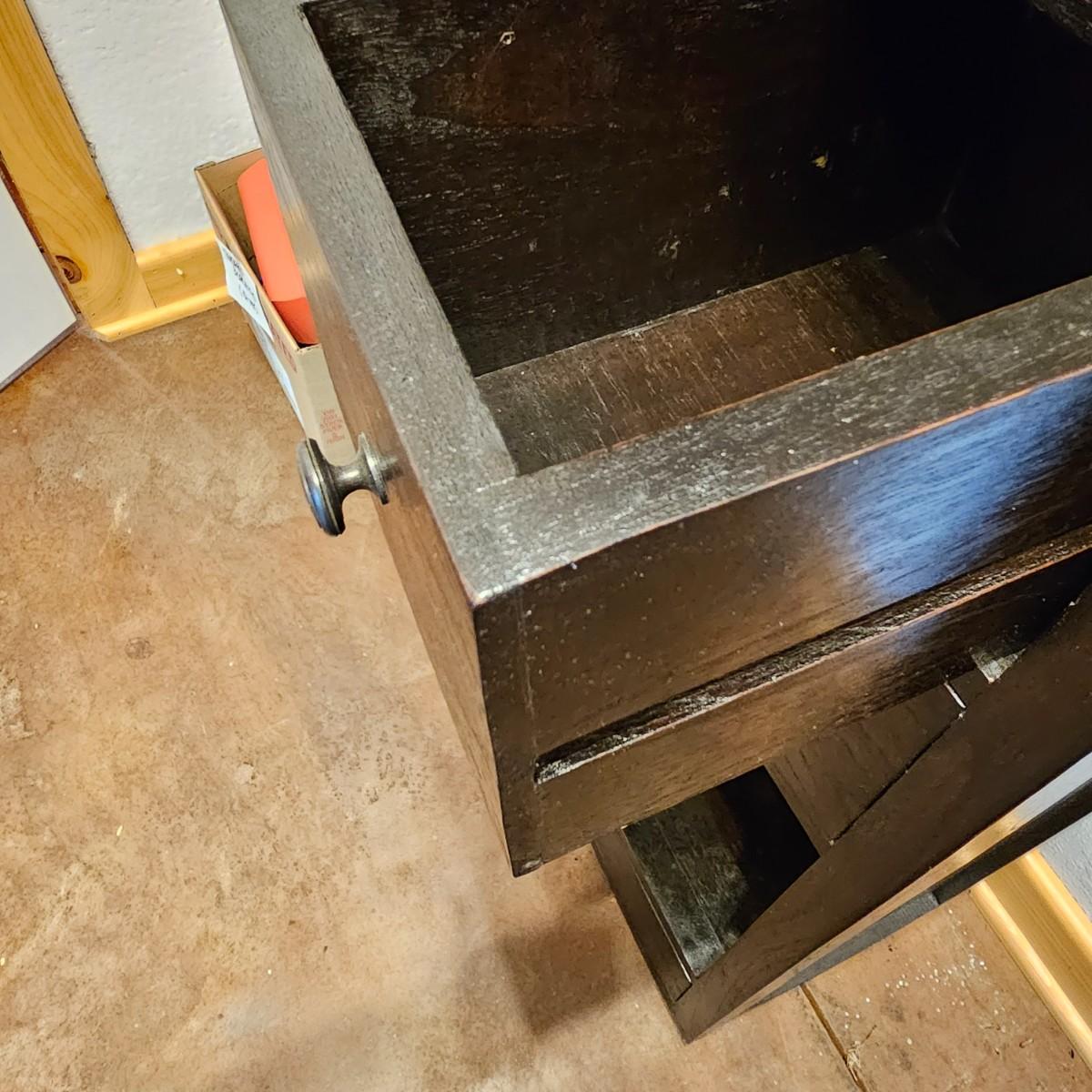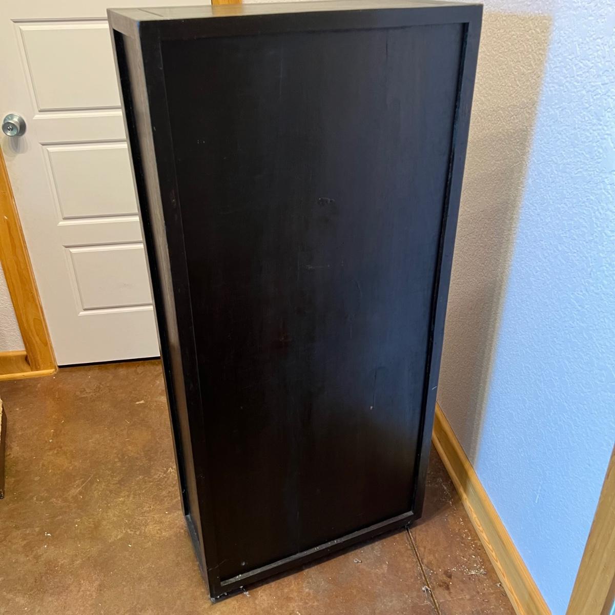 Black stained wooden cabinet measures 23.5” x12” x 51”H. The bookcase has 6 smaller drawers in the center and one larger drawer at the bottom. Drawer joints are not dovetailed.
