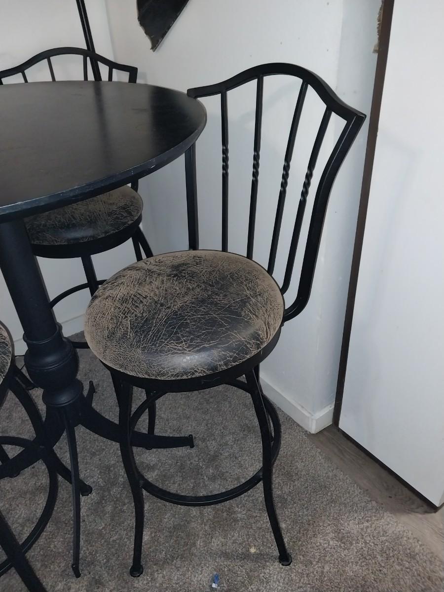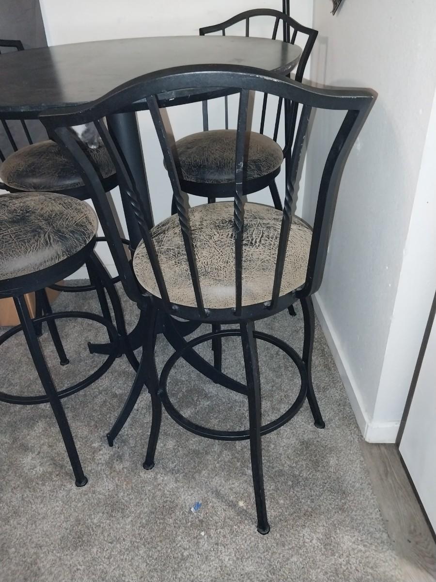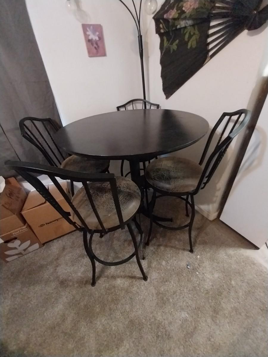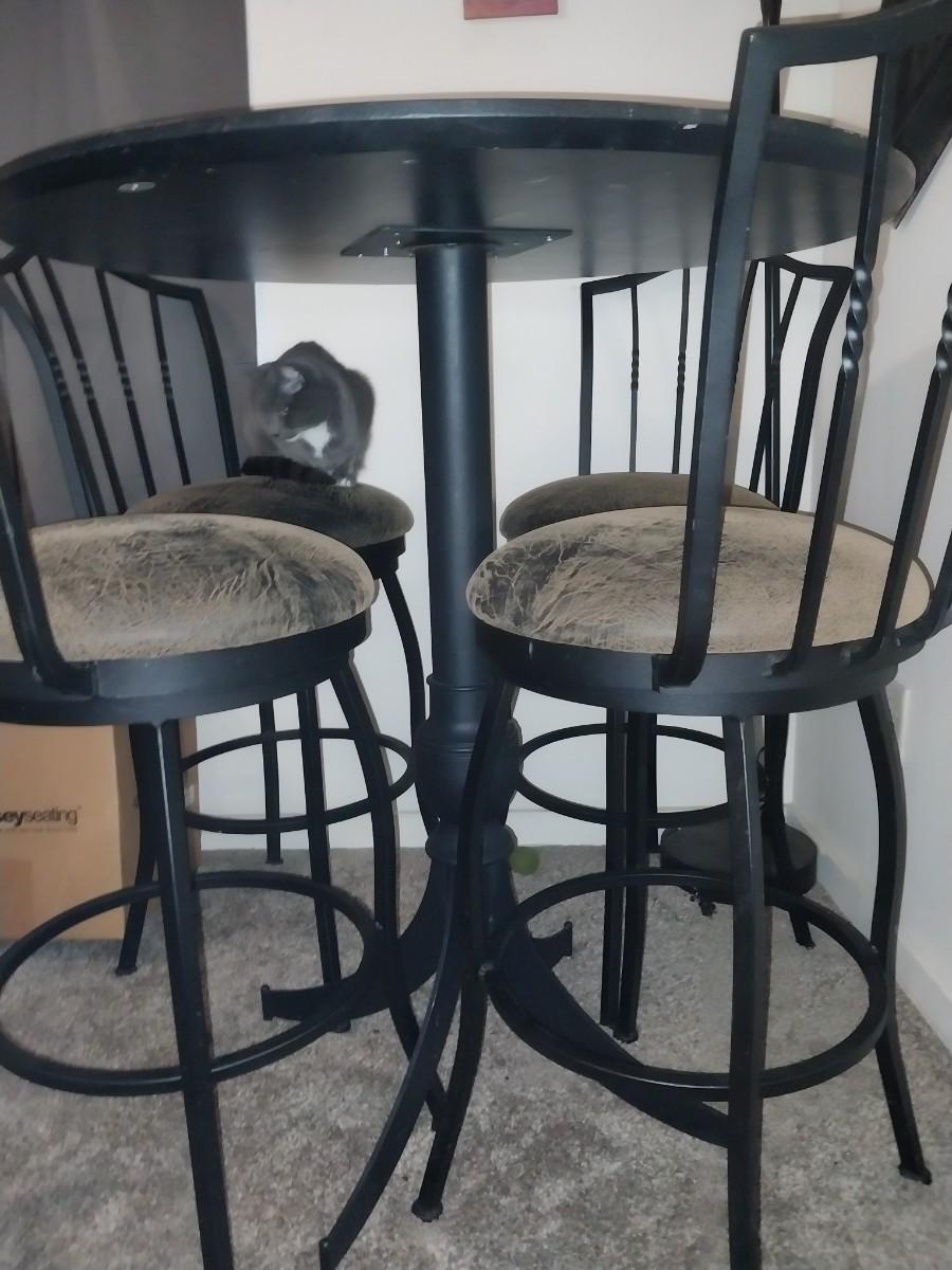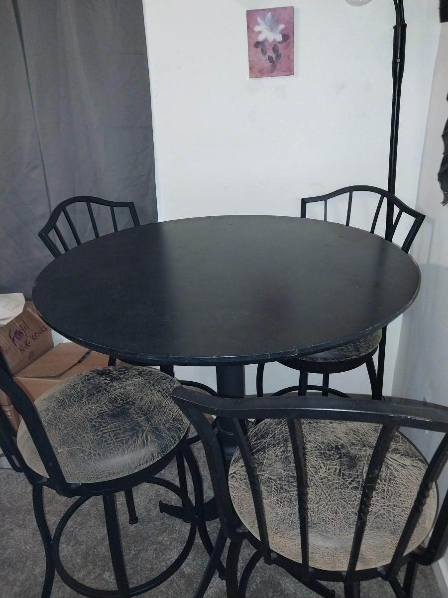 BLACK WROUGHT IRON BASE AND FRAME CAFE STYLE TABLE AND FOUR CHAIRS