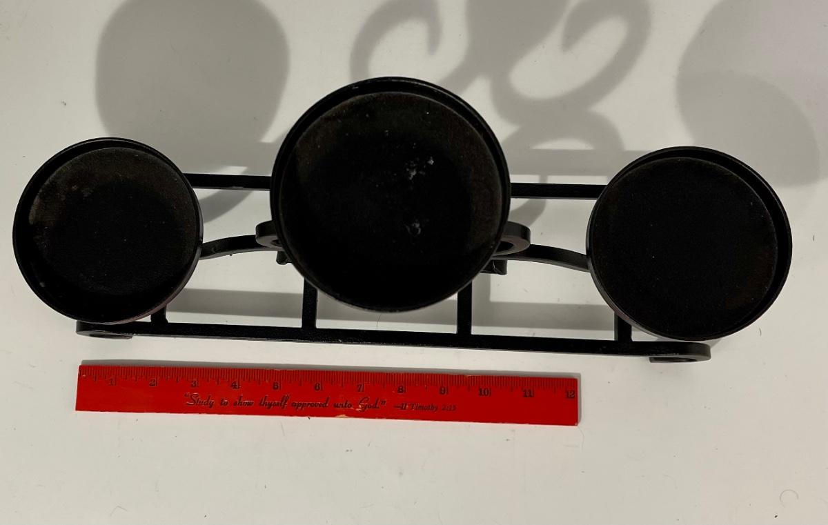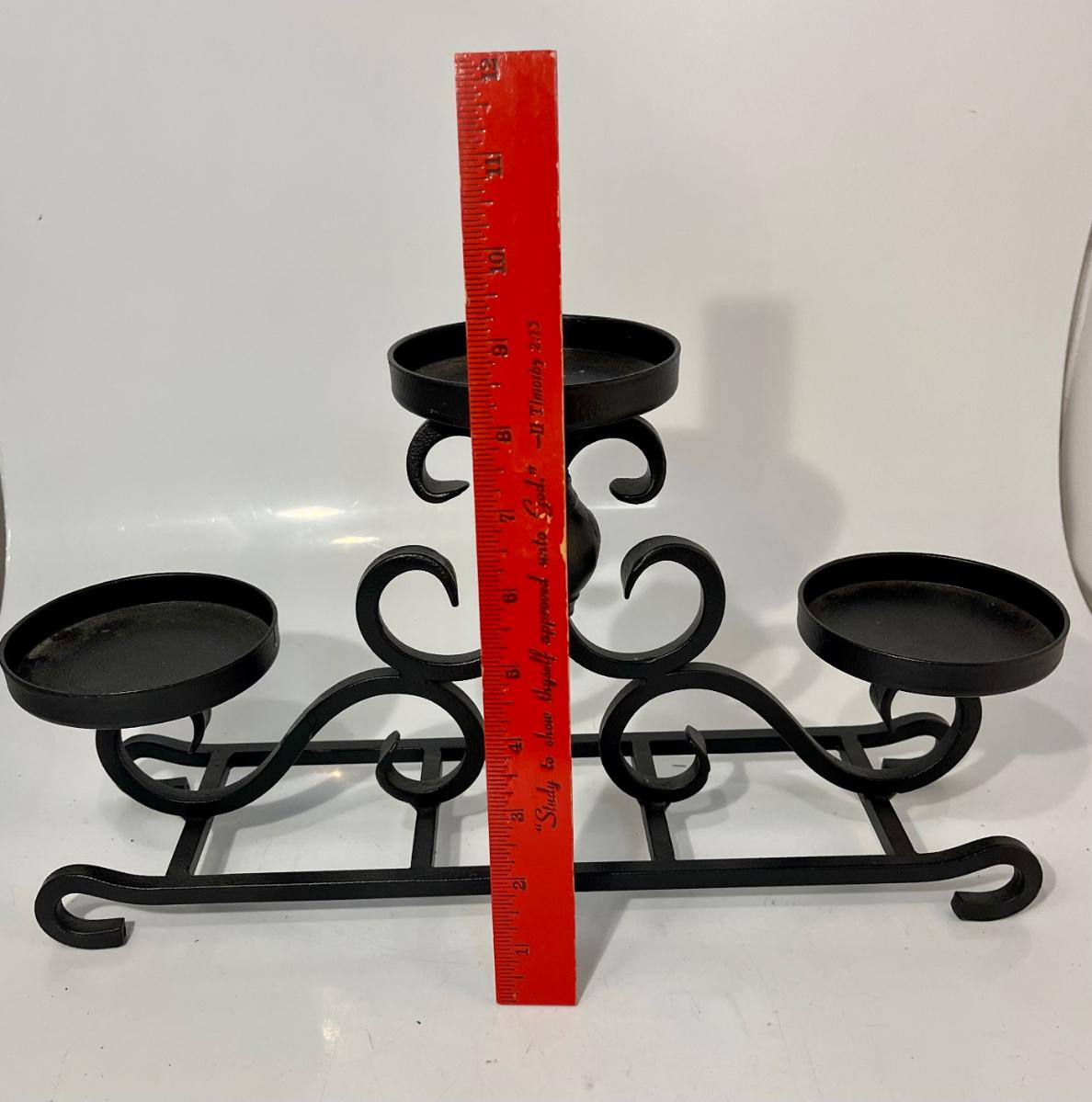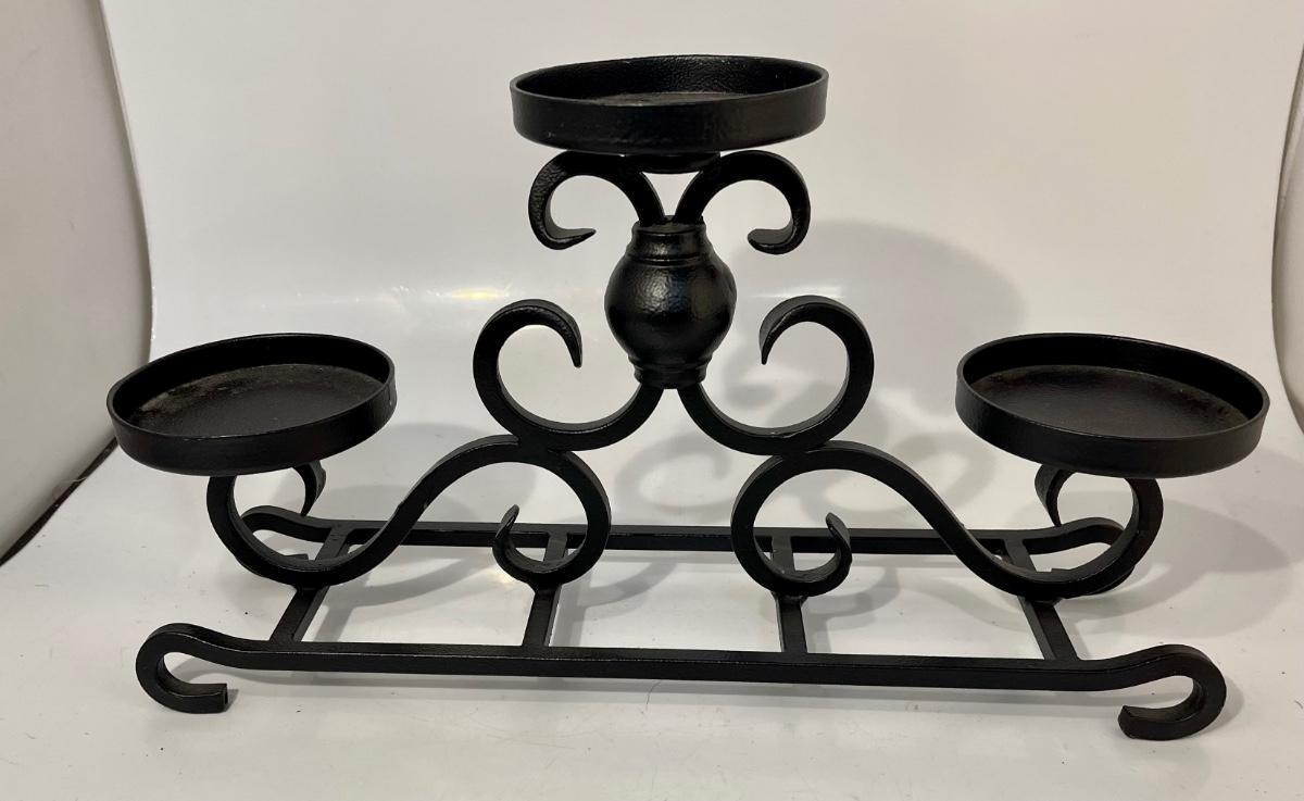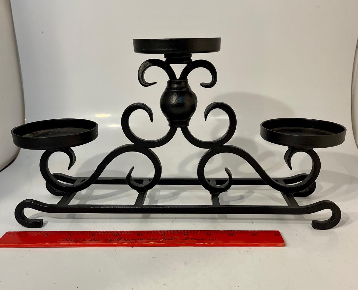 Black Wrought Iron Metal Tiered Candelabra 3 Candle Centerpiece Holder. About 16" length. In good condition.