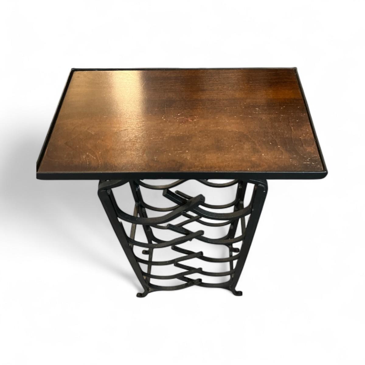 Black Wrought Iron Decorative Scrollwork Wine Rack With Top Shelf Approximately 18.5"X10"x37" Shelf is removable. Missing to nuts and bolts that hold it together..