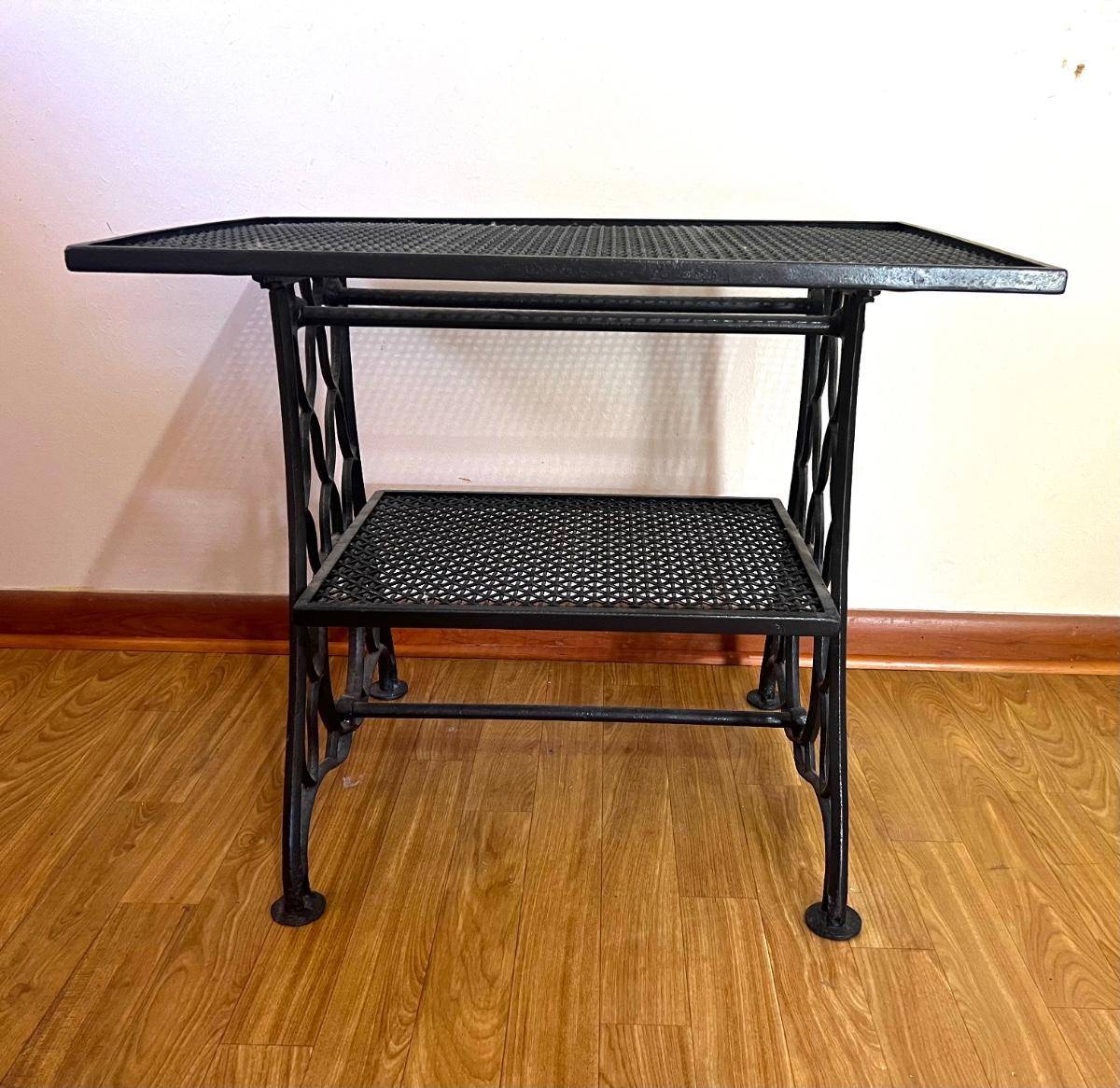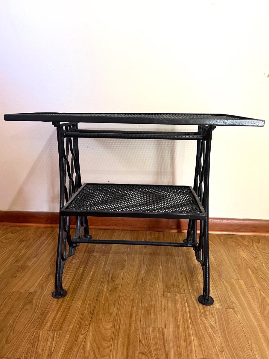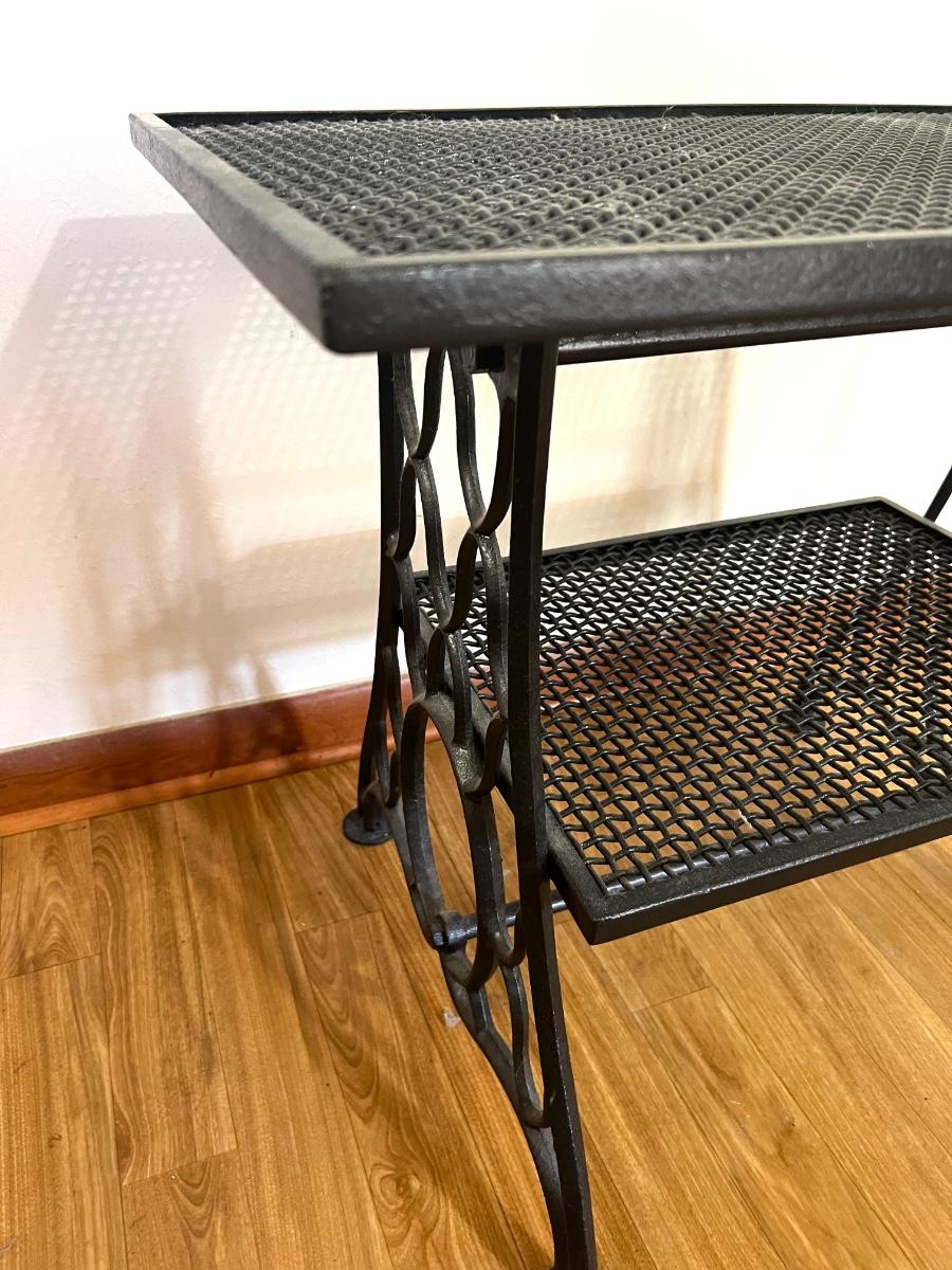 Black wrought iron table. Measures 24 inches tall, 29 1/2 inches wide and 19 1/2 inches deep.