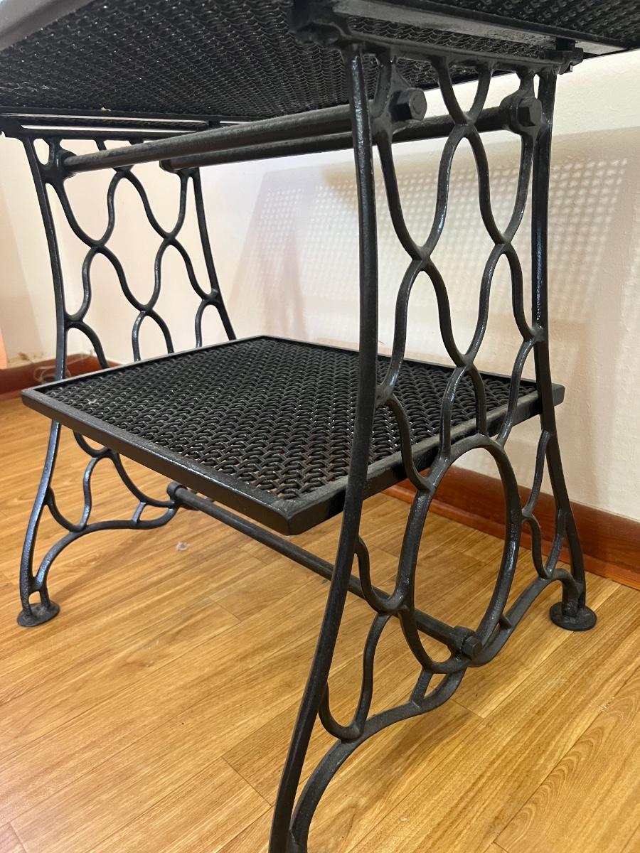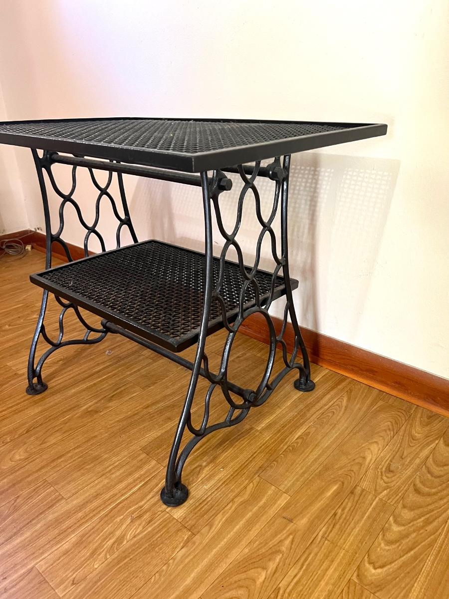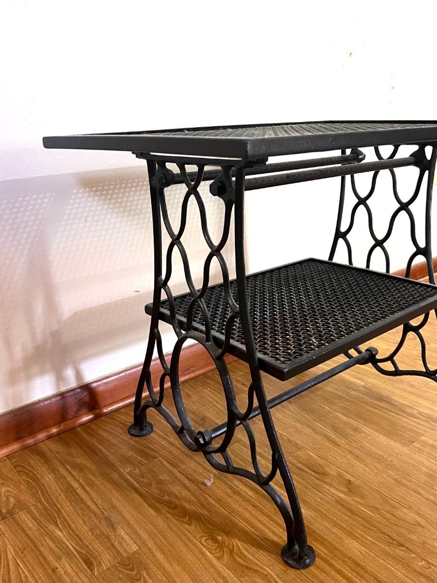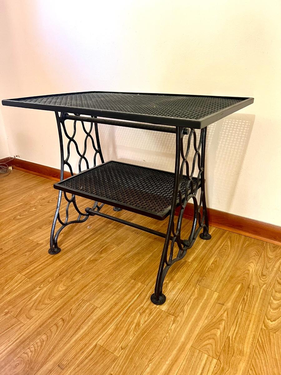 Black wrought iron table. Measures 24 inches tall, 29 1/2 inches wide and 19 1/2 inches deep.