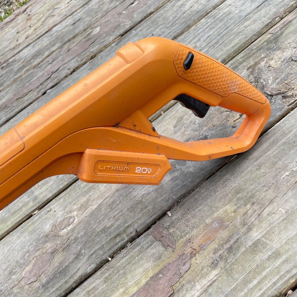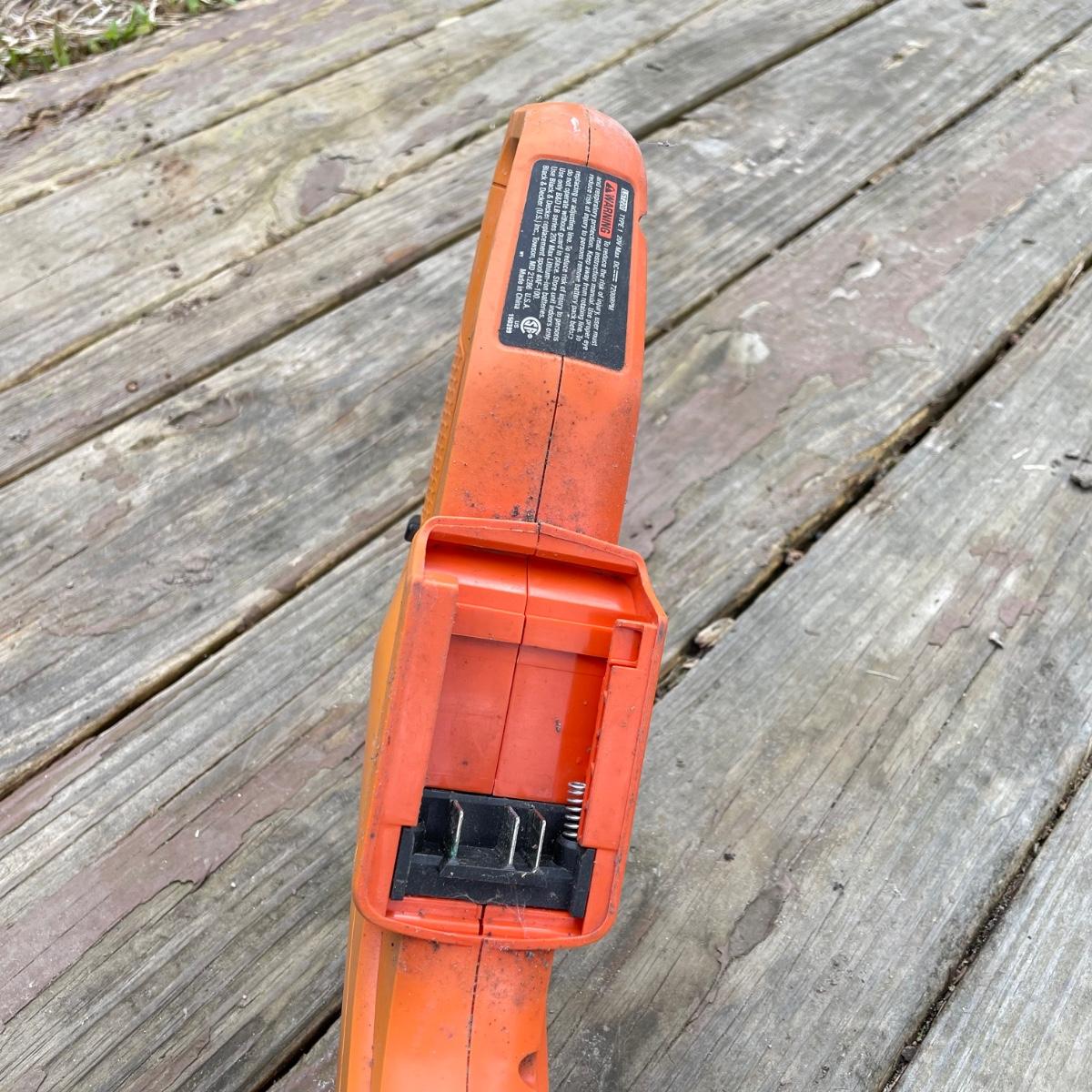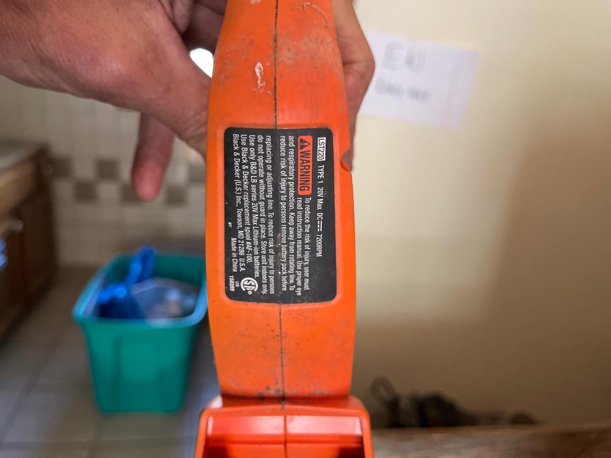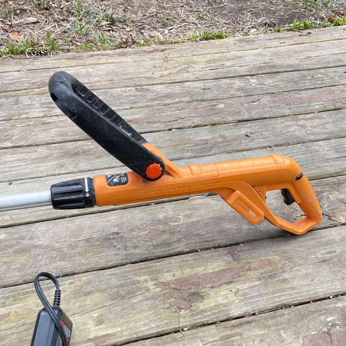 Bright orange 20v Lithium battery powered string trimmer. This weed eater powered on when tested. Lot includes three Black+Decker 20MAXv batteries and two chargers. Both of the battery chargers lit up when attached to each battery. See images. Local pick up only.