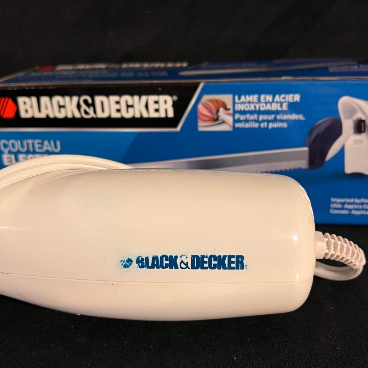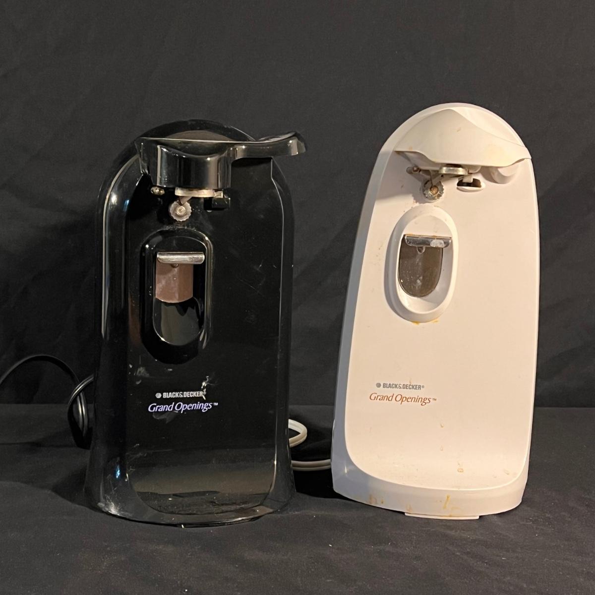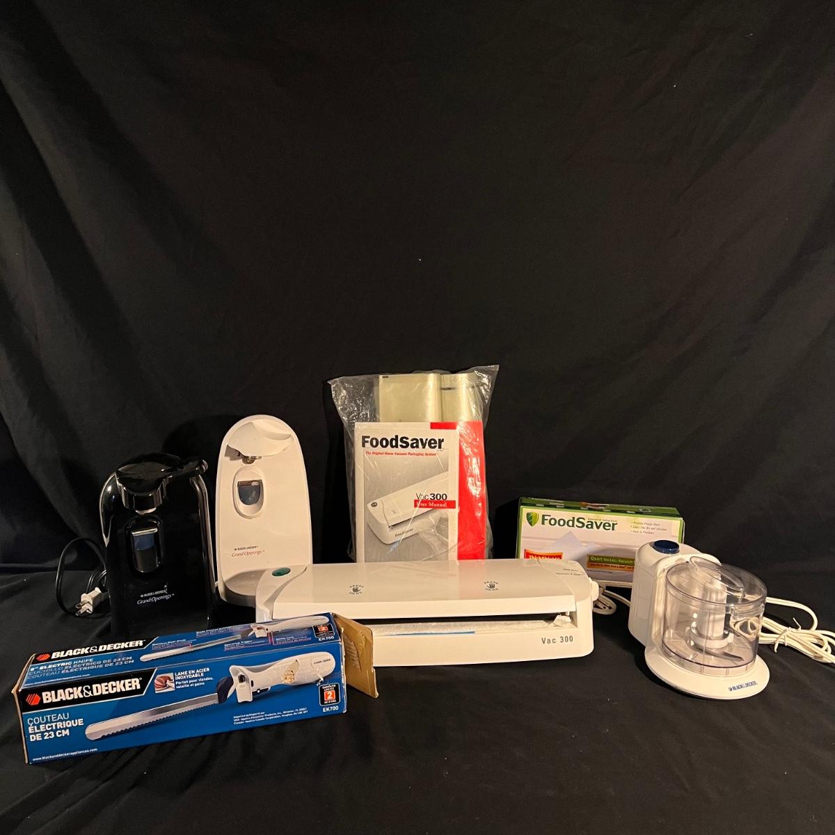 Lot includes two Black&Decker electric can openers, one Black&Decker electric serrated knife, one Black&Decker food processor, and one FoodSaver vacuum sealer with accessories. The vacuum sealer measures 16” x 3”H and the can openers measure 5” x 10”H. All items powered on when plugged in. The can openers show a few signs of wear with rust - see pictures included. Local pick up only.