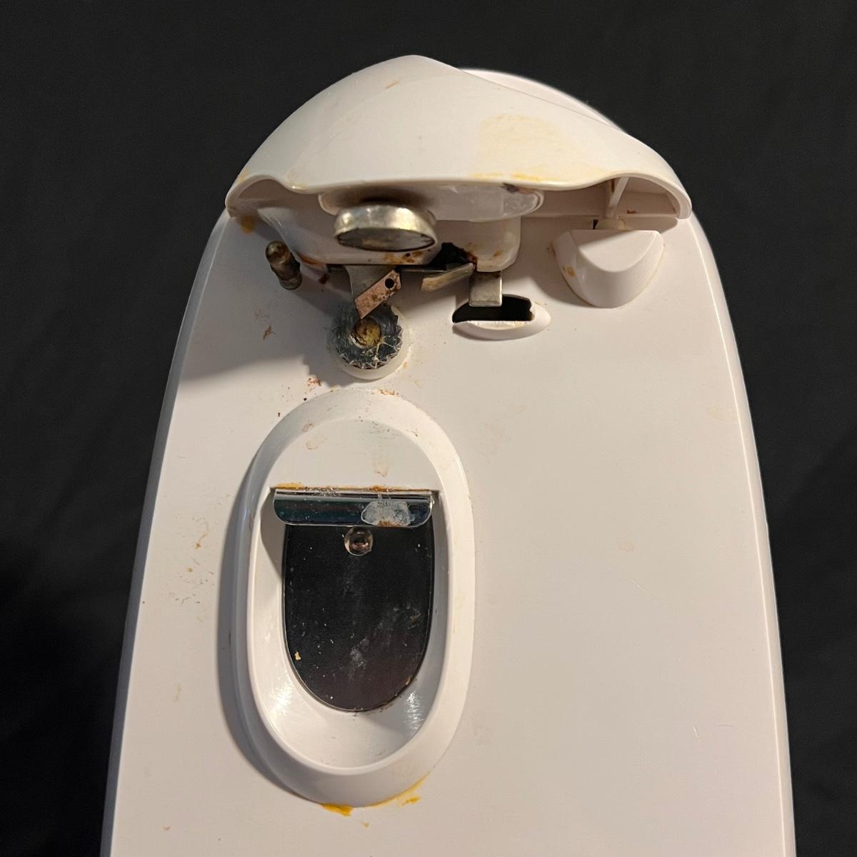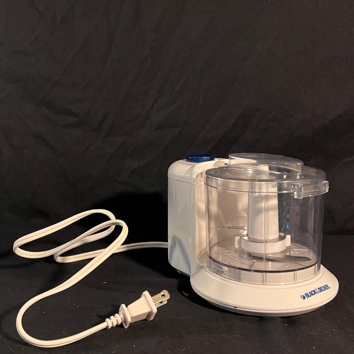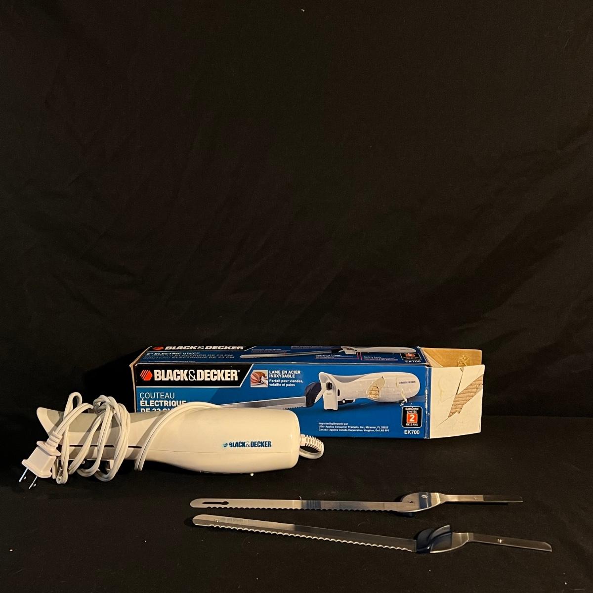 Lot includes two Black&Decker electric can openers, one Black&Decker electric serrated knife, one Black&Decker food processor, and one FoodSaver vacuum sealer with accessories. The vacuum sealer measures 16” x 3”H and the can openers measure 5” x 10”H. All items powered on when plugged in. The can openers show a few signs of wear with rust - see pictures included. Local pick up only.