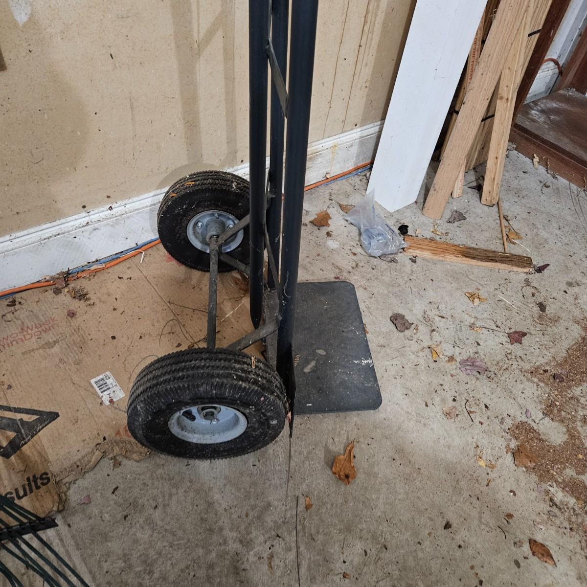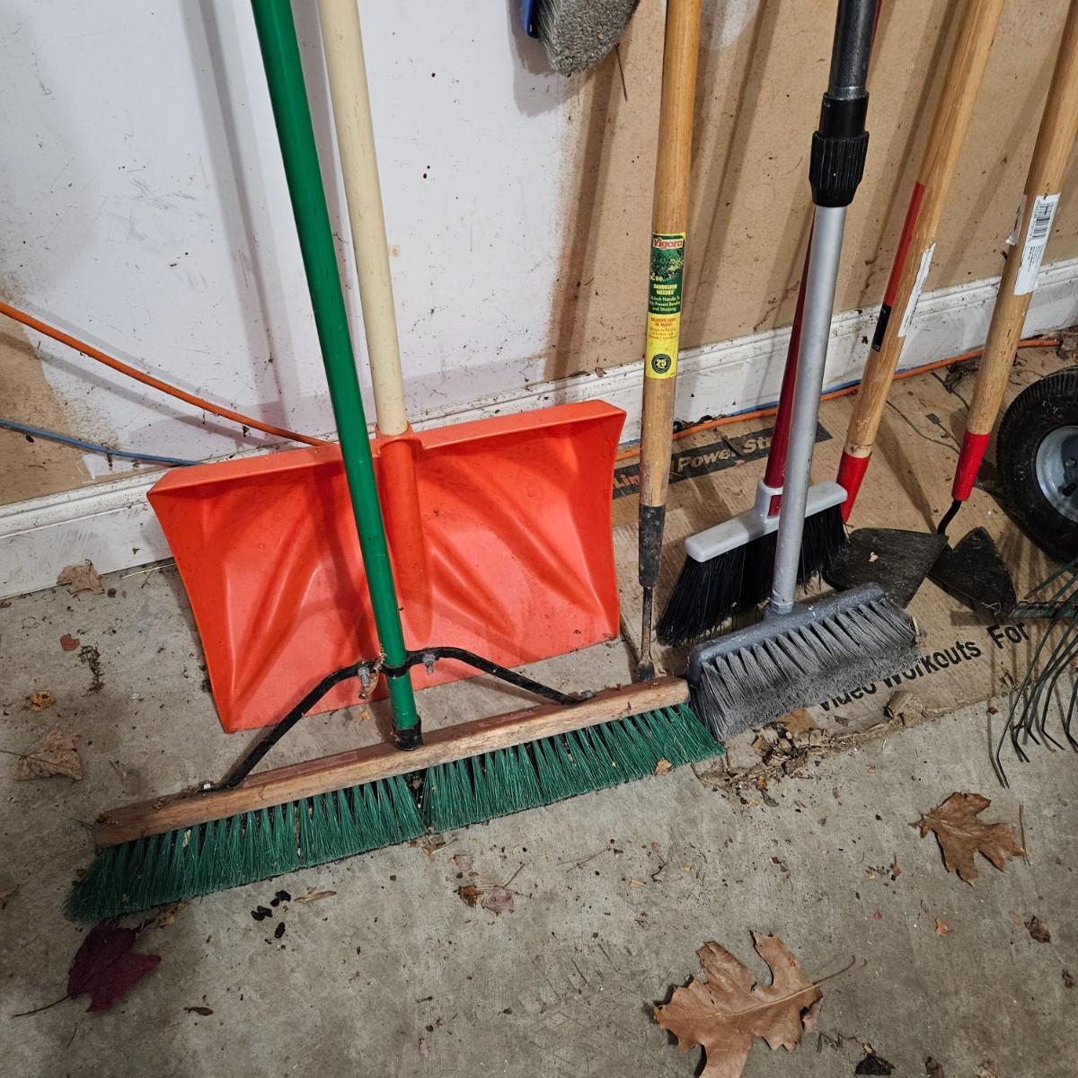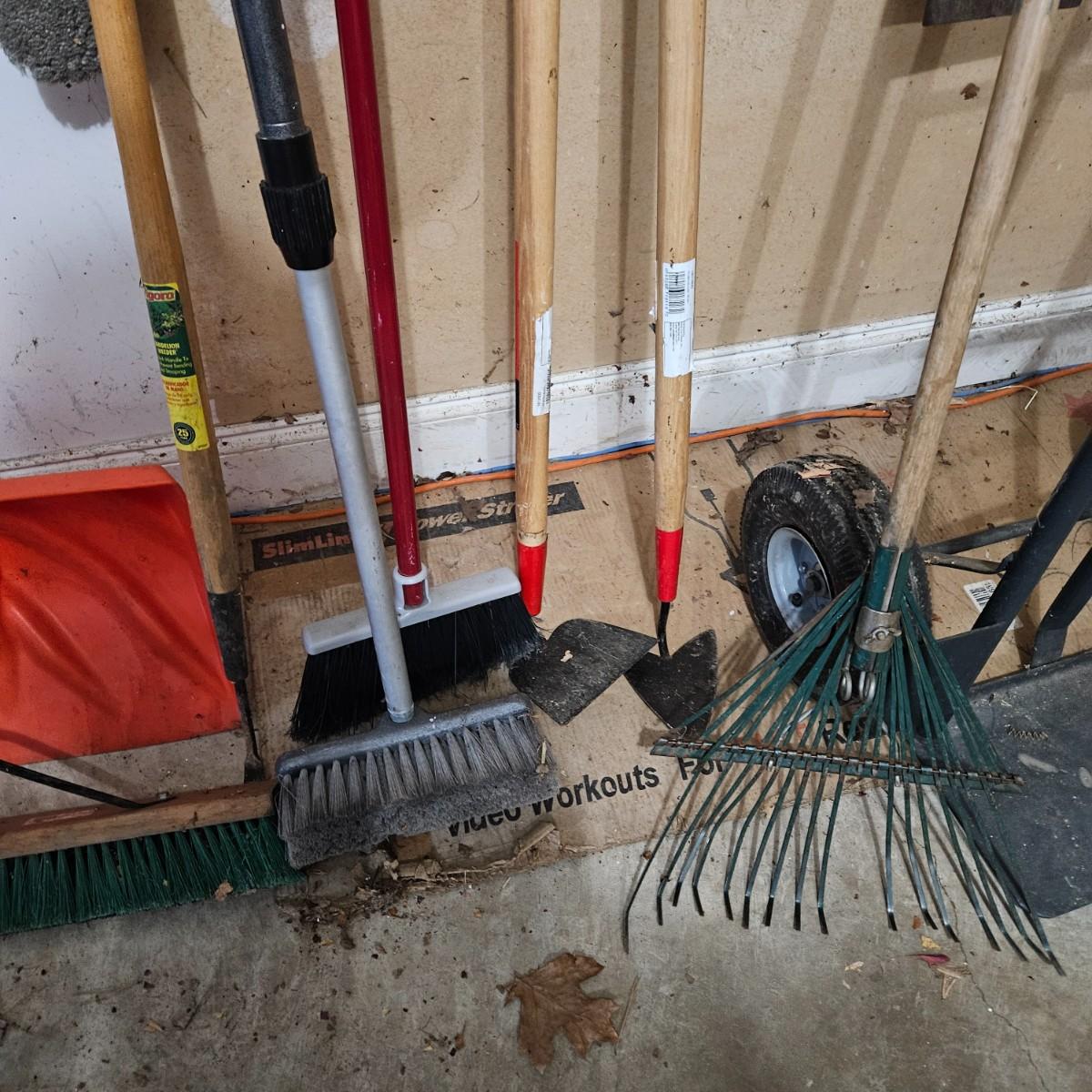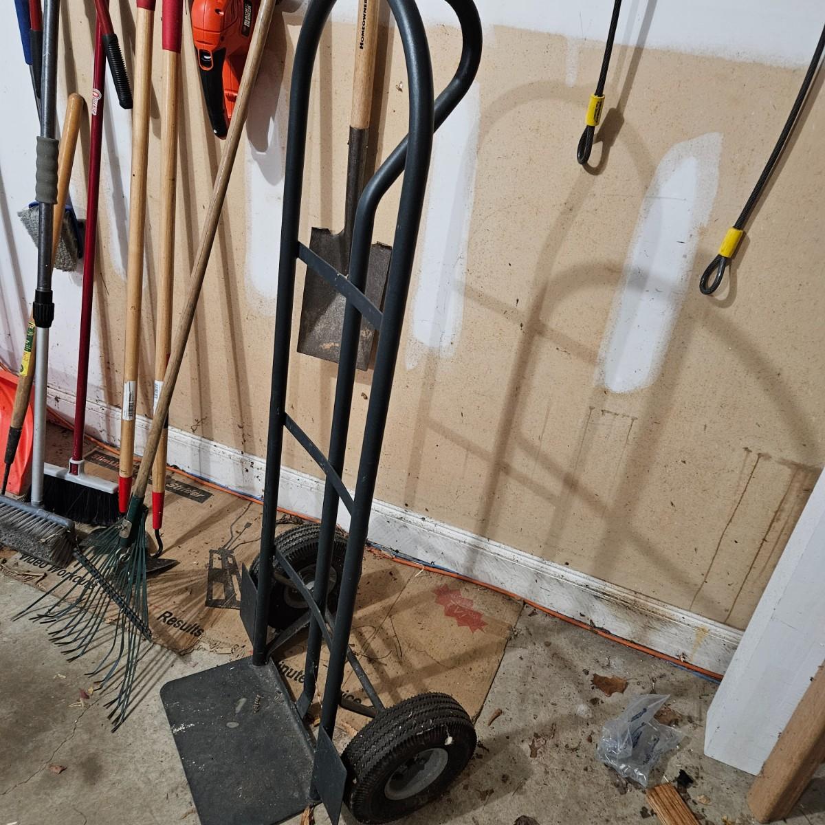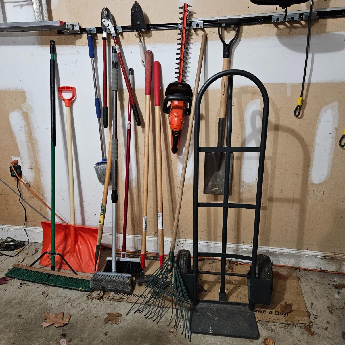 A Black&Decker hedge trimmer that powered on when plugged in. Also includes a metal hand truck that currently has flat tires. Also includes a rake, hoes, shovels, brooms and more. Hand truck measures approximately 21.5" 18" x 52"H. Local pickup only