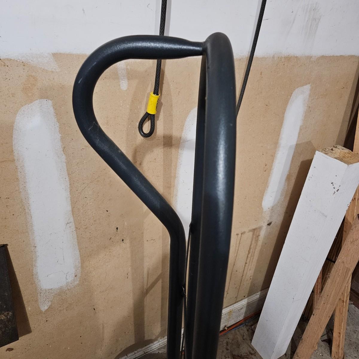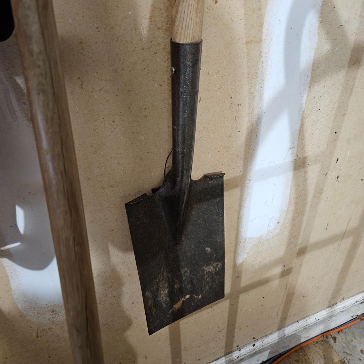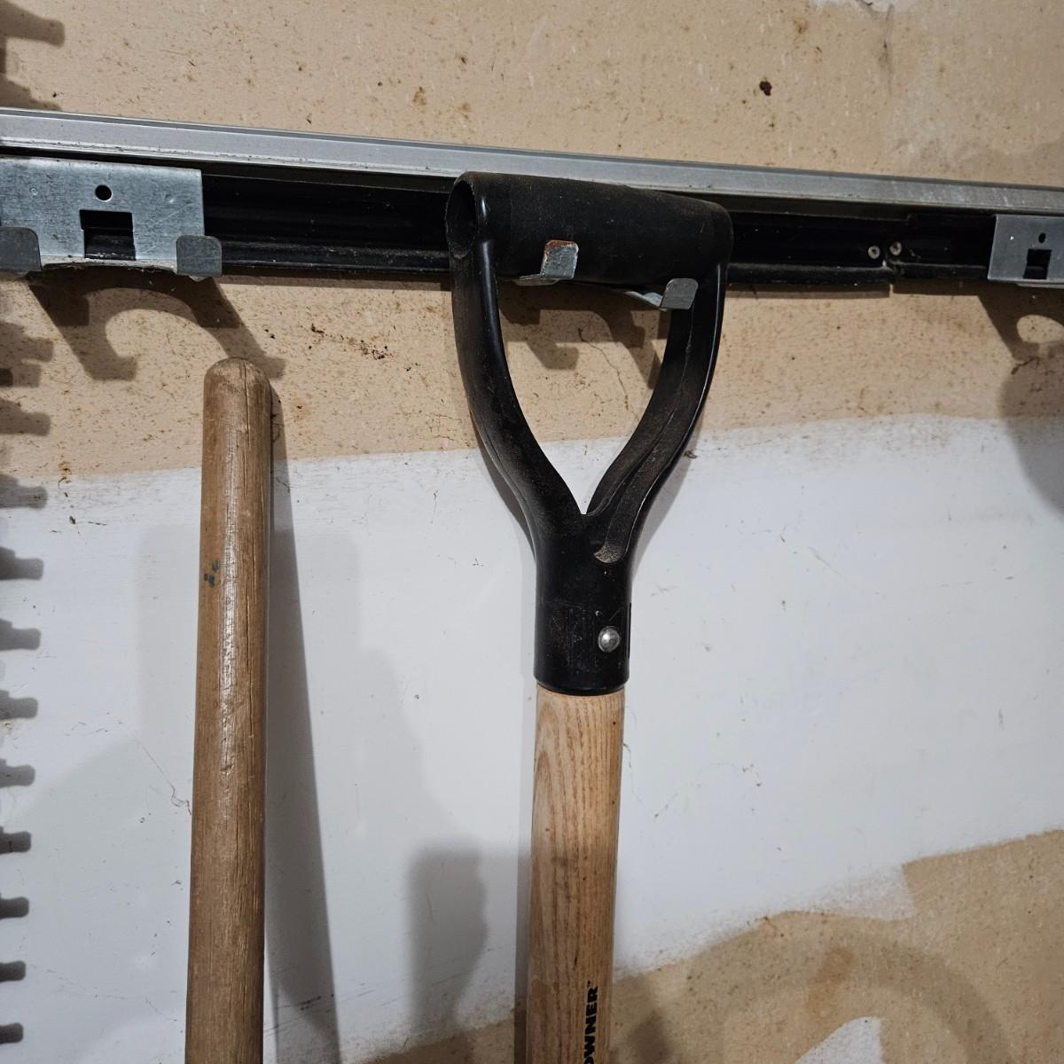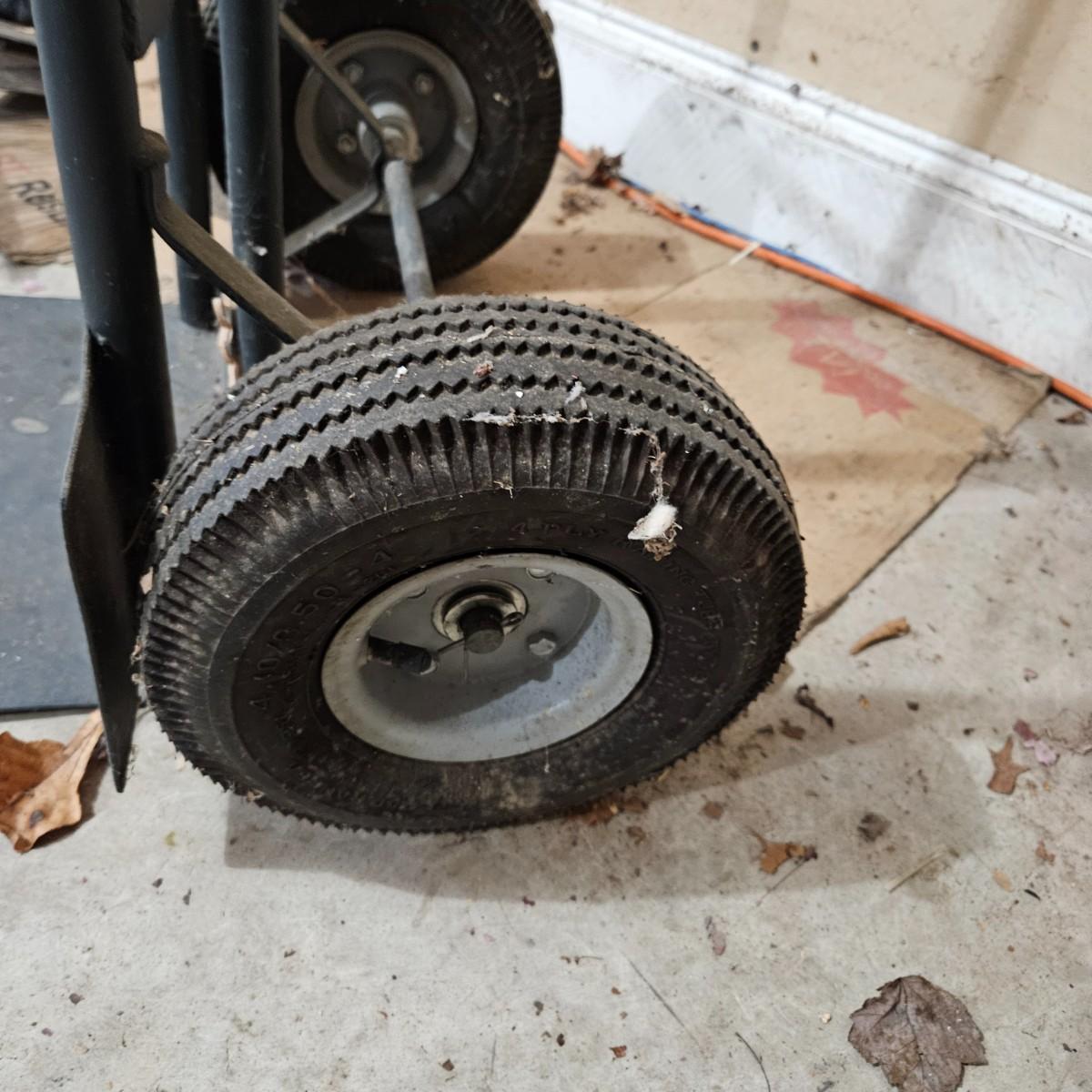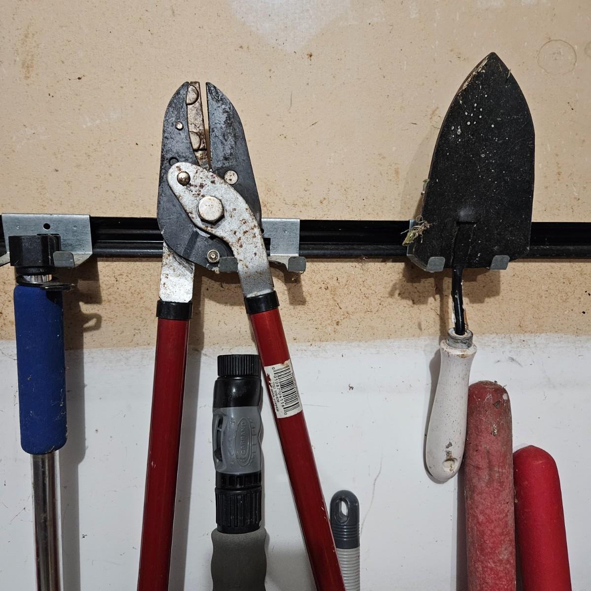 A Black&Decker hedge trimmer that powered on when plugged in. Also includes a metal hand truck that currently has flat tires. Also includes a rake, hoes, shovels, brooms and more. Hand truck measures approximately 21.5" 18" x 52"H. Local pickup only