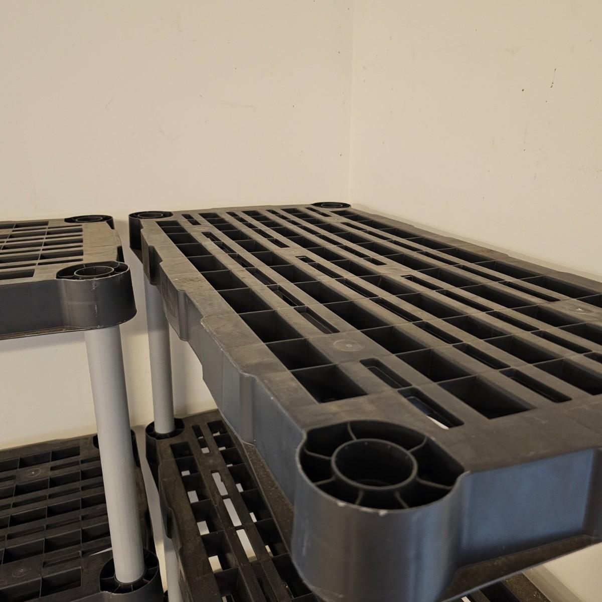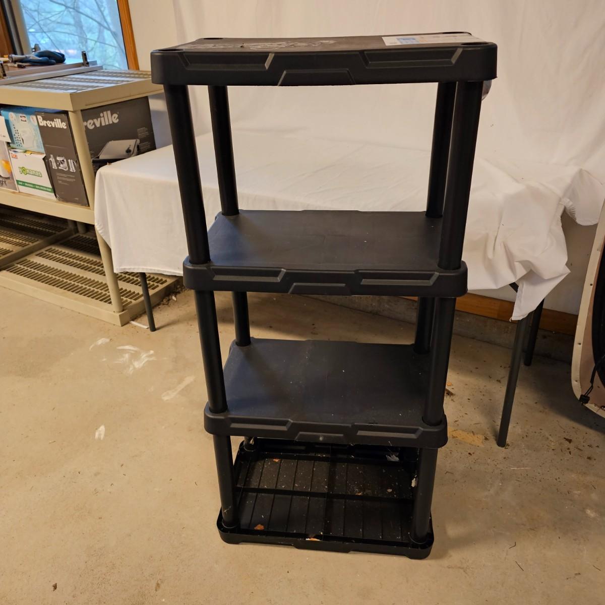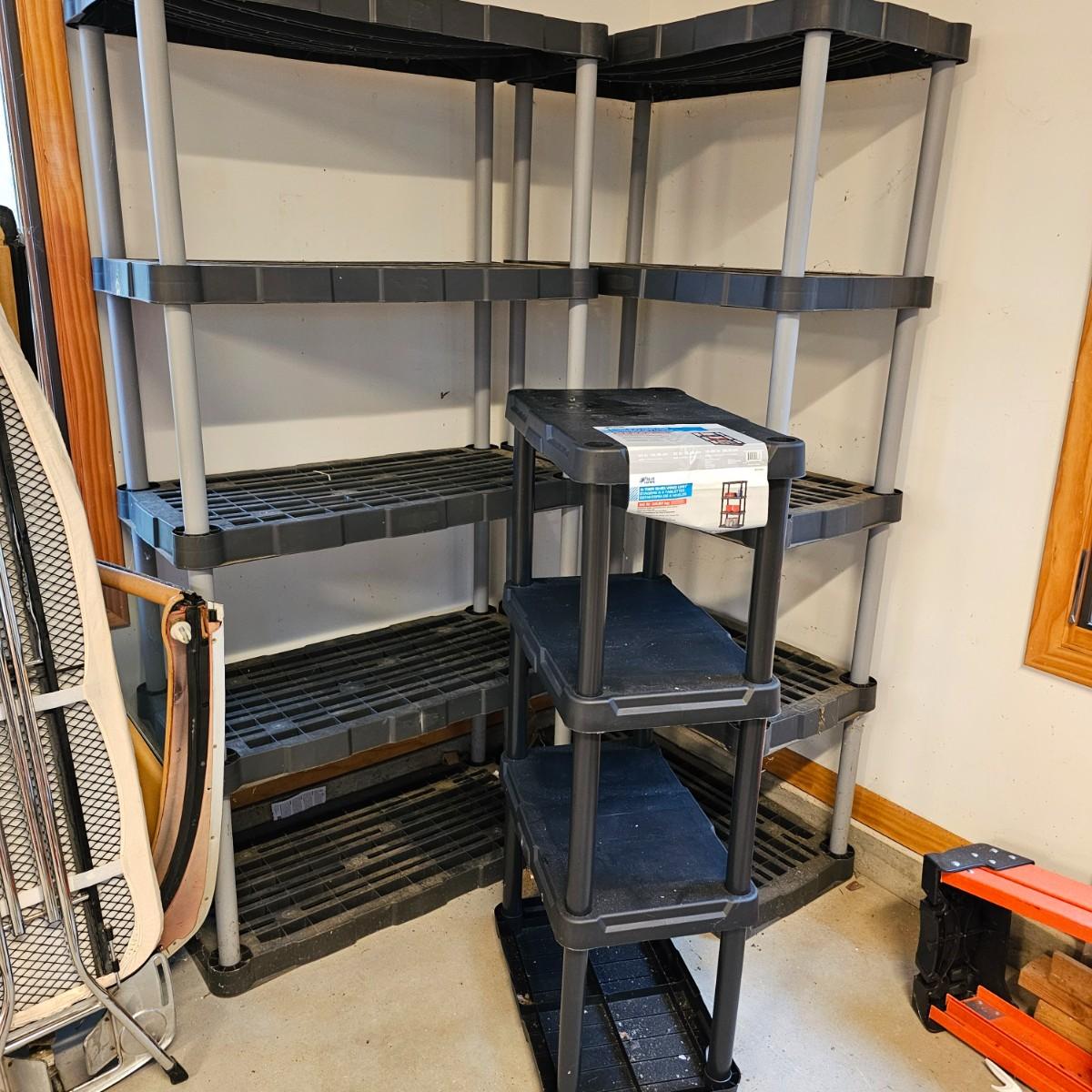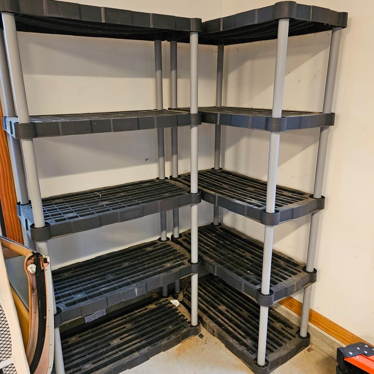 Three sets of plastic shelving, suitable for garage or other. Small black unit measures 22" x 14.25" x 47" H, has solid shelves. Larger black/gray units are each 36" x 18" x 73" H, have open grid shelves. See photos for details. Local pickup only.