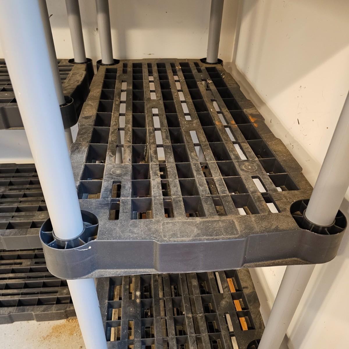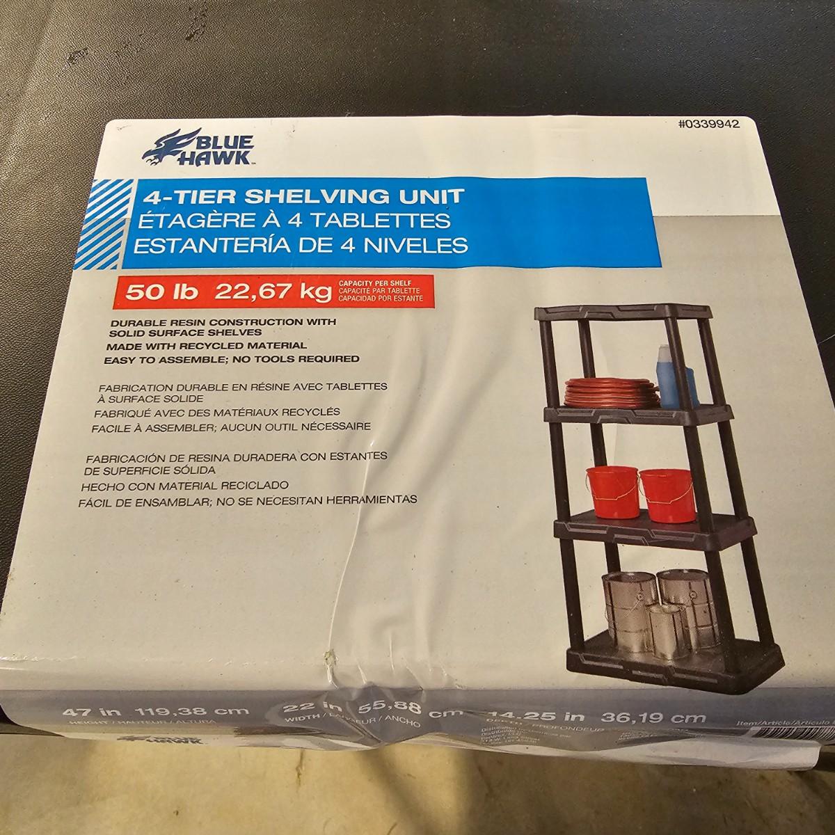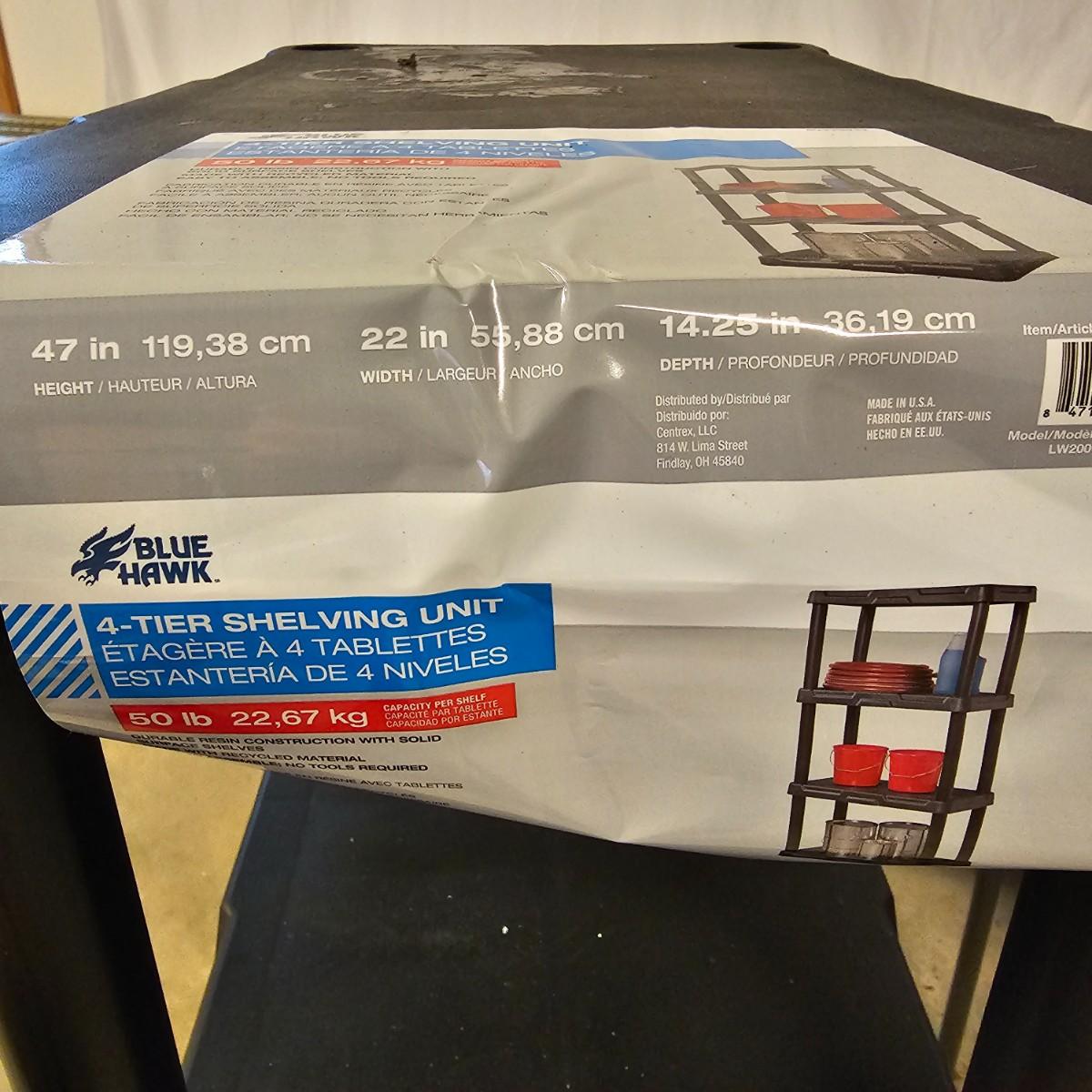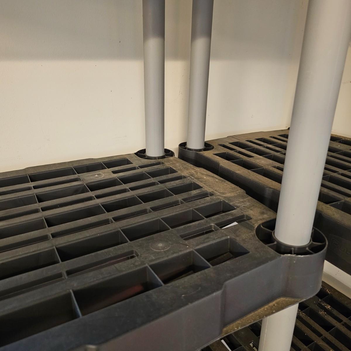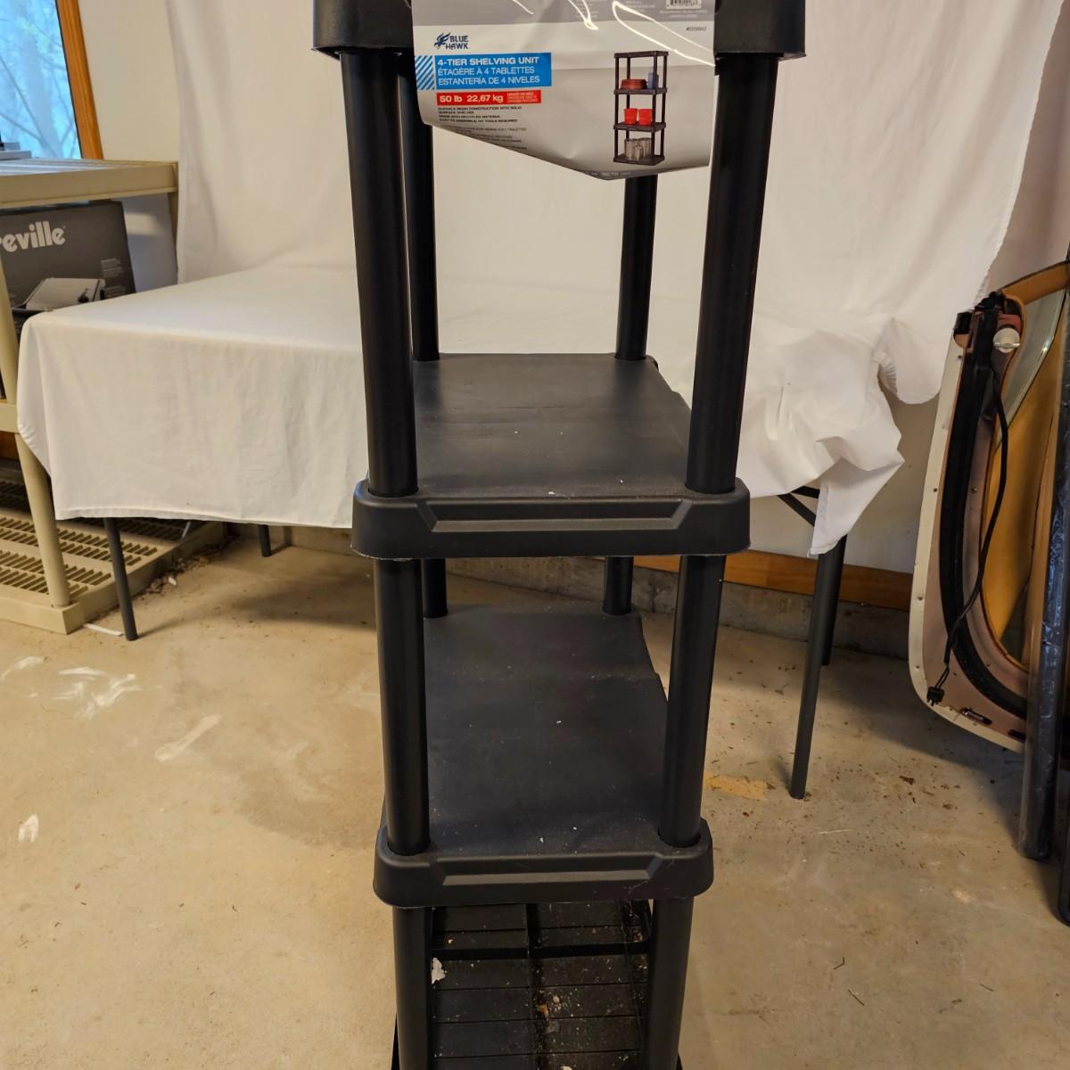 Three sets of plastic shelving, suitable for garage or other. Small black unit measures 22" x 14.25" x 47" H, has solid shelves. Larger black/gray units are each 36" x 18" x 73" H, have open grid shelves. See photos for details. Local pickup only.