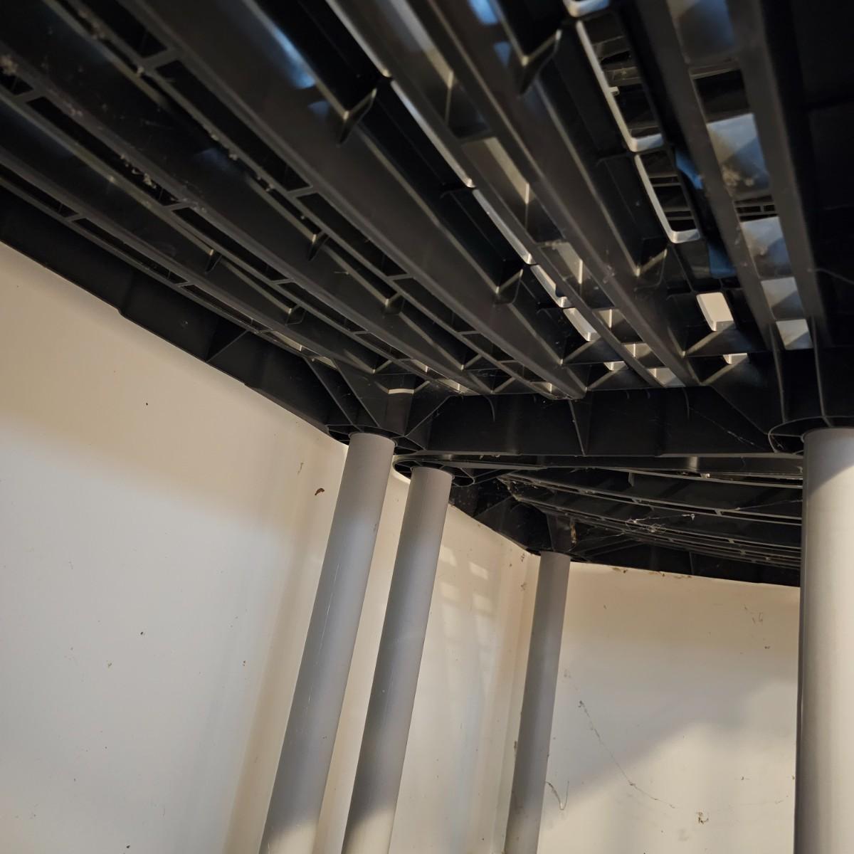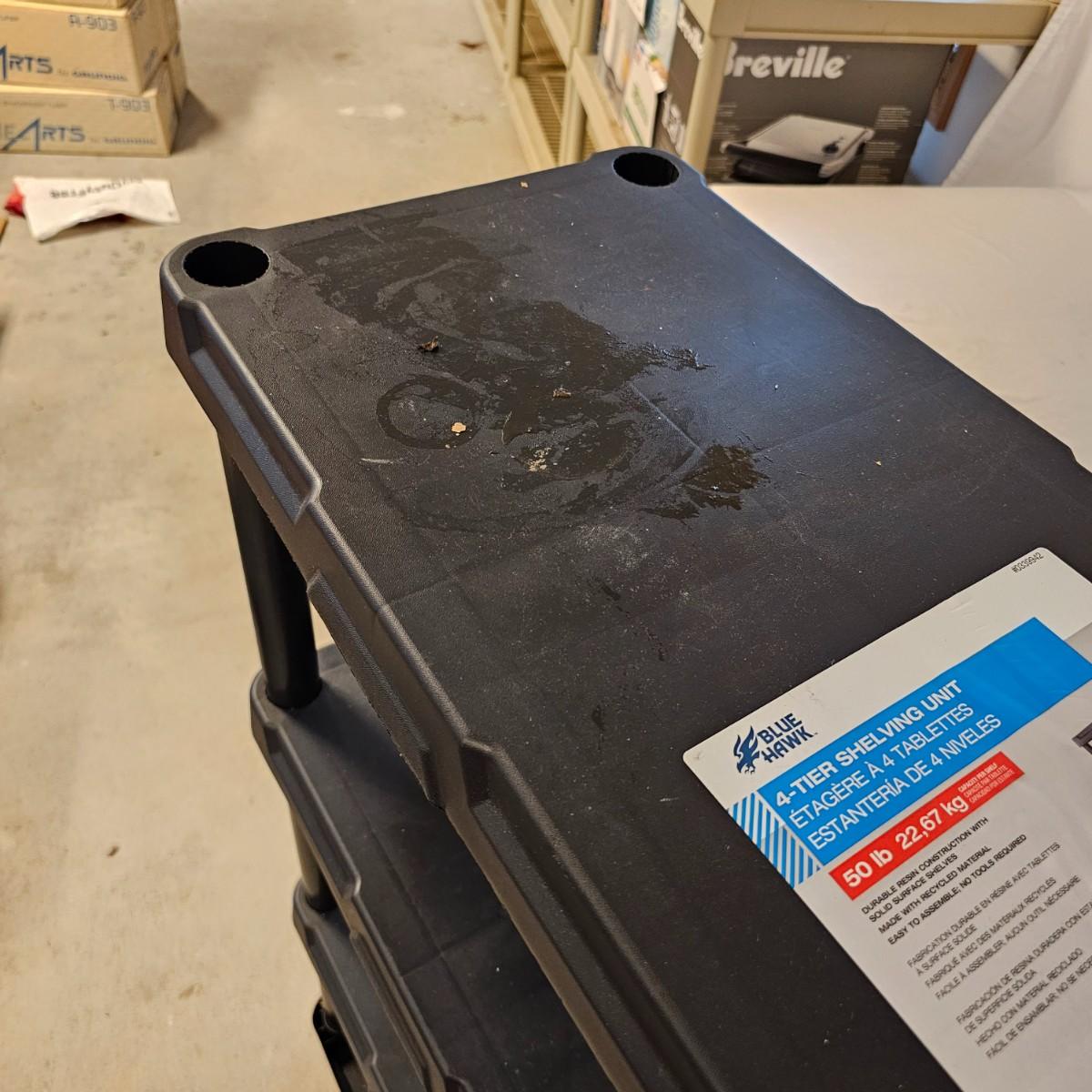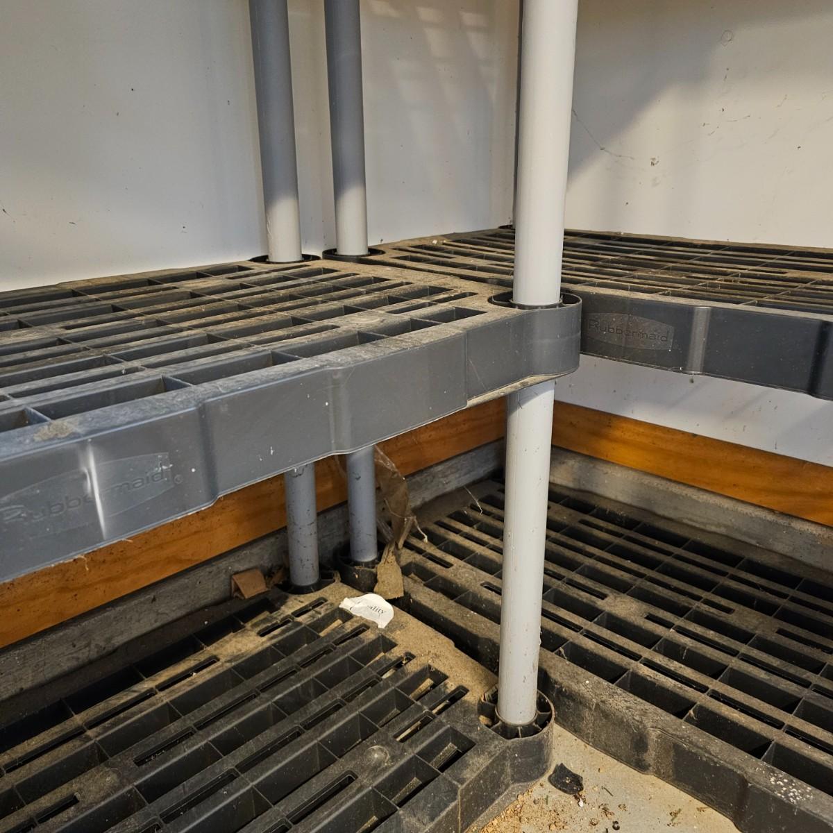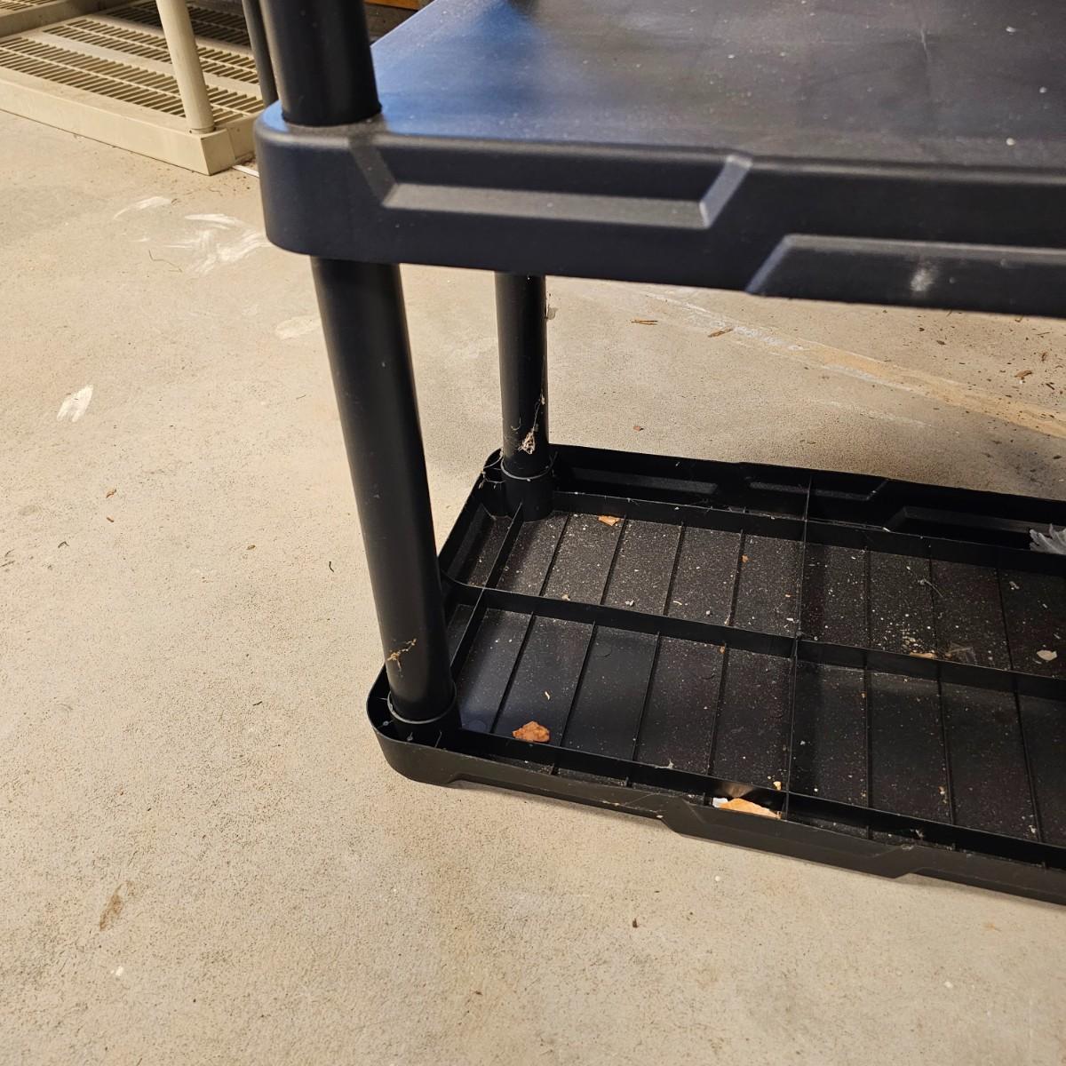 Three sets of plastic shelving, suitable for garage or other. Small black unit measures 22" x 14.25" x 47" H, has solid shelves. Larger black/gray units are each 36" x 18" x 73" H, have open grid shelves. See photos for details. Local pickup only.