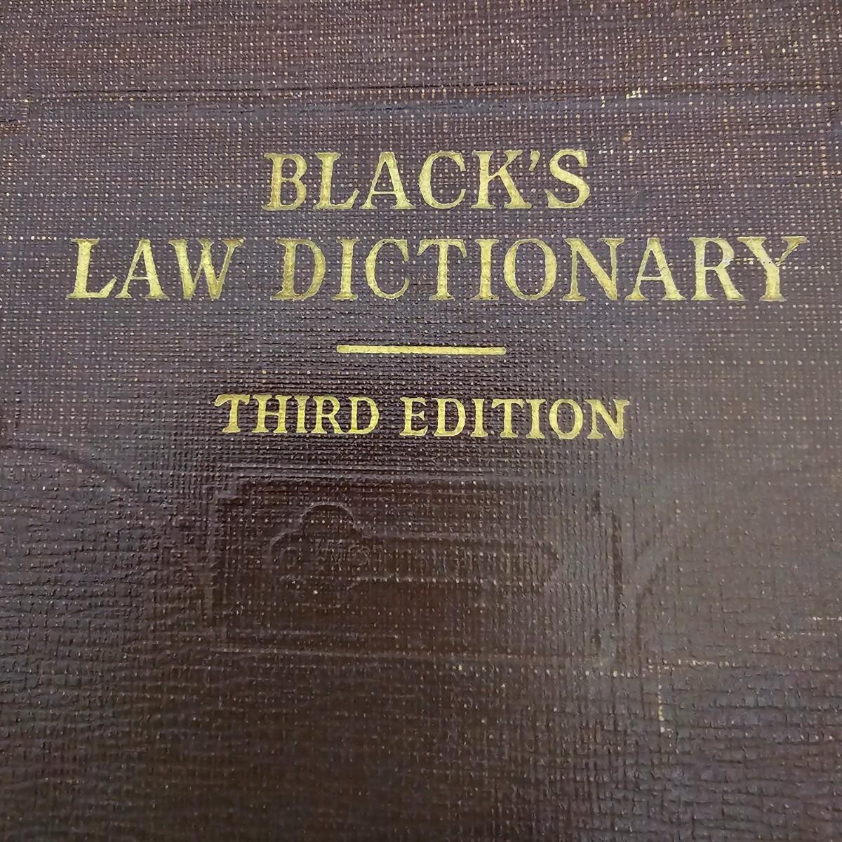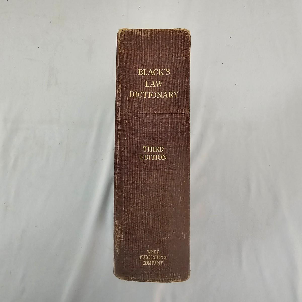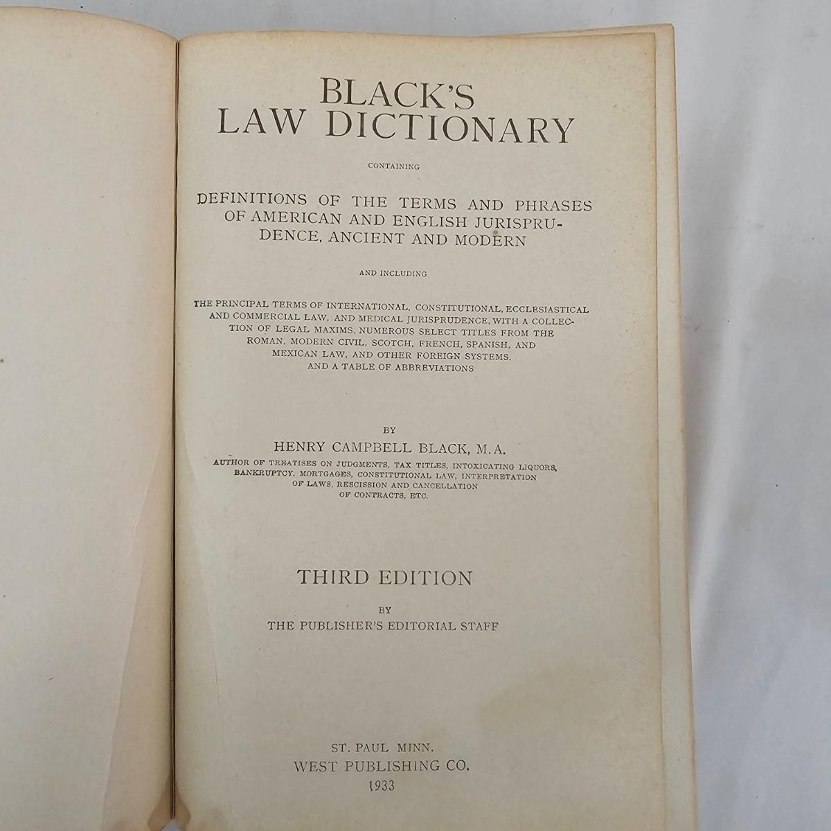 Third edition of the law dictionary by Henry Campbell Black. The original was first published in 1891, this volume in 1933. Clothbound hardcover book has seen much use, has some staining and scribbled pages. See photos for details. Shipping available.