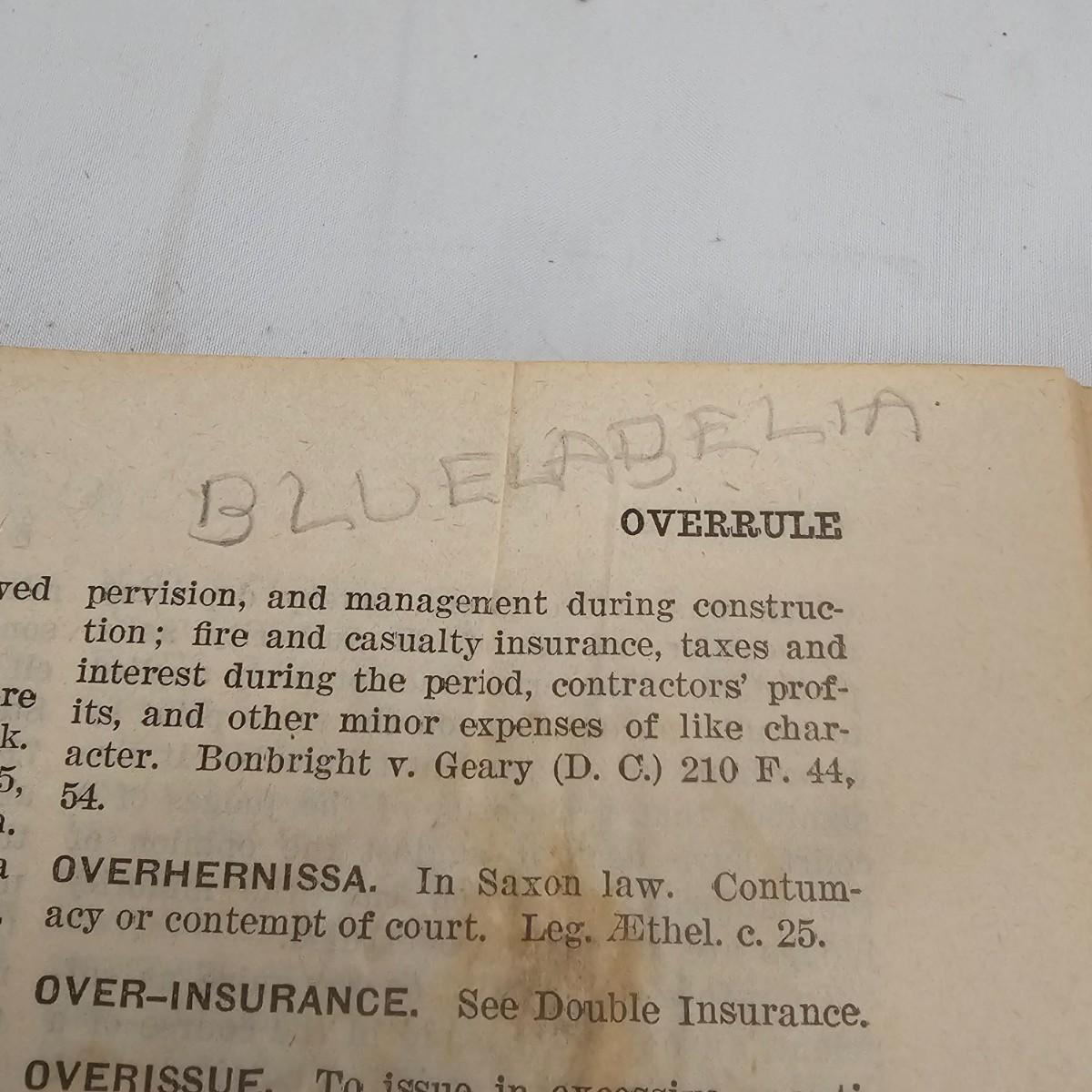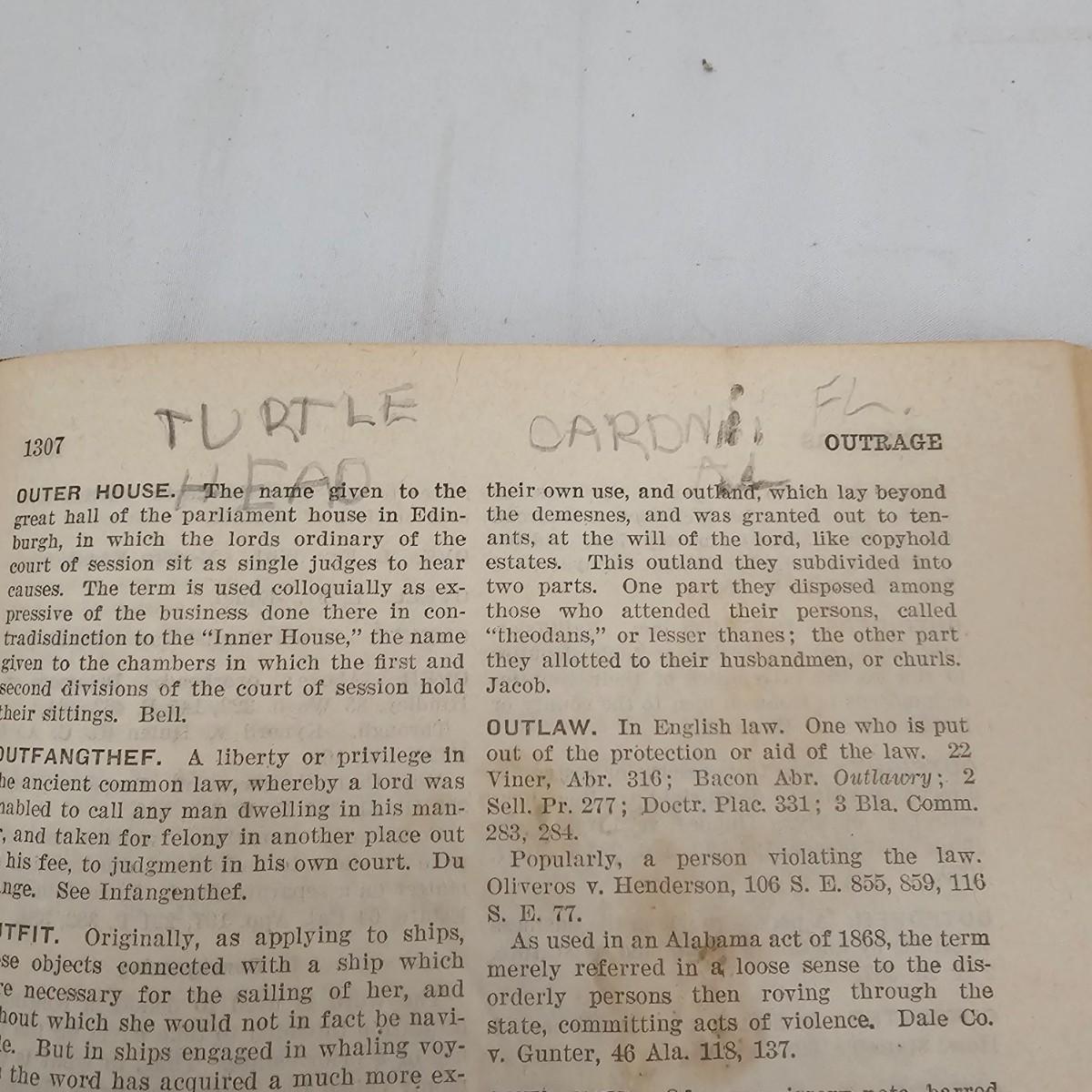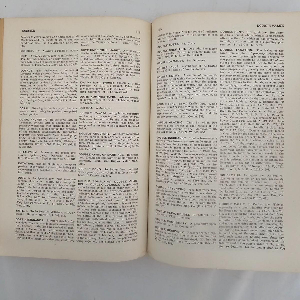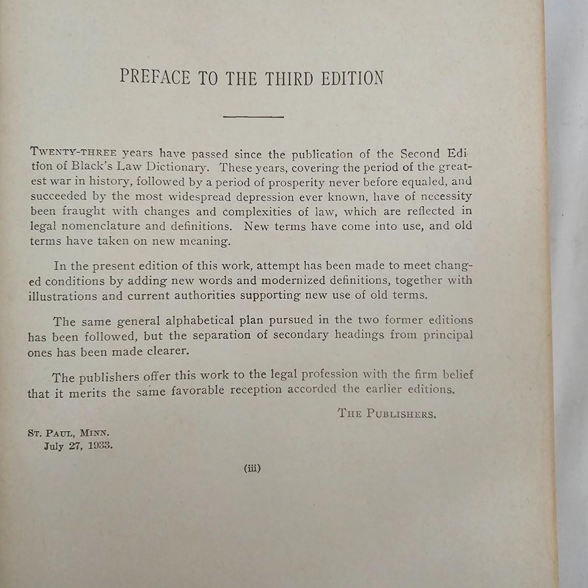 Third edition of the law dictionary by Henry Campbell Black. The original was first published in 1891, this volume in 1933. Clothbound hardcover book has seen much use, has some staining and scribbled pages. See photos for details. Shipping available.