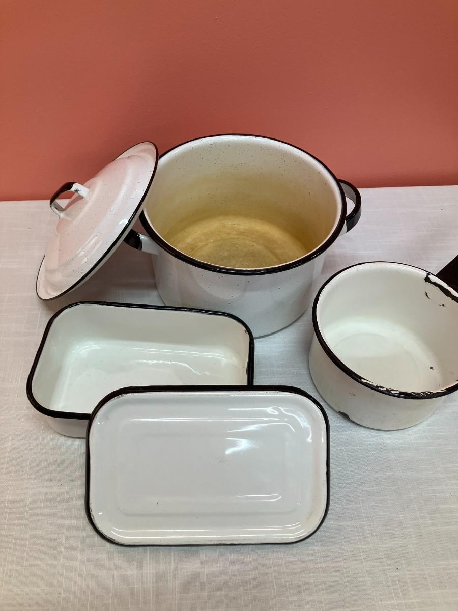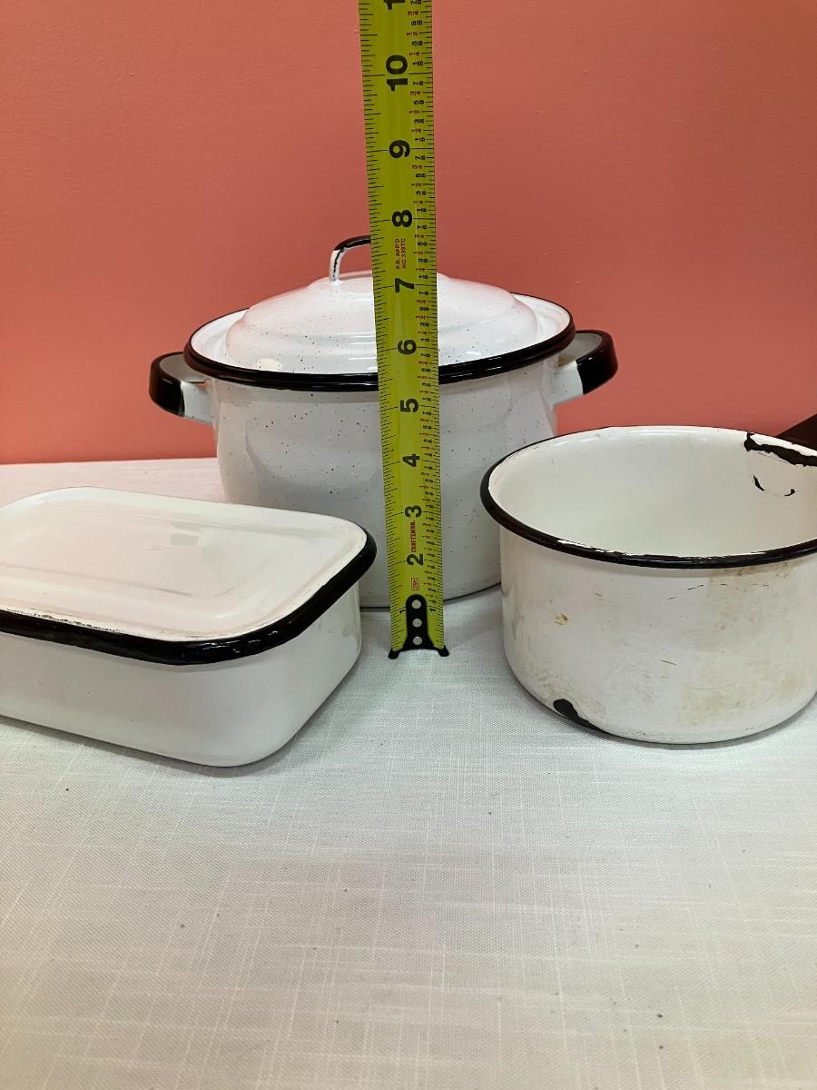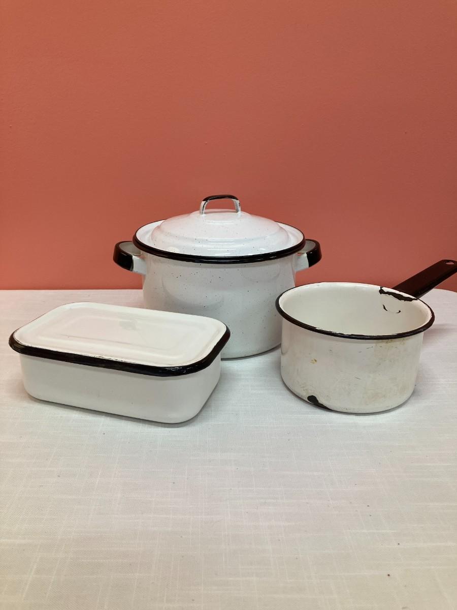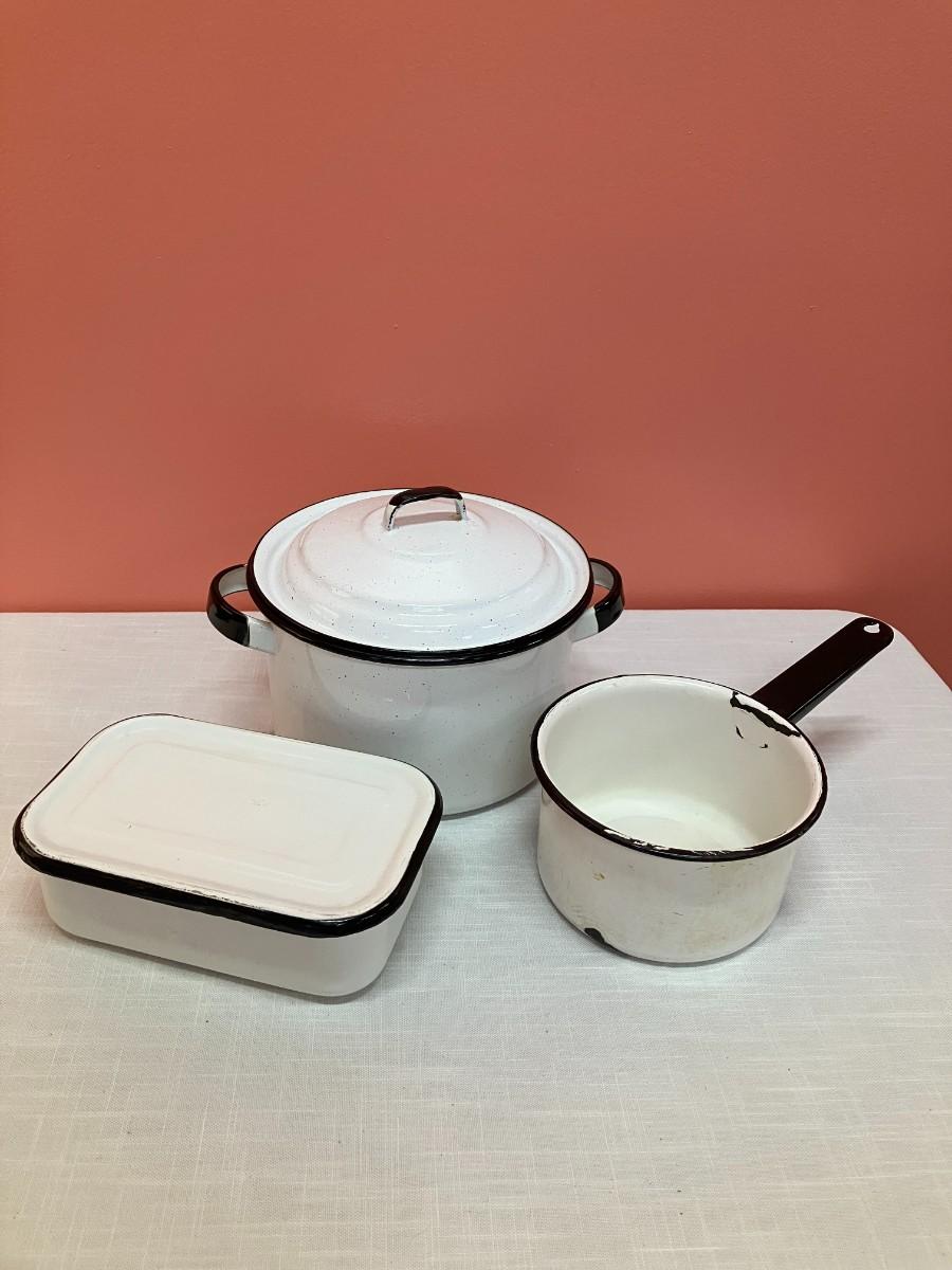 Set of 3 pieces (1 with lid) of black/white enamel cookware