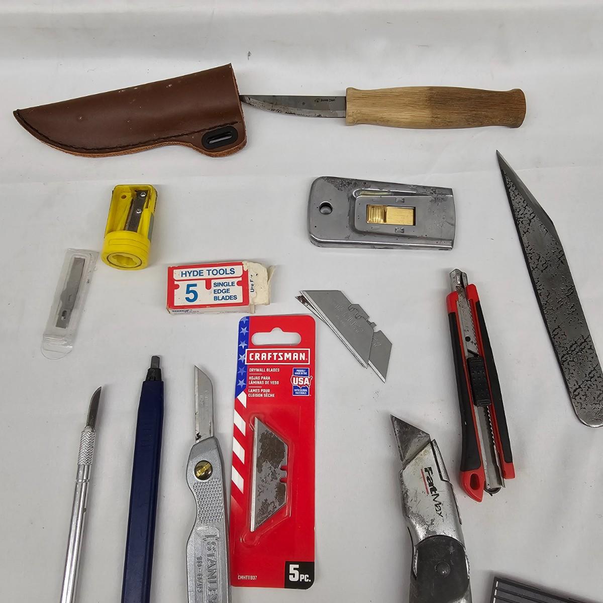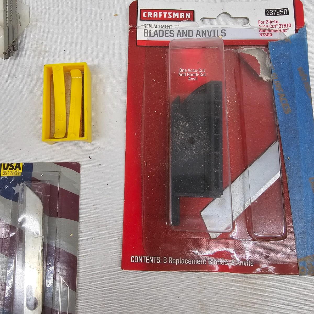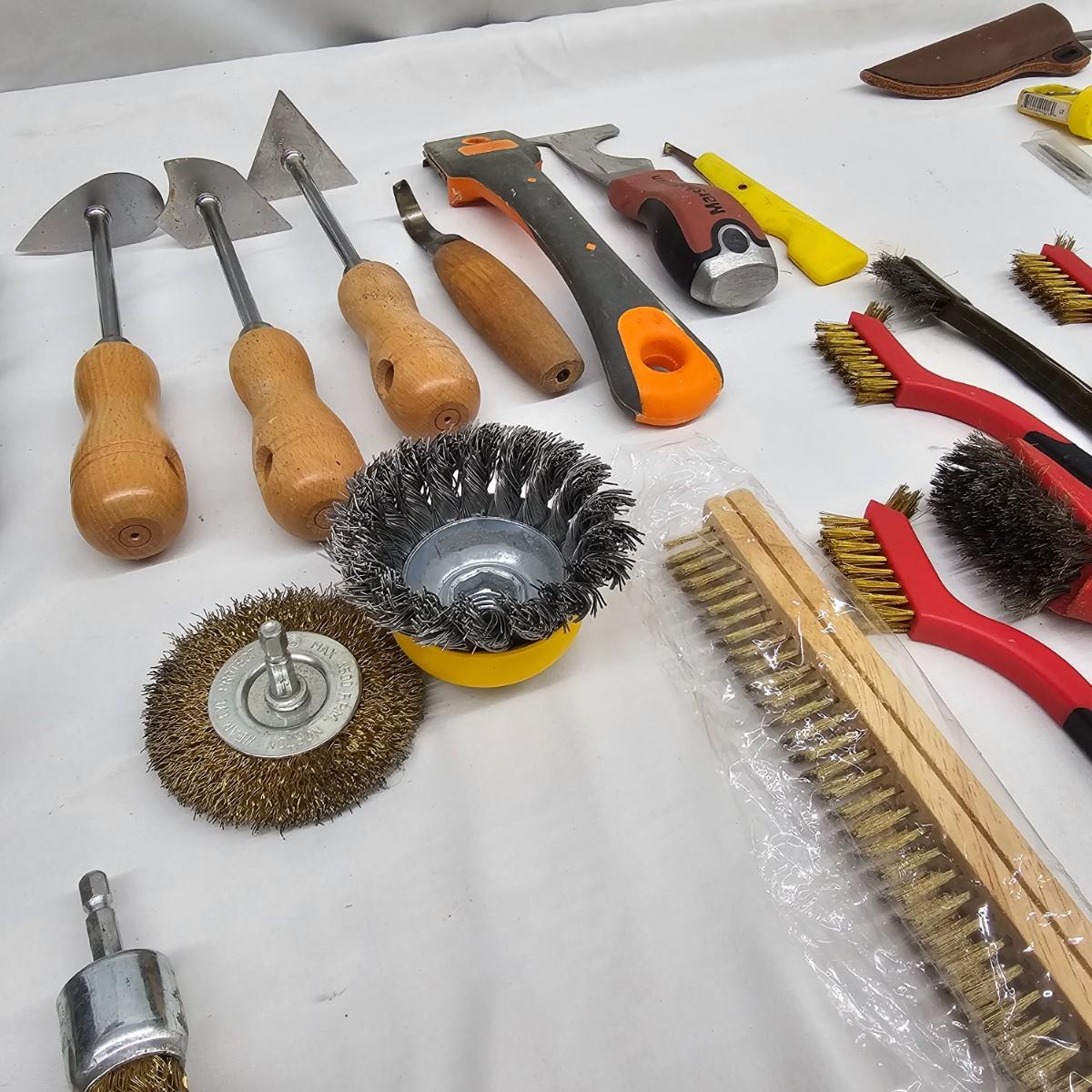 Wire brushes, both hand and drill style. Cabinet scrapers and blades, utility knife and blades, a set of mini picks and more. Items by Craftsman, Rockler and others. See photos for details. Local pickup only.