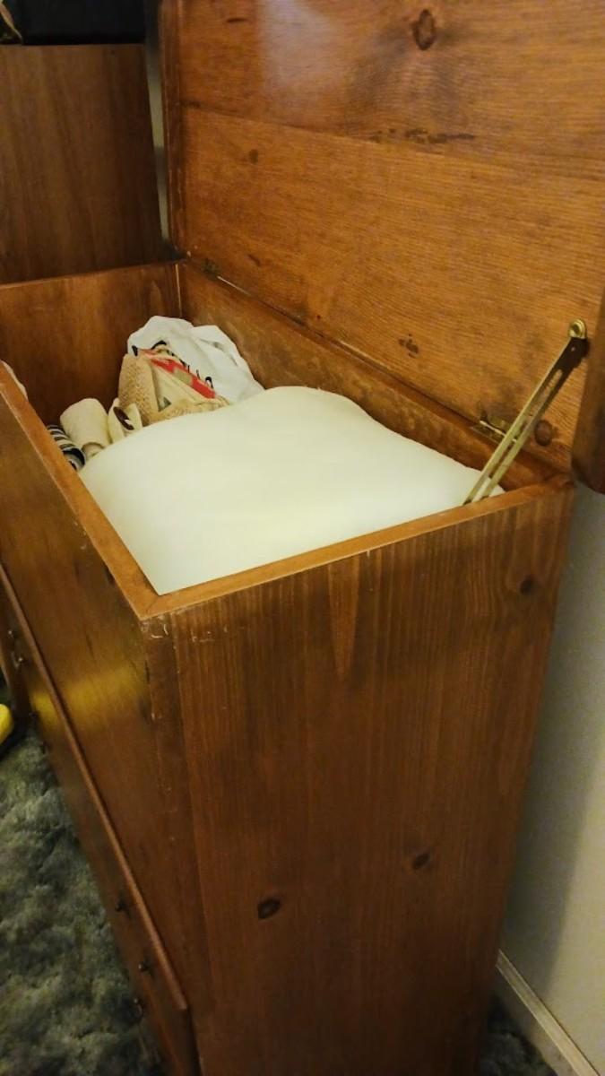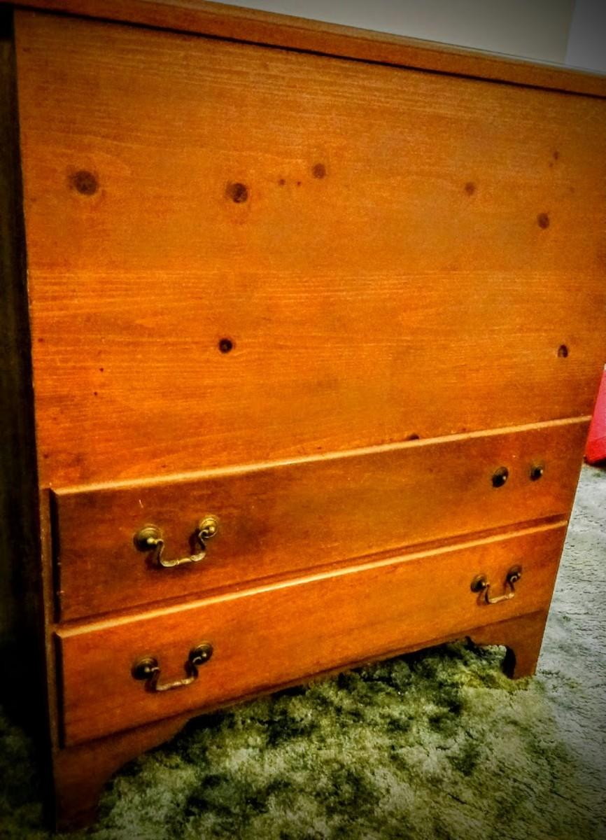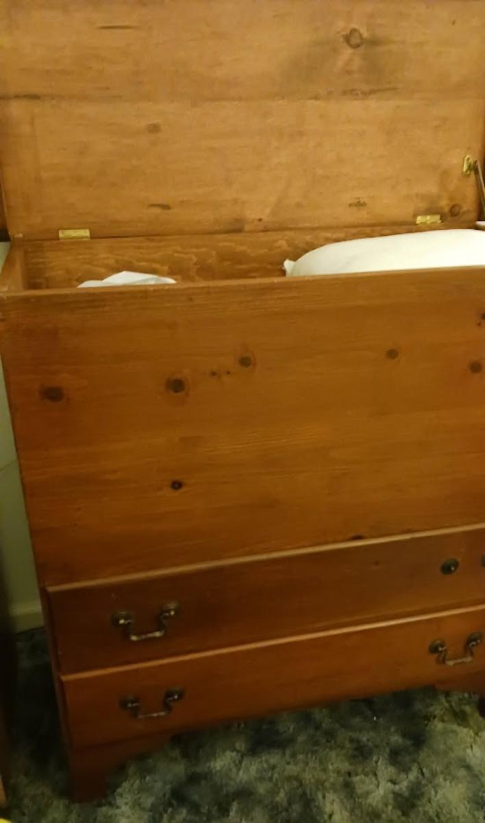 Solid pine, upper chest, 2 drawers below. 36" w x 15" d x 36.5 h. Missing handle on one side. Items inside chest not included in sale.