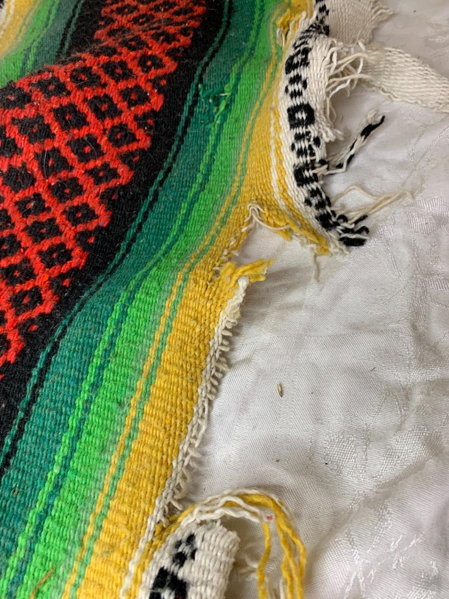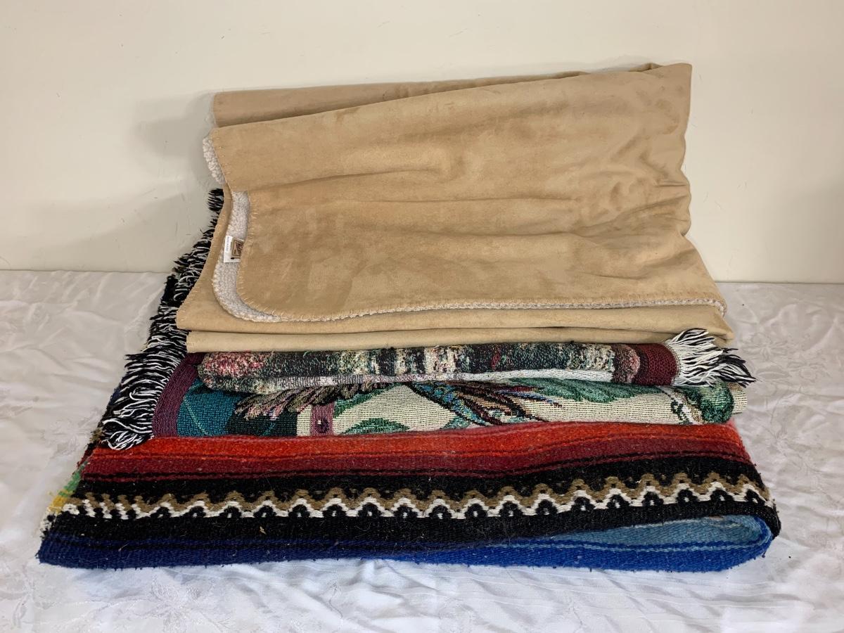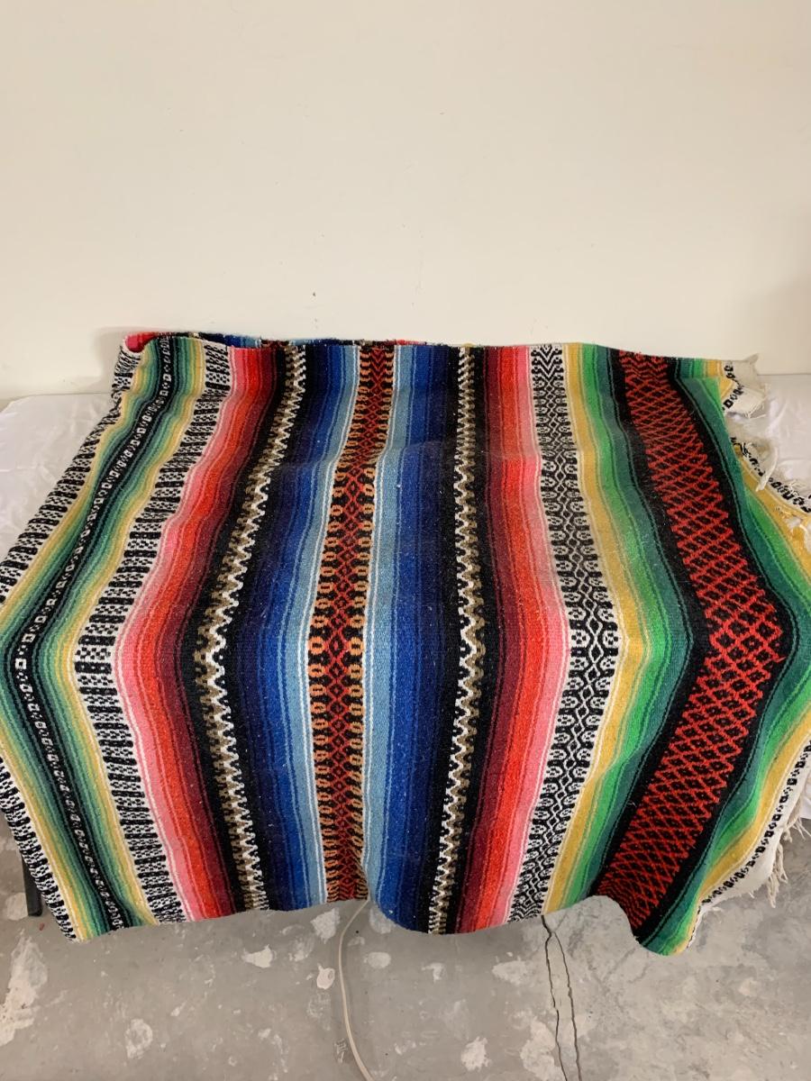 4 blankets all in good condition. One wool blanket by Wool Rich (66 inches X 50 inches), one Mexican blanket (82 inches X 52 inches) **all need to be cleaned**