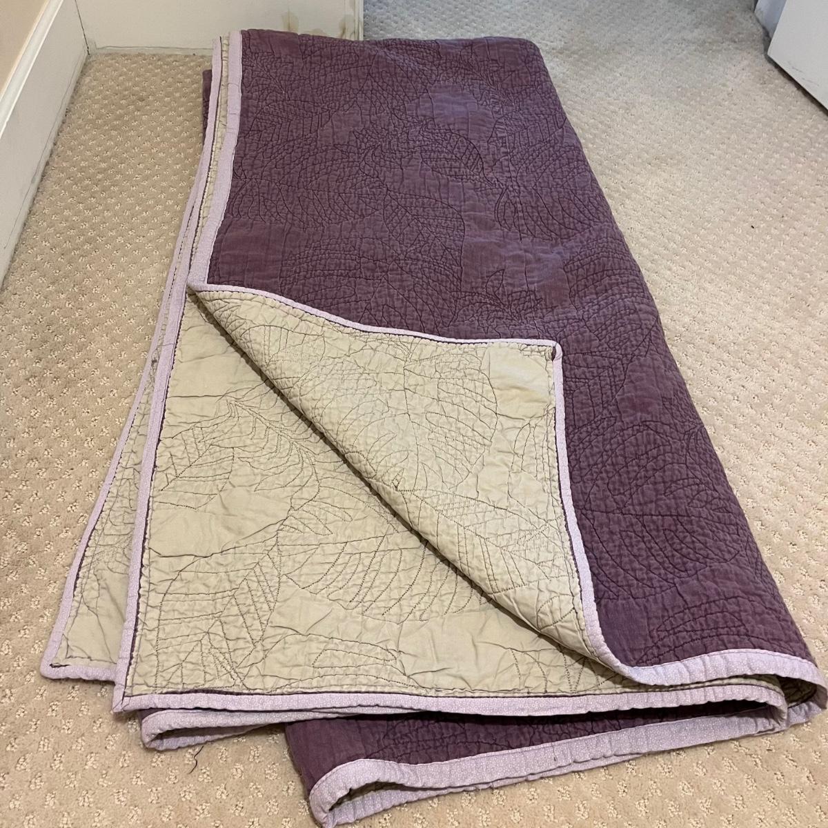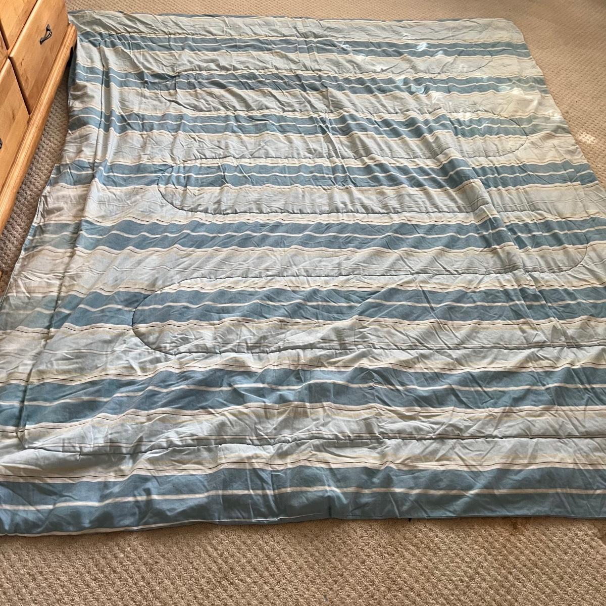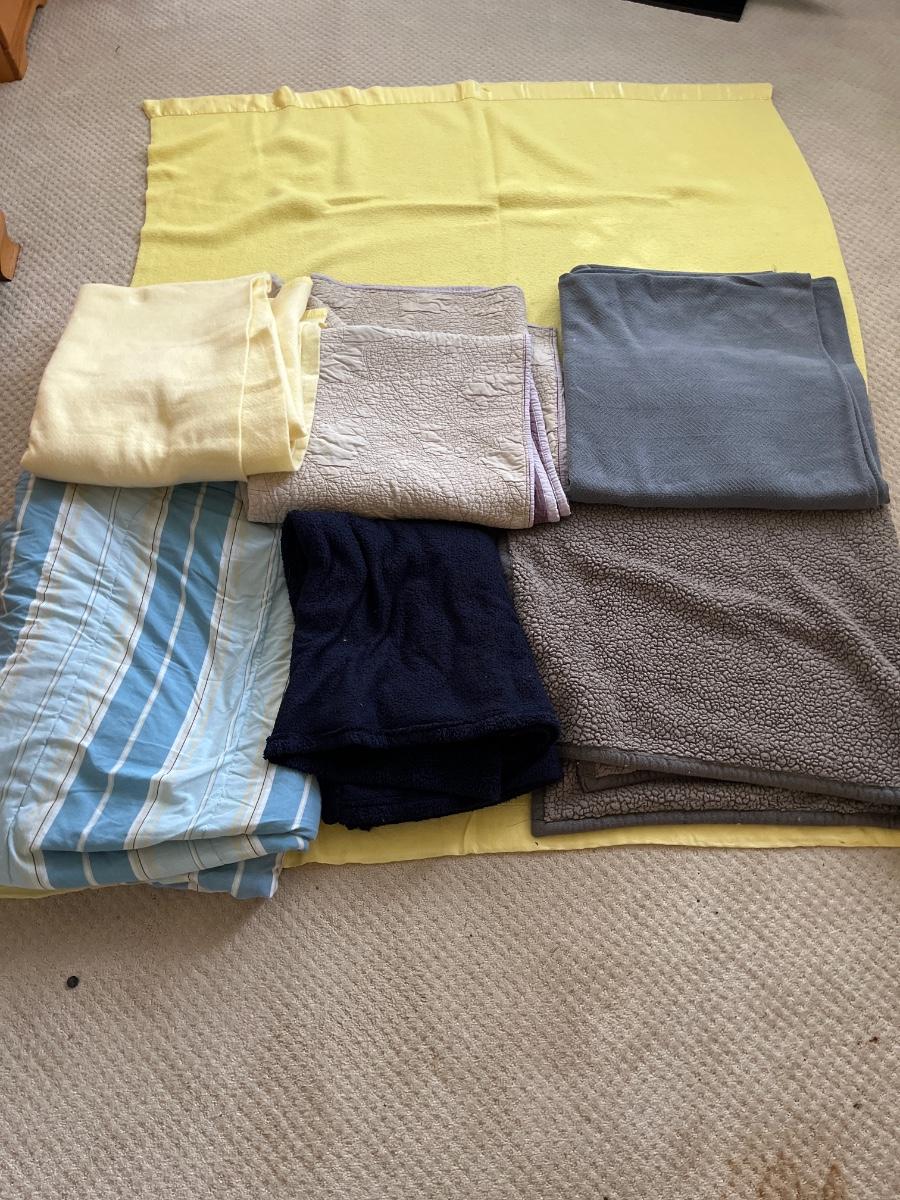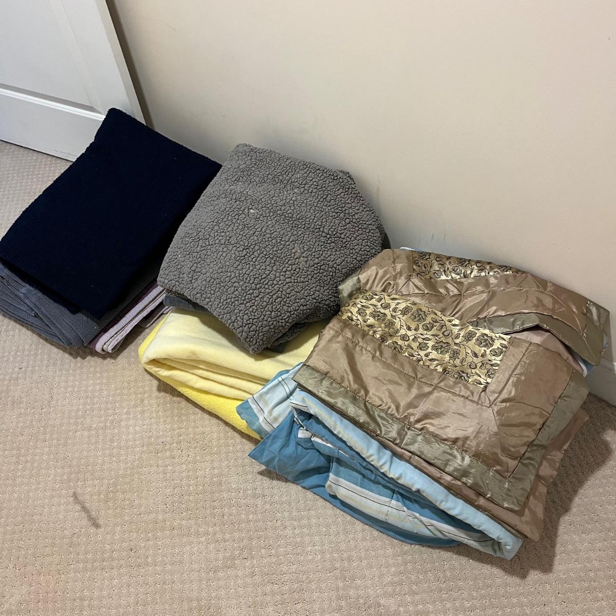 Lot includes a Pepperell blanket, striped comforter that measures 82” x 96”, two king shams, reversible blanket and four blankets.