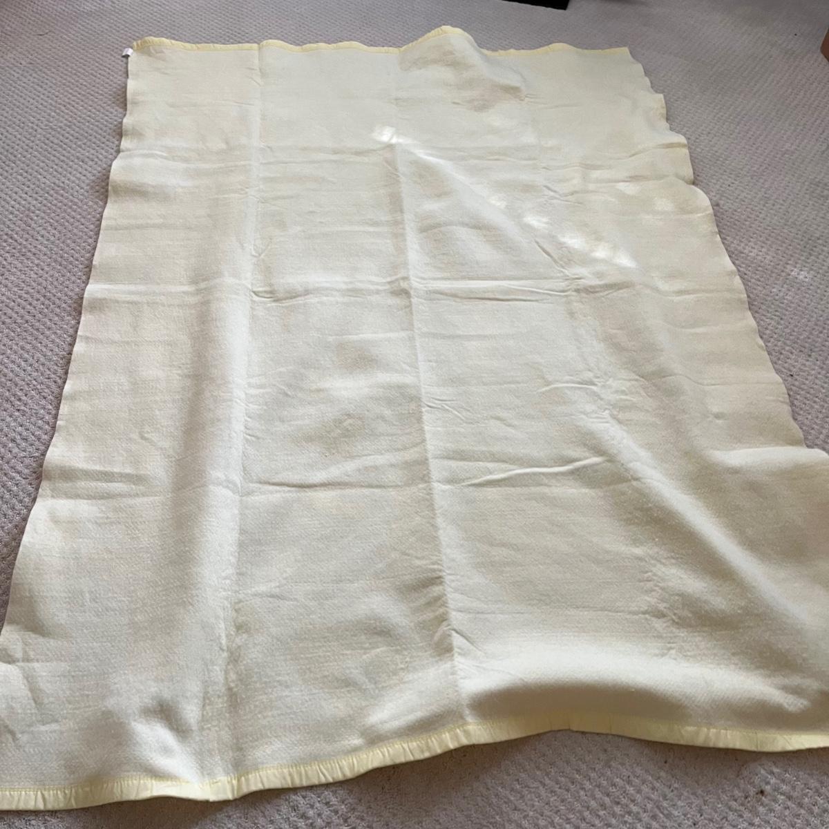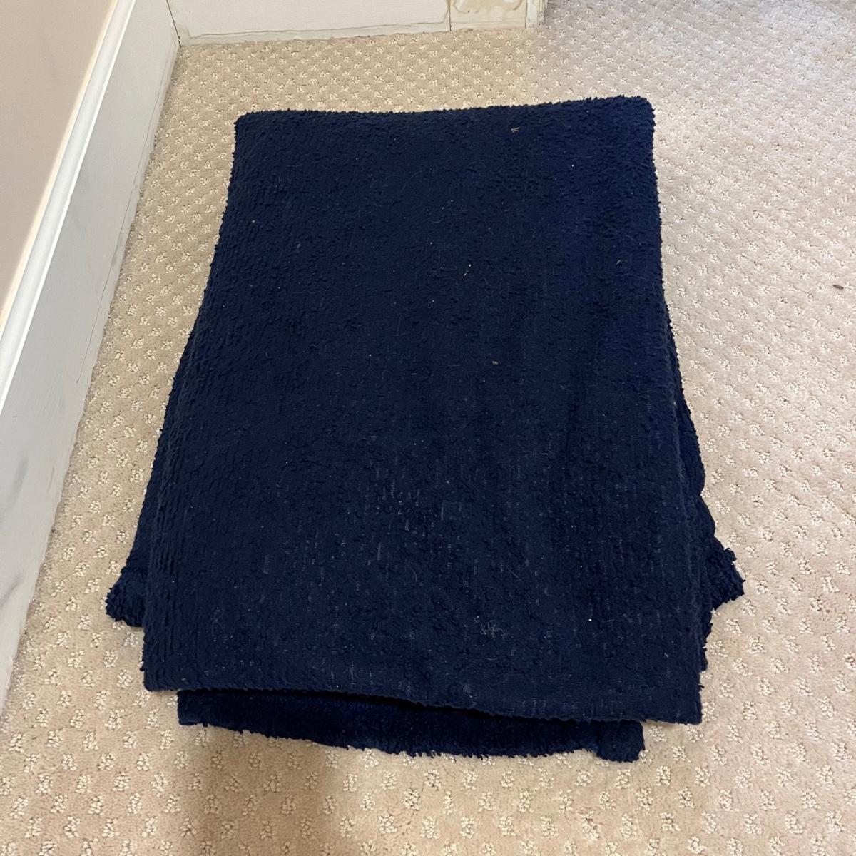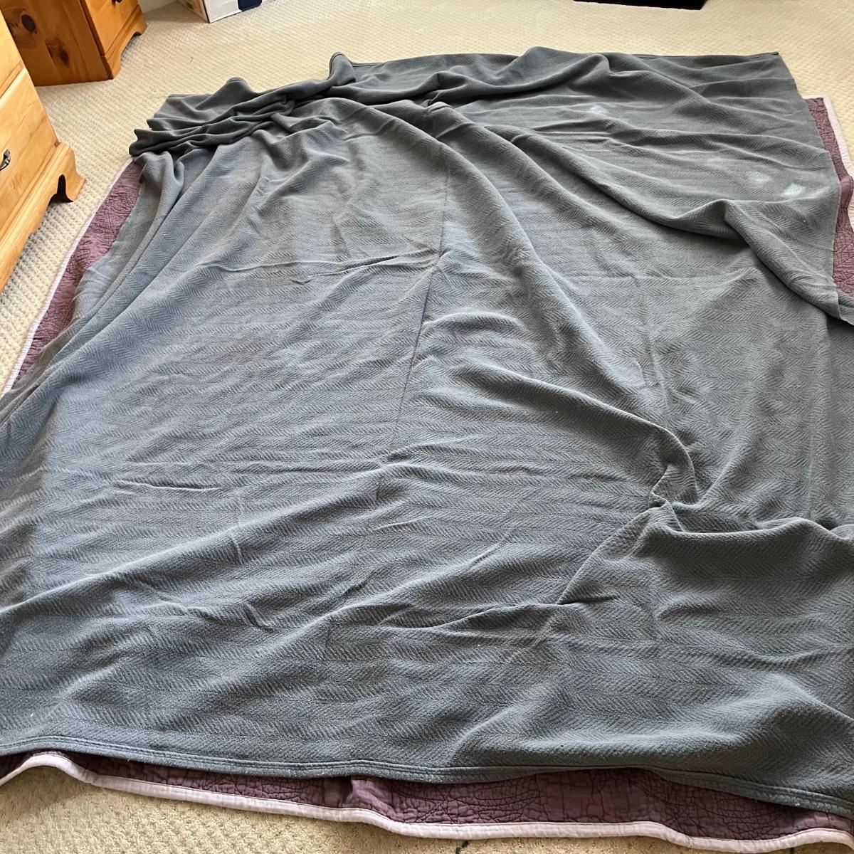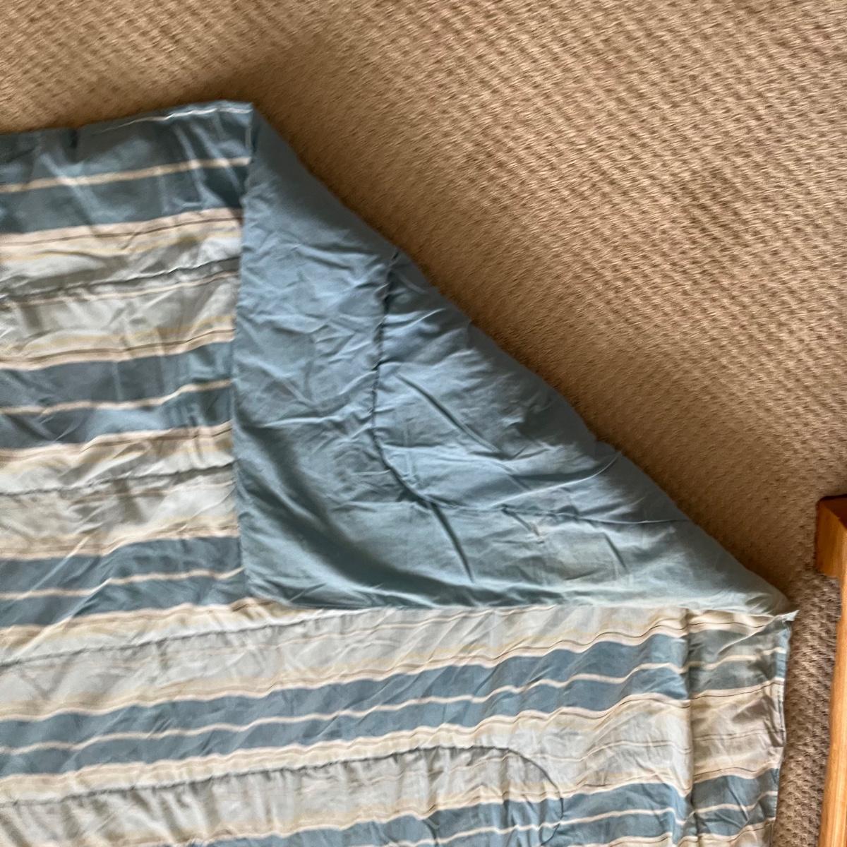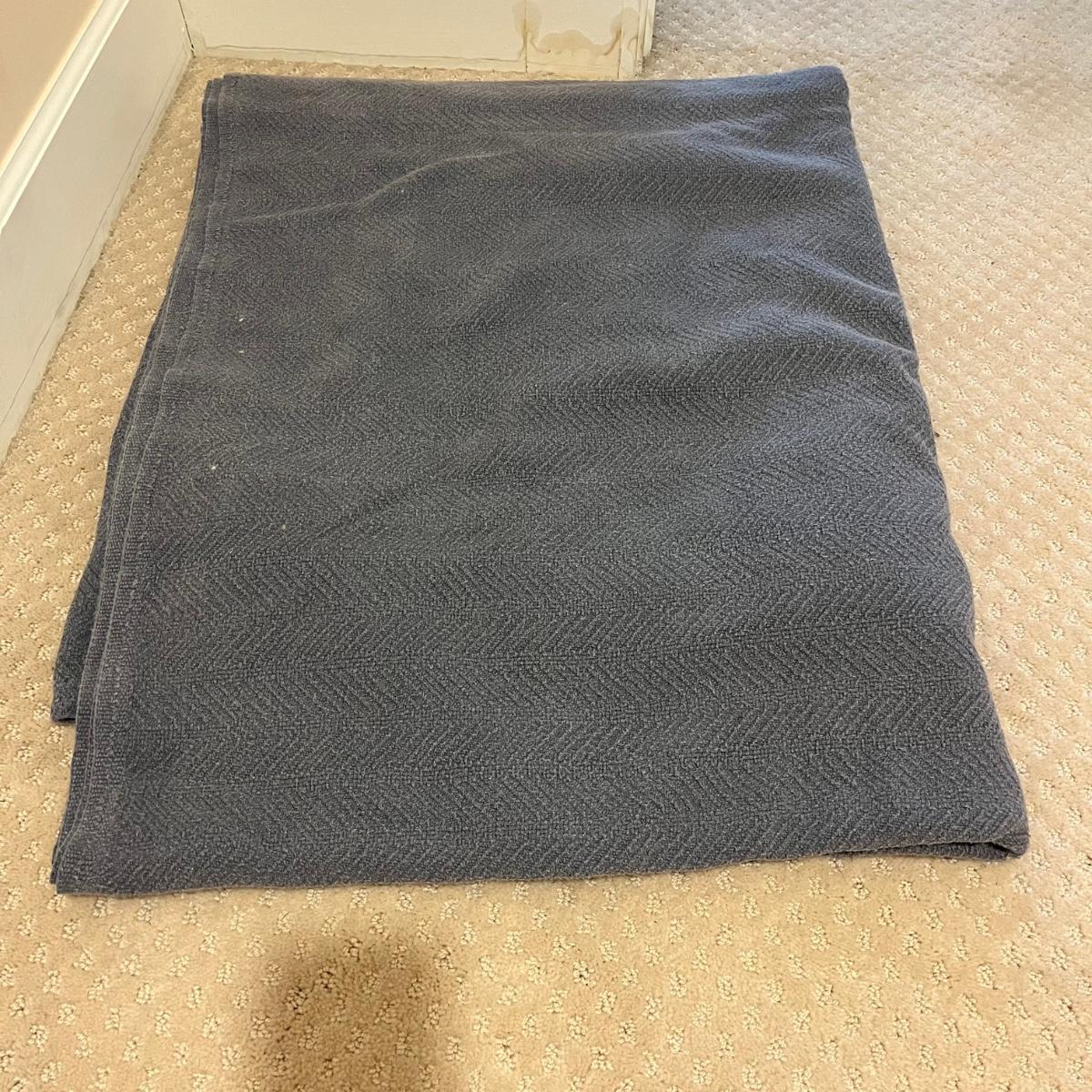 Lot includes a Pepperell blanket, striped comforter that measures 82” x 96”, two king shams, reversible blanket and four blankets.